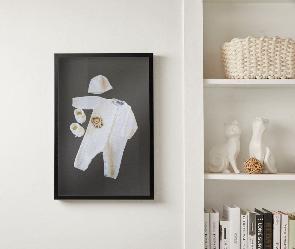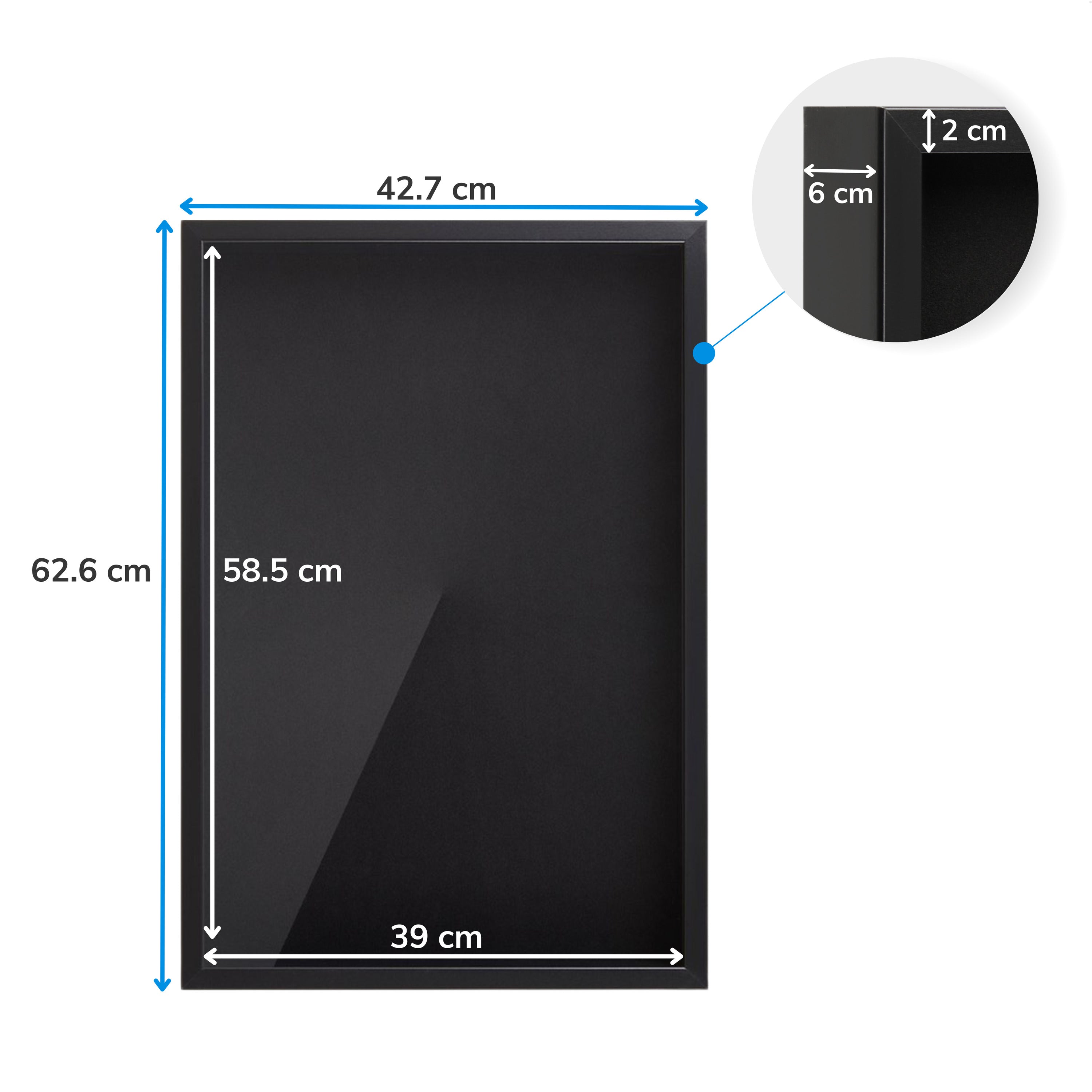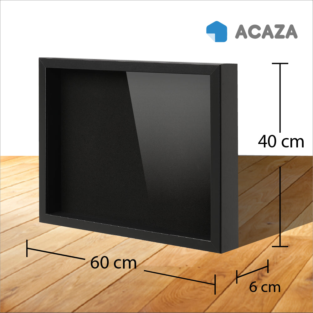 Dankzij deze diepe 3D lijst van ACAZA kan je je favoriete objecten een plaatsje aan de muur geven.Met een diepte van 3.5 cm geeft deze fotolijst verschillende opties om objecten en herinneringen in tentoon te spreiden, zoals bijvoorbeeld een bruidsboeket, een rompertje van een baby, medailles, opgezette dieren, een knutselwerkje,... De achterkant waarop je jouw objecten kan bevestigen is gemaakt van verhard schuim waarop een zwarte vilten laag is bevestigd. Op die manier kan je met prikkers jouw objecten vastpinnen in de lijst.De fotolijst is aan de achterkant voorzien van hangers waarmee je ze zowel horizontaal als verticaal tegen de muur kan bevestigen.Een echt hebbeding voor de creatieveling!Eigenschappen:Merk : ACAZAMateriaal: frame in MDF hout, plexiglas, metalen bevestigingsclipsKleur: ZwartAfmetingen: 40x60cmDiepte binnenmaat: 3.5 cmDiepte buitenmaat kader: 6 cmLevering:1x fotokader5x prikbord pinnen om jouw objecten te bevestigen in de fotolijst