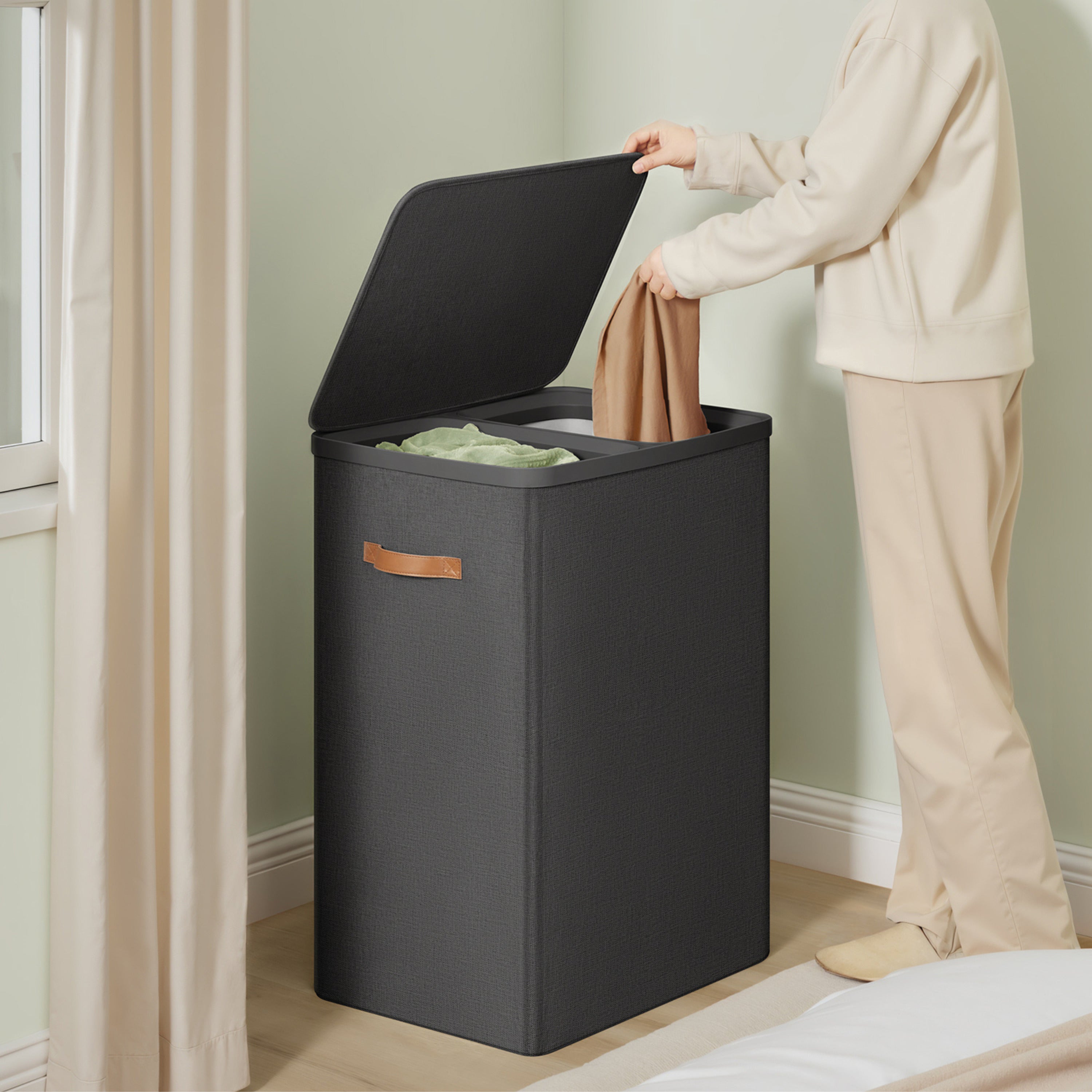 ACAZA Wasmand Met Deksel - 2 Vakken - 170 L - 56 x 40 x 75 cm - Donkergrijs