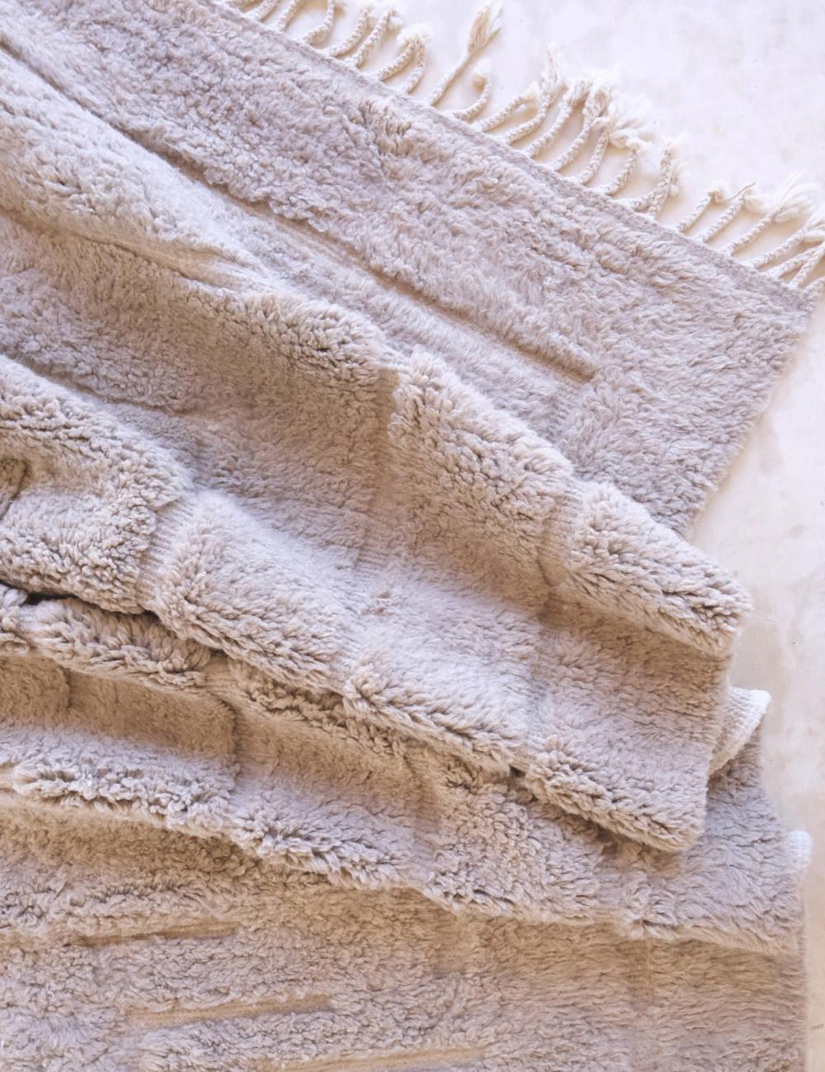 Elk tapijt wordt gemaakt door de vrouwen van de Berberstammen, volgens een voorouderlijke kennis die van generatie op generatie is doorgegeven. Het gebruikte grondstof is natuurlijke wol van een soort schapen die bekend staan om hun kleine formaat en hoge weerstand.