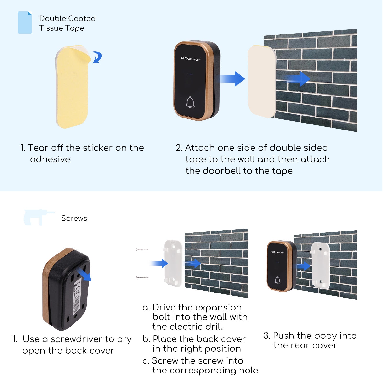 Deze draadloze deurbel is eenvoudig in te stellen en te gebruiken, u hoeft alleen maar de ontvanger in een stopcontact te steken en de zenderbox buiten te installeren met de meegeleverde 3M dubbelzijdige tape. Installatie in 3 minuten gedaan!
