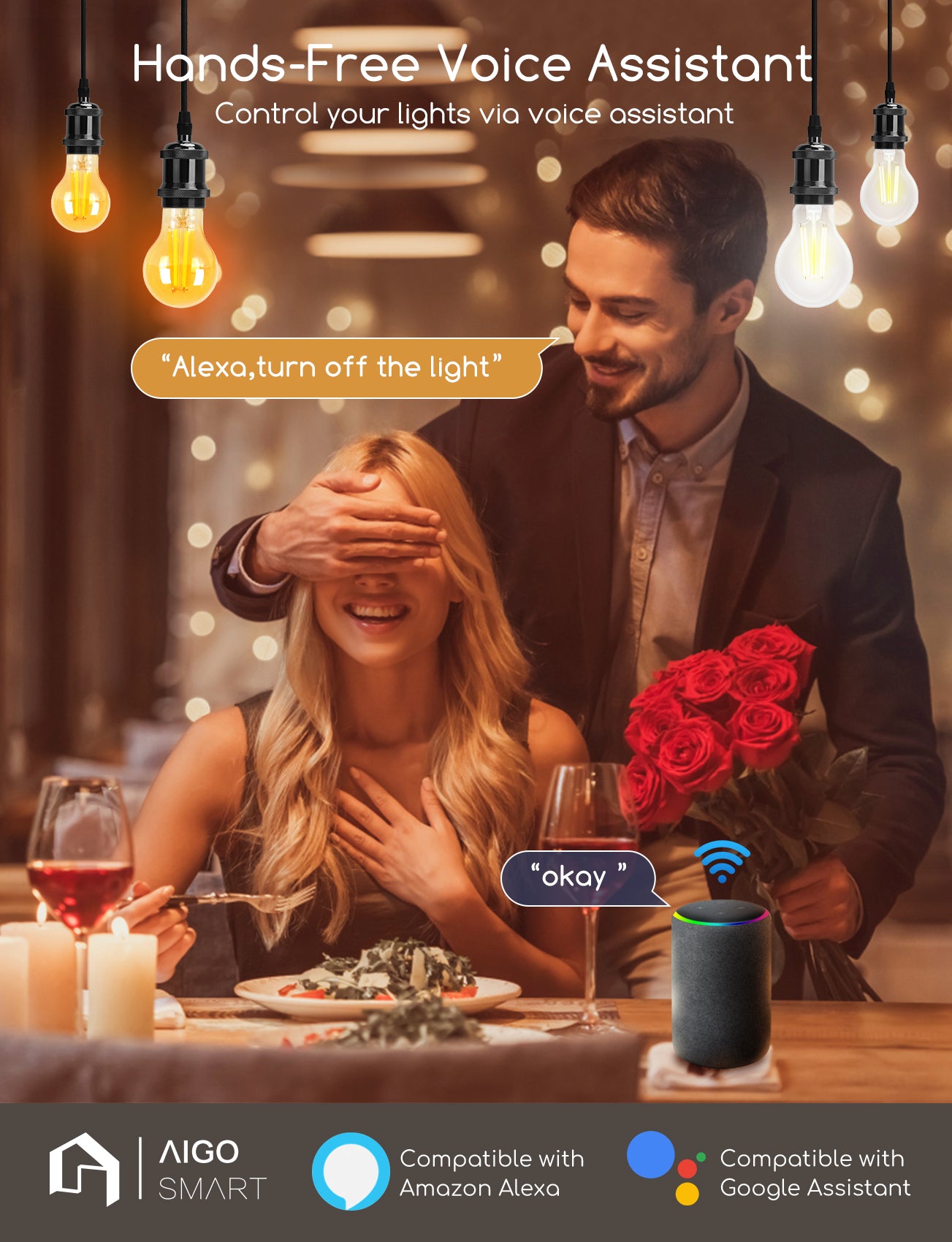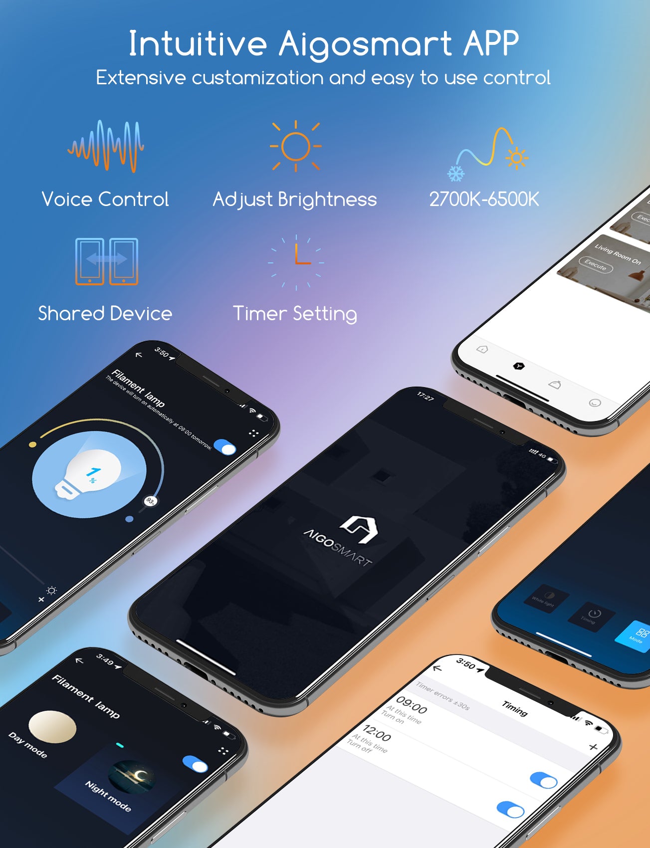 Download gewoon de gratis "Aigosmart"-app, sluit de slimme lamp aan op je 2.4GHz WiFi en je kunt deze overal bedienen (WiFi + Bluetooth maakt koppelen eenvoudig en gemakkelijk). Bovendien is deze slimme lamp compatibel met Alexa en Google Assistant voor spraakbesturing (let op: niet compatibel met 5GHz Wi-Fi).
