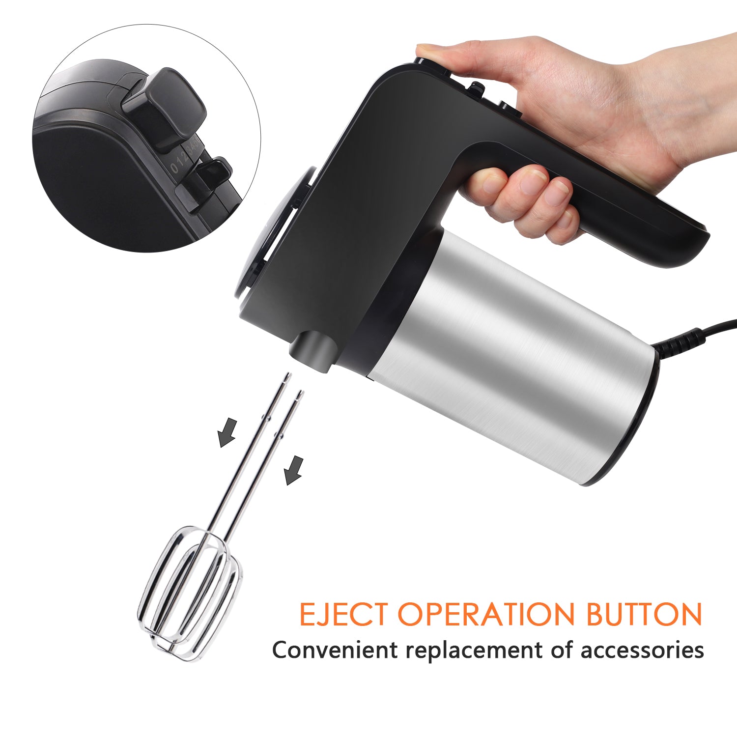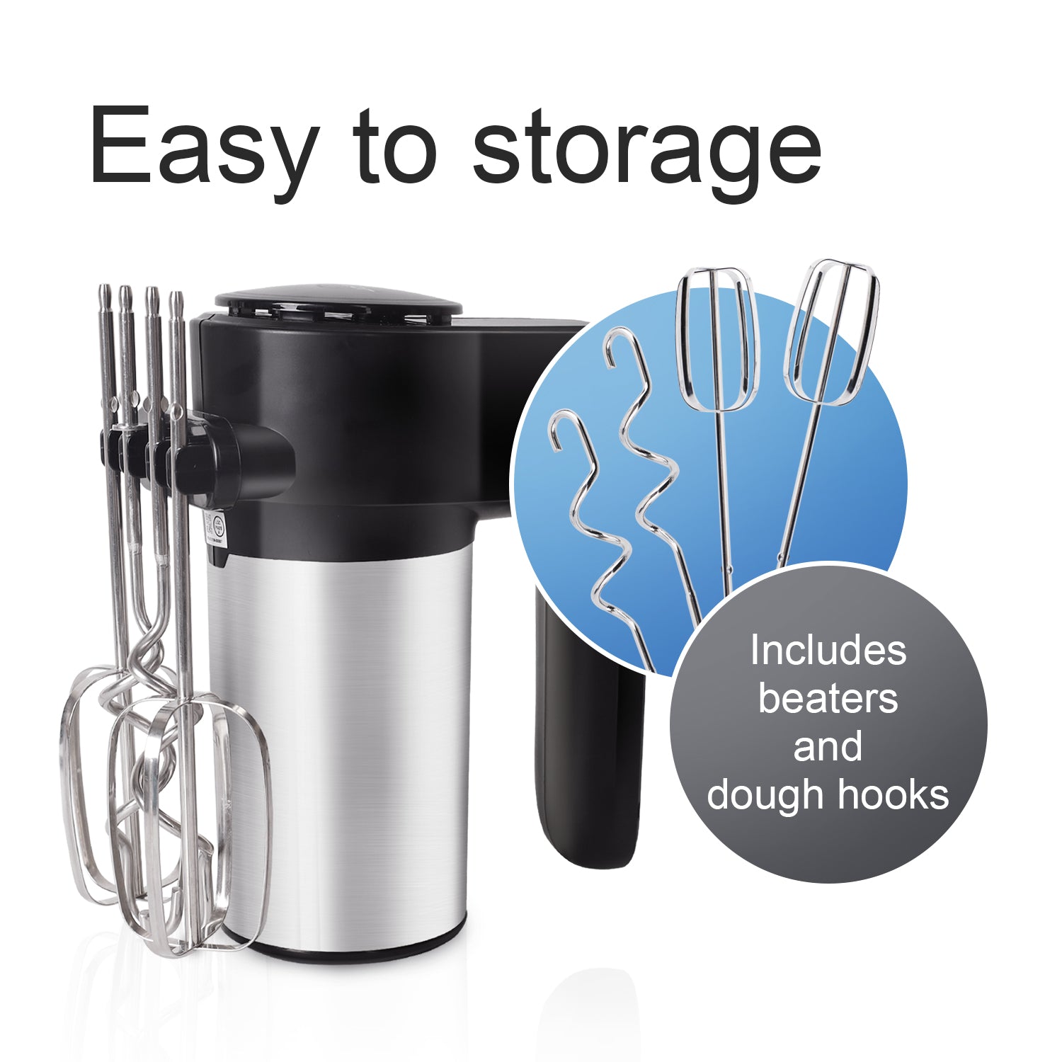 De Aigostar Hanson is een lichtgewichte handmixer voorzien van 2 gardes en 2 kneedhaken en 6 snelheidsstanden en een Turbo-knop. Met een krachtige vermogen van 300W is de mixer ideaal om slagroom te kloppen of beslag te bereiden. Bovendien beschikt deze handmixer over een apart opzetstuk om daar de kneedhaken en gardes aan te bevestigen als het apparaat niet wordt gebruikt.