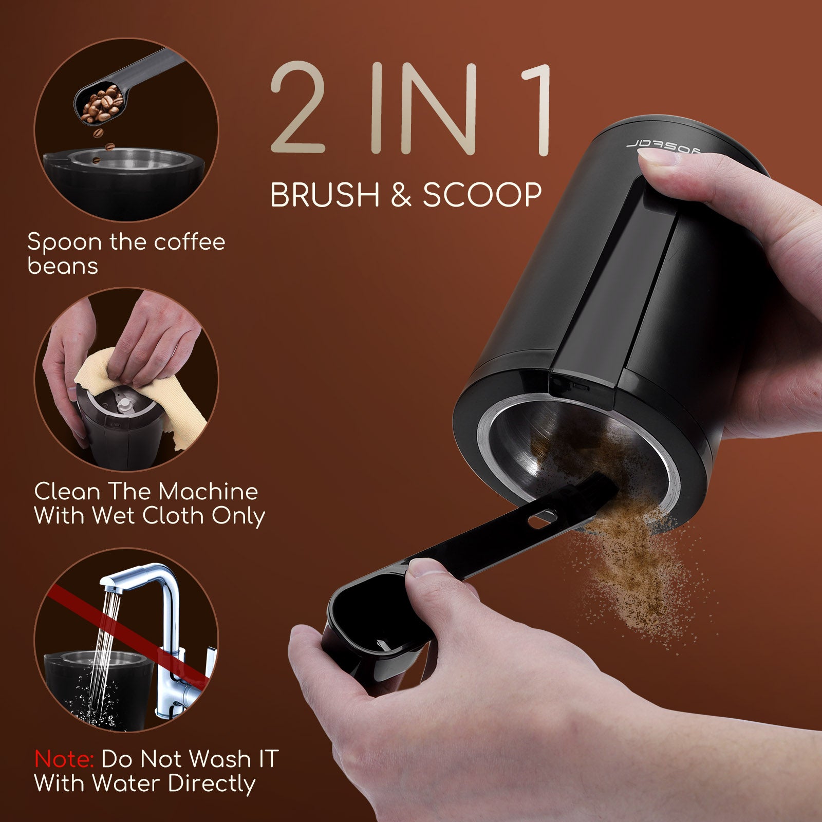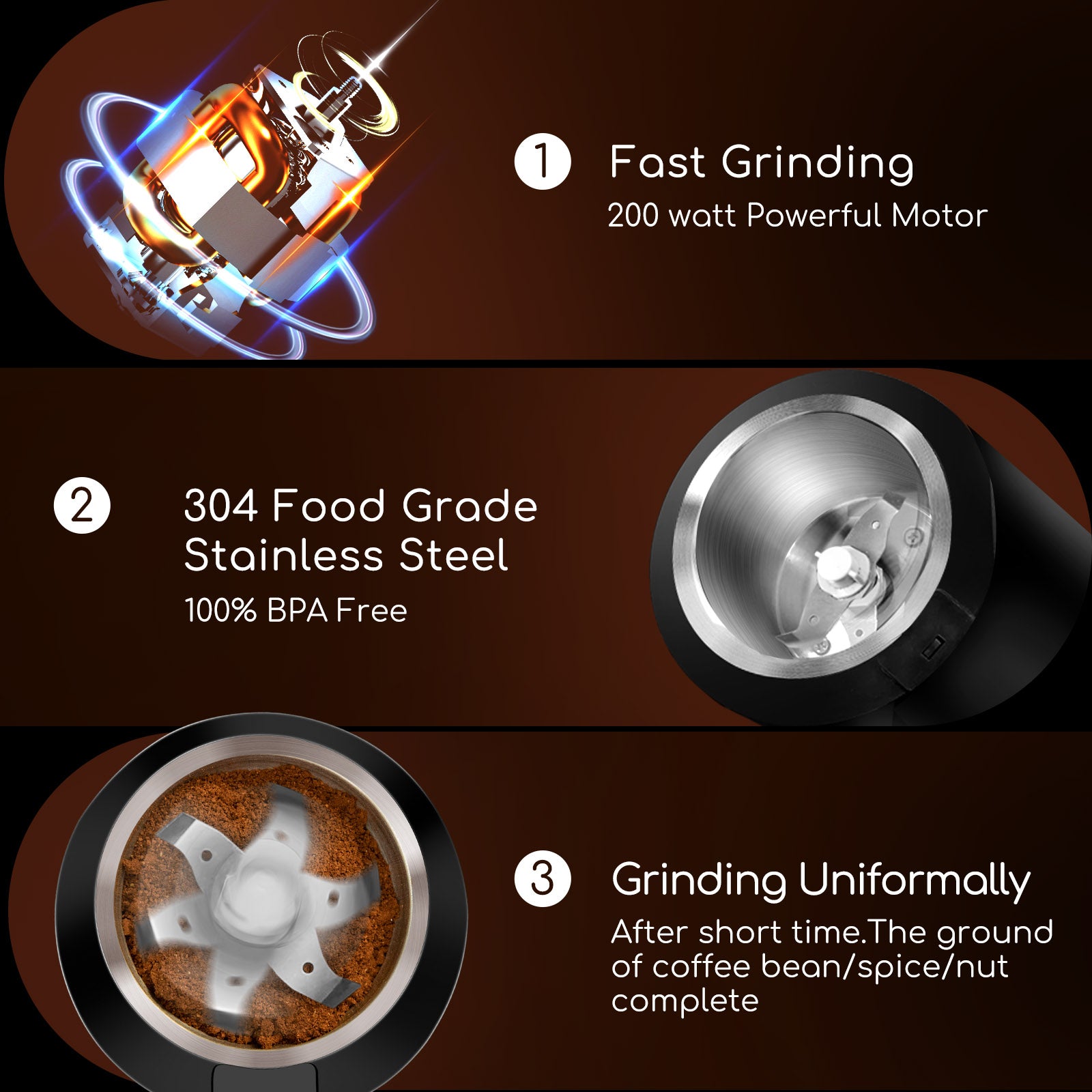Dankzij de krachtige 200 watt motor kun je een beker koffiebonen (tot 60 gram) met één druk op de knop, binnen 10 seconden malen. Door het transparante, afneembare deksel kun je het maalproces van de bonen controleren. De koffiemolen is gemaakt van hoogwaardig RVS.