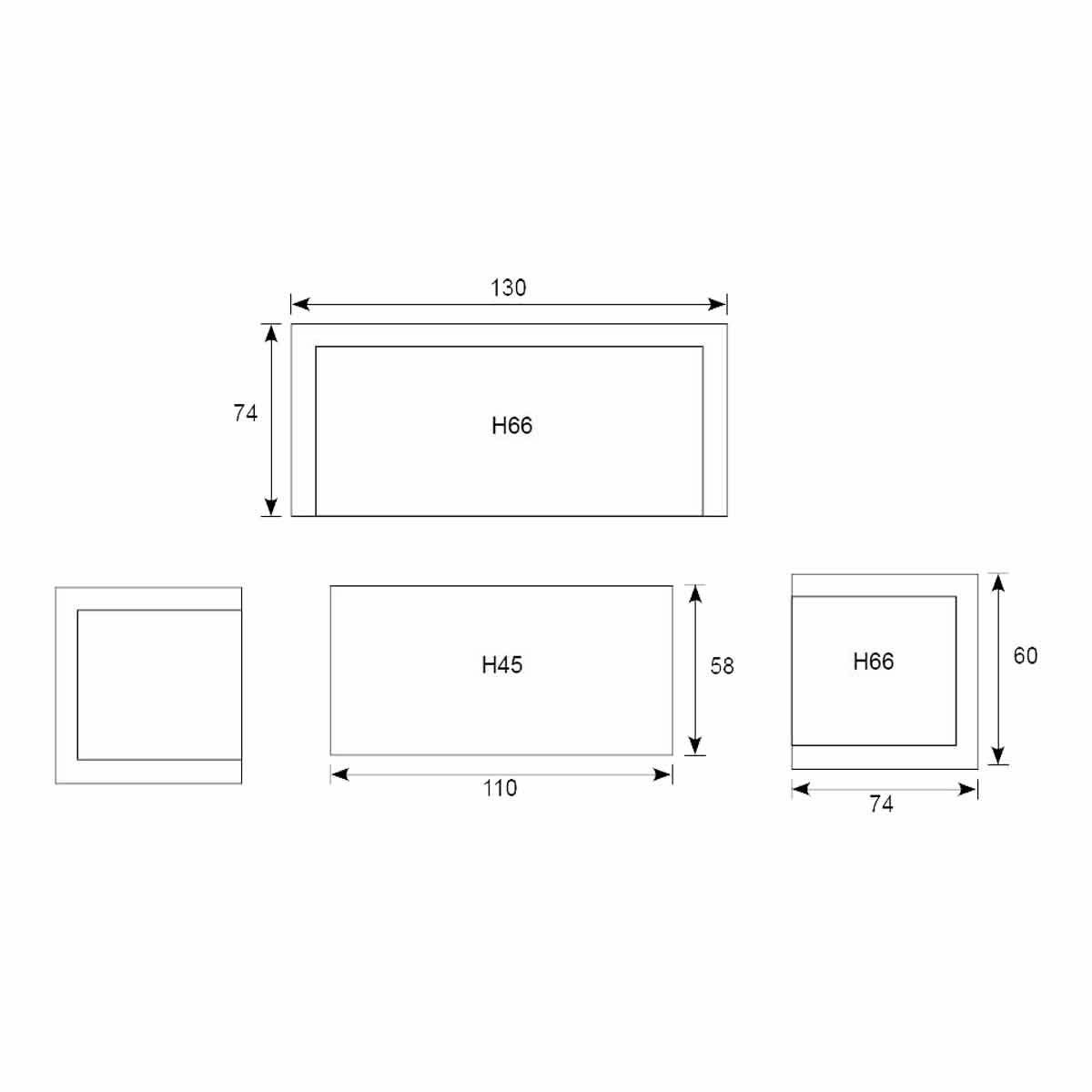 Afmetingen: - Tweezitsbank: 130 x 74 x H66 cm (zithoogte: 44 cm) - Fauteuils: 74 x 60 x H66 cm - Koffietafel: 110 x 58 x H45 cm