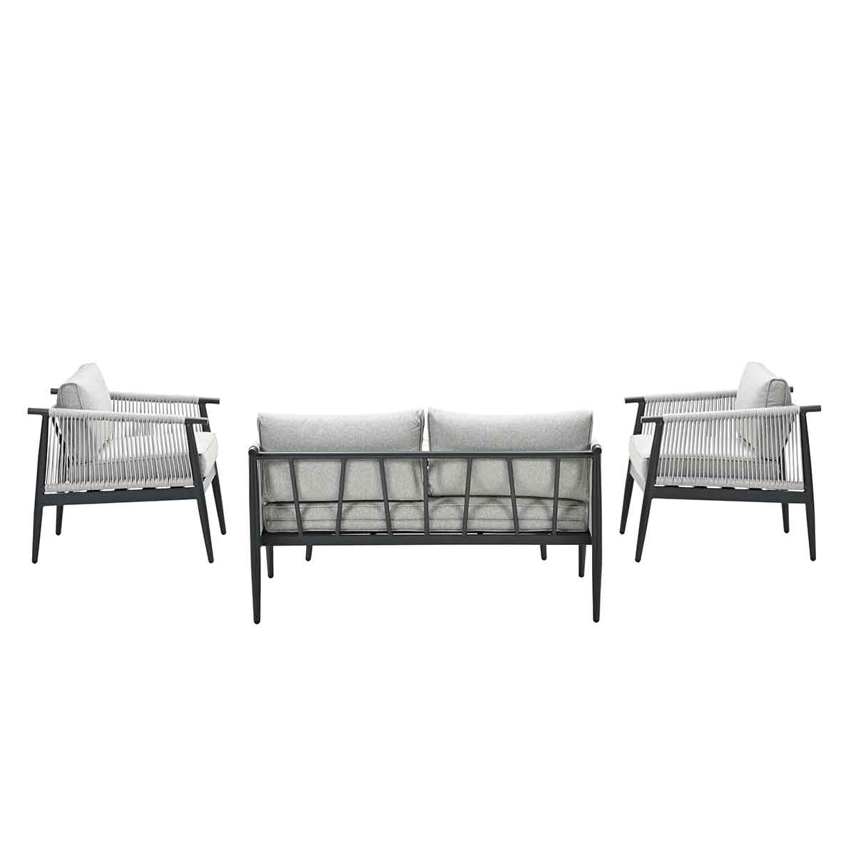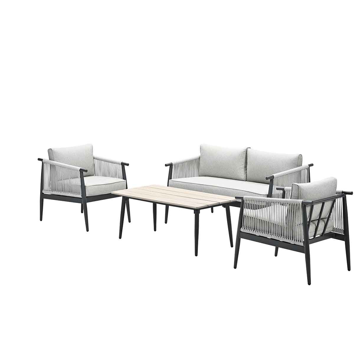 Deze set is opgebouwd uit stevig gepoedercoat aluminium, afgewerkt met elegant Qualicord rope in de armleuningen. Dit geeft de set niet alleen een luxe uitstraling, maar ook een ruimtelijk gevoel. De Aloha loungeset bestaat uit een comfortabele tweezitsbank, twee fauteuils en een stijlvolle koffietafel. Het tafelblad is gemaakt van Vironwood, een duurzaam kunststof dat de natuurlijke uitstraling van echt hout perfect nabootst.