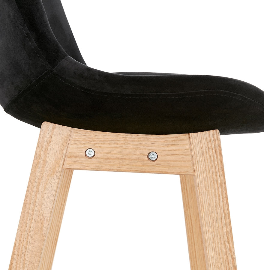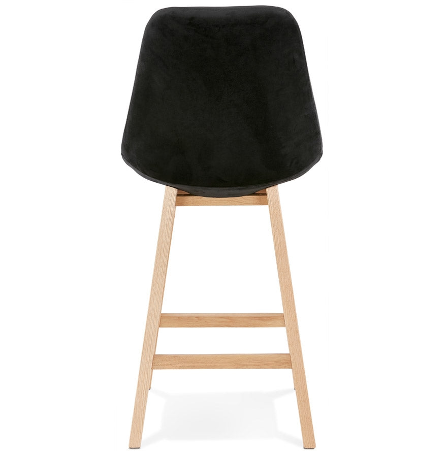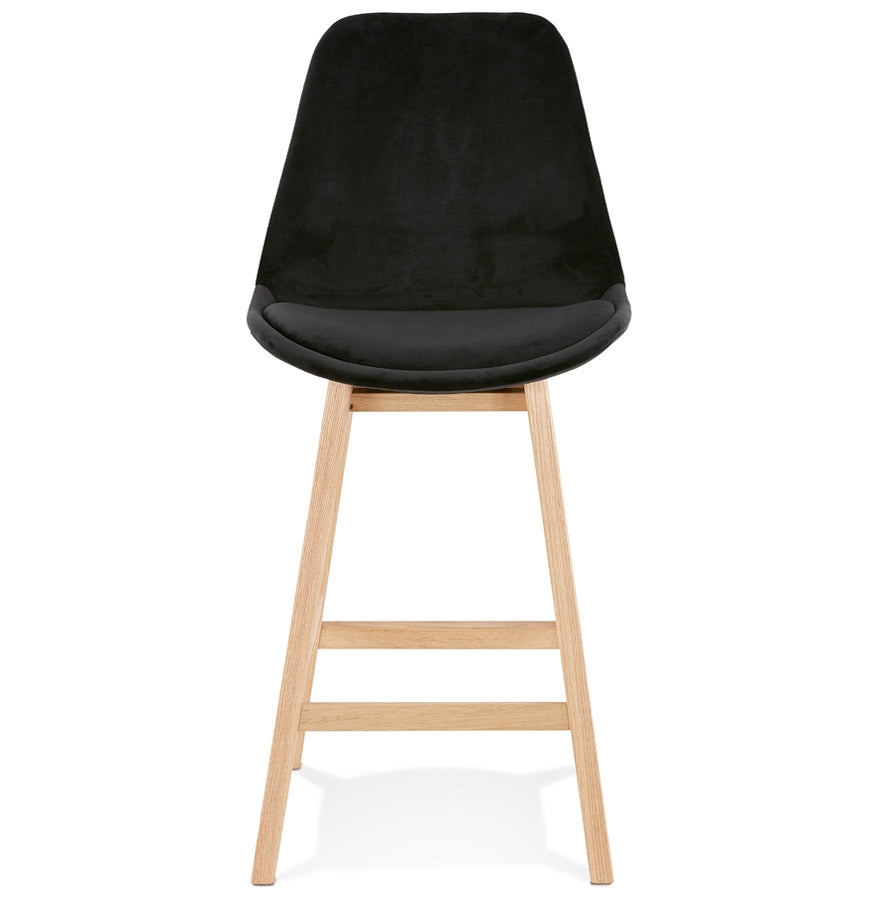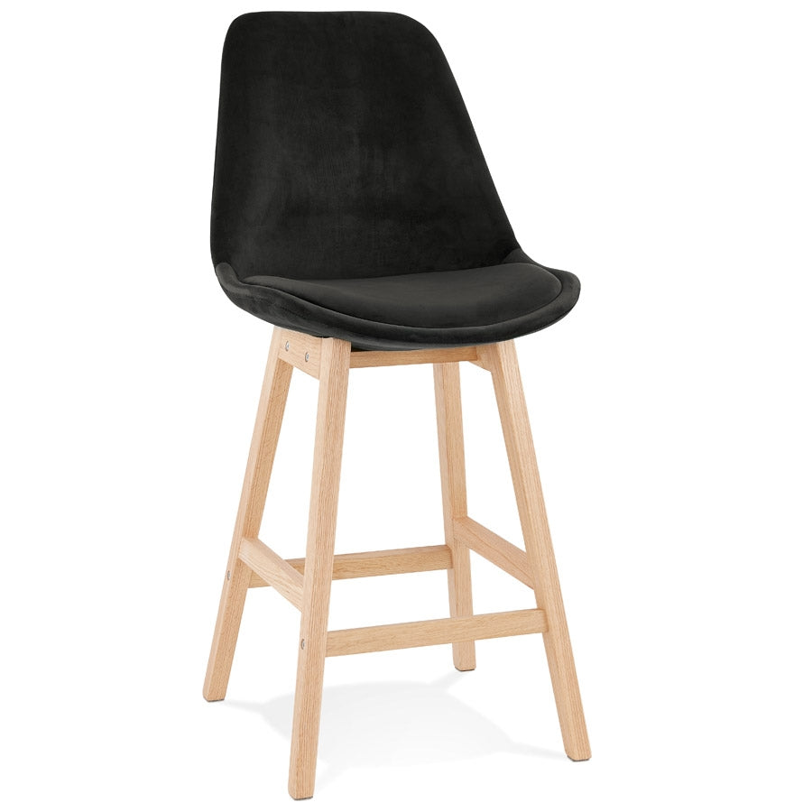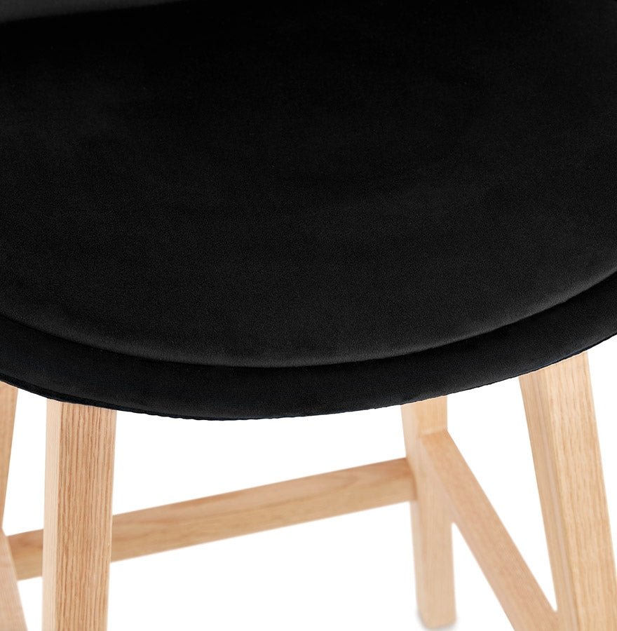Een zwart fluwelen snackkrukje dat zowel funky als functioneel is. Deze halfhoge kruk is voorzien van naturelkleurige eikenhouten poten.