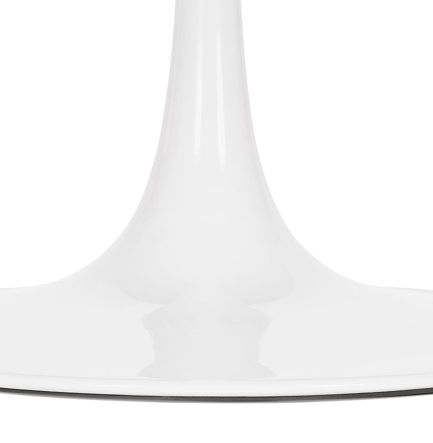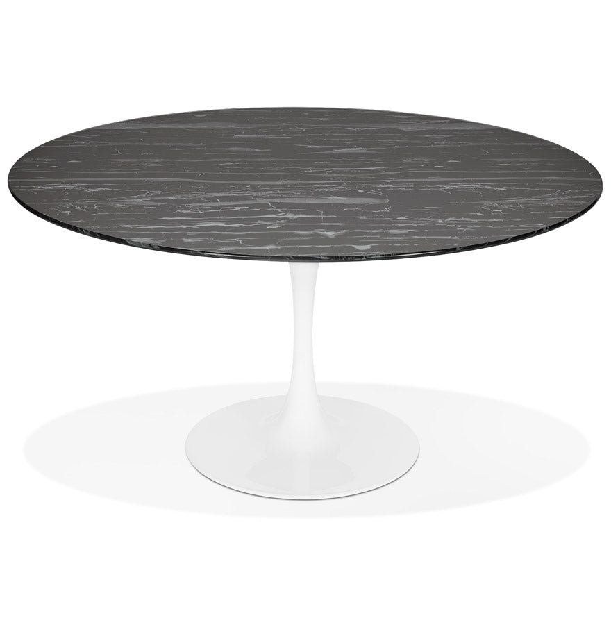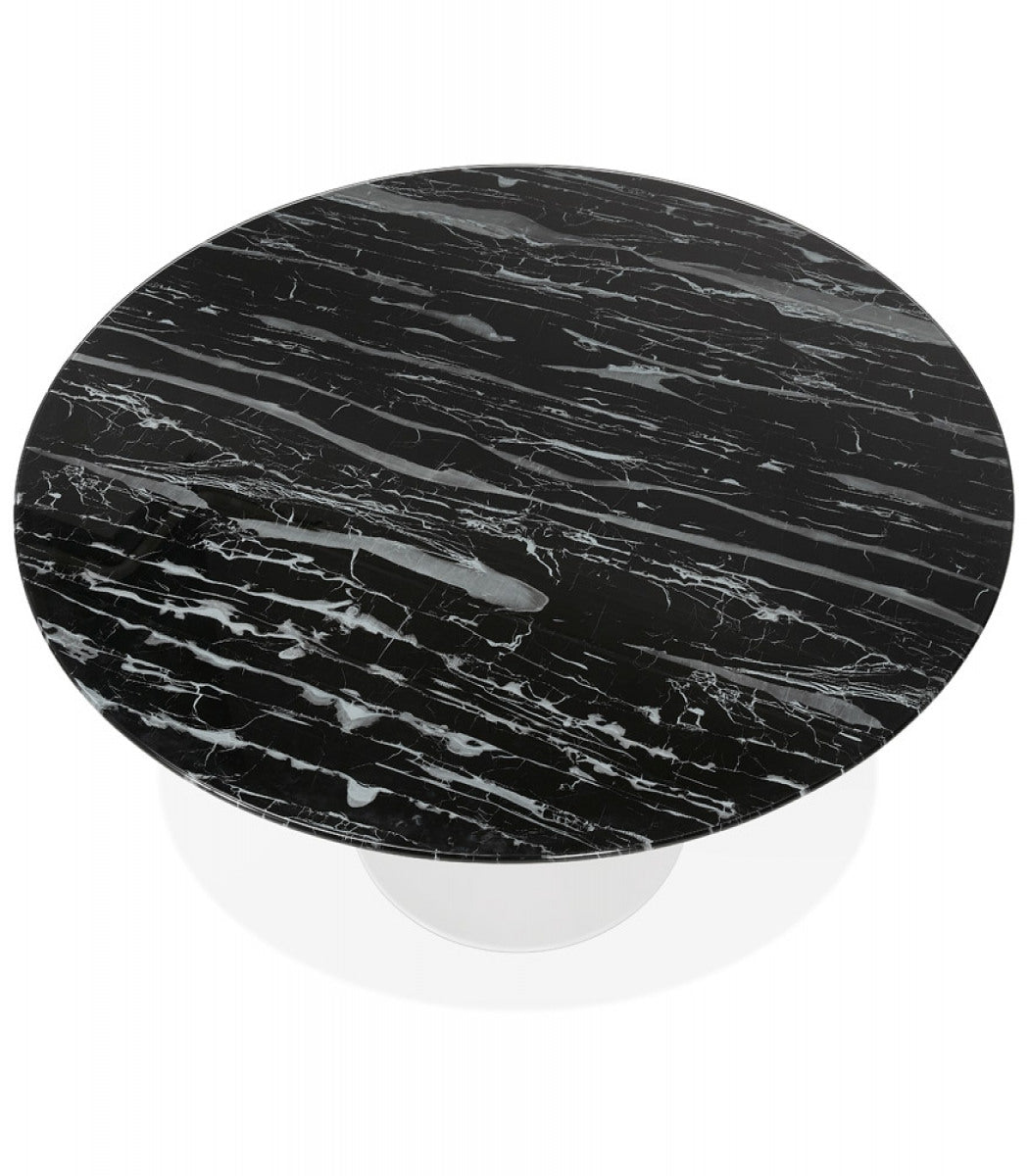 Ronde eettafel bestaande uit een glazen blad met zwart marmereffect en een centrale witmetalen poot.