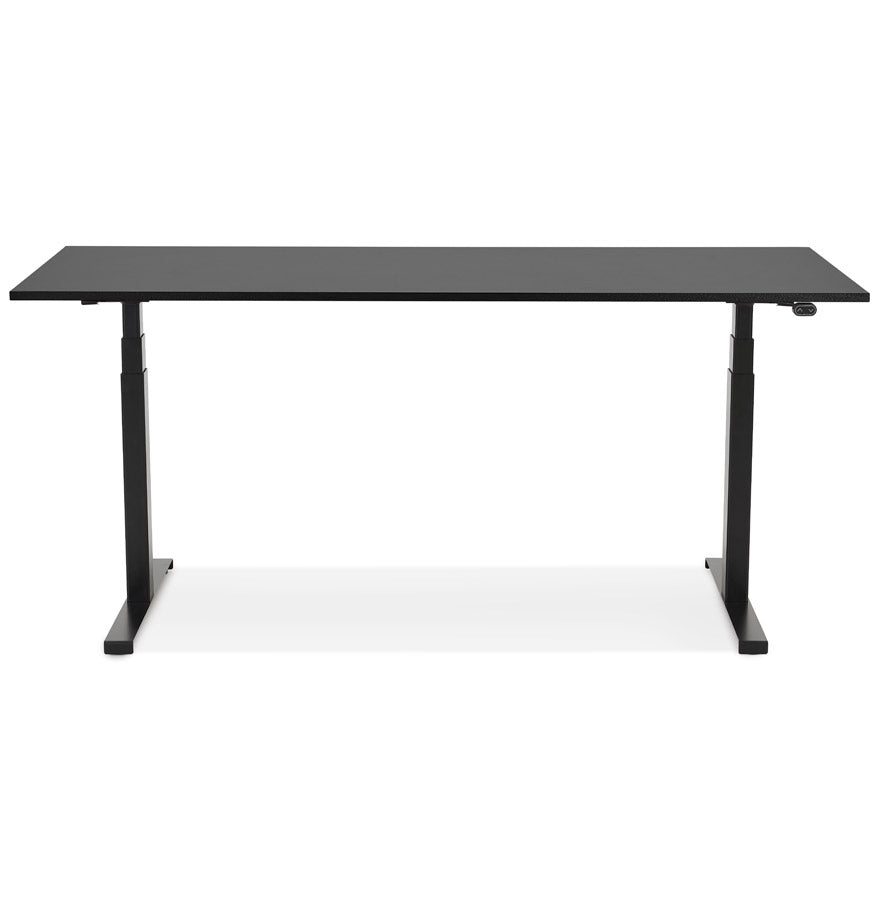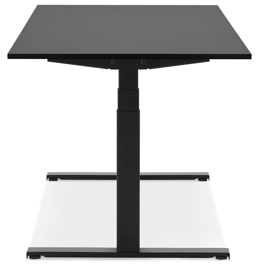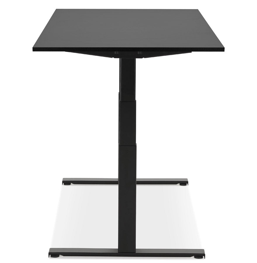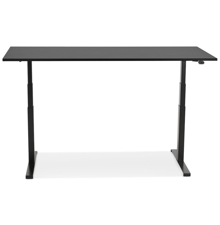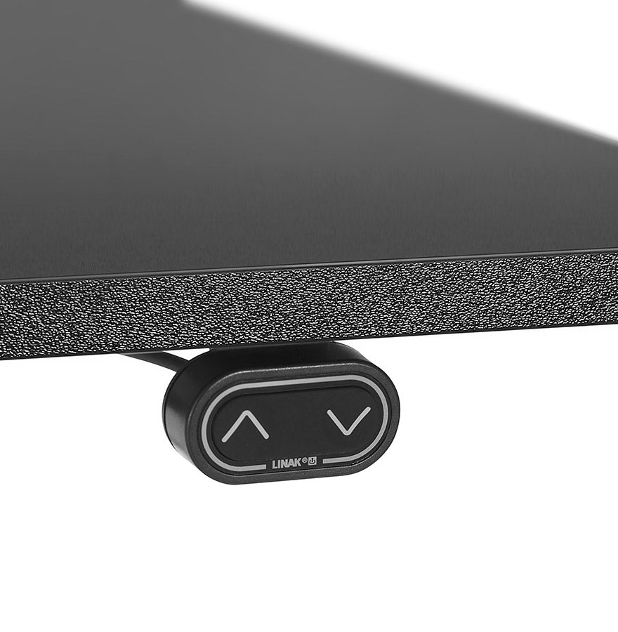 Groot zwart gemotoriseerd bureau: de hoogteverstelling gebeurt elektronisch via een digitaal kastje dat onder het bureau is geplaatst.