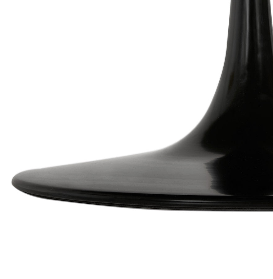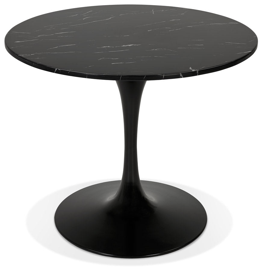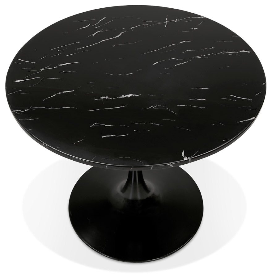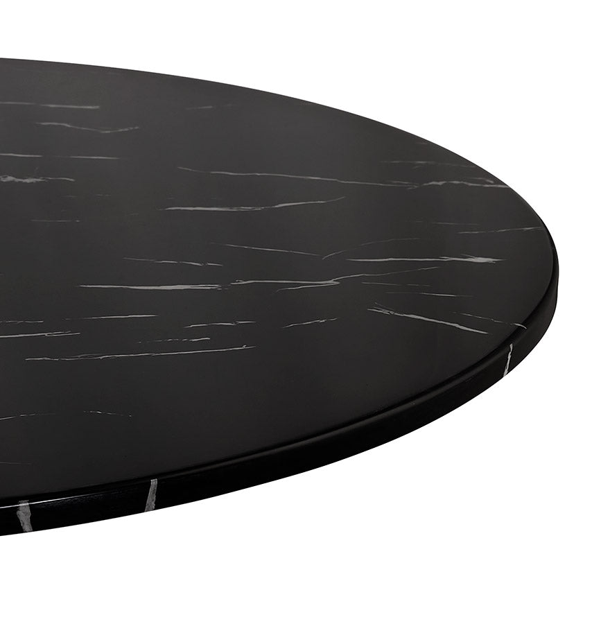Ronde keukentafel in steen met zwart marmereffect in een stijl die zowel modern als retro is.