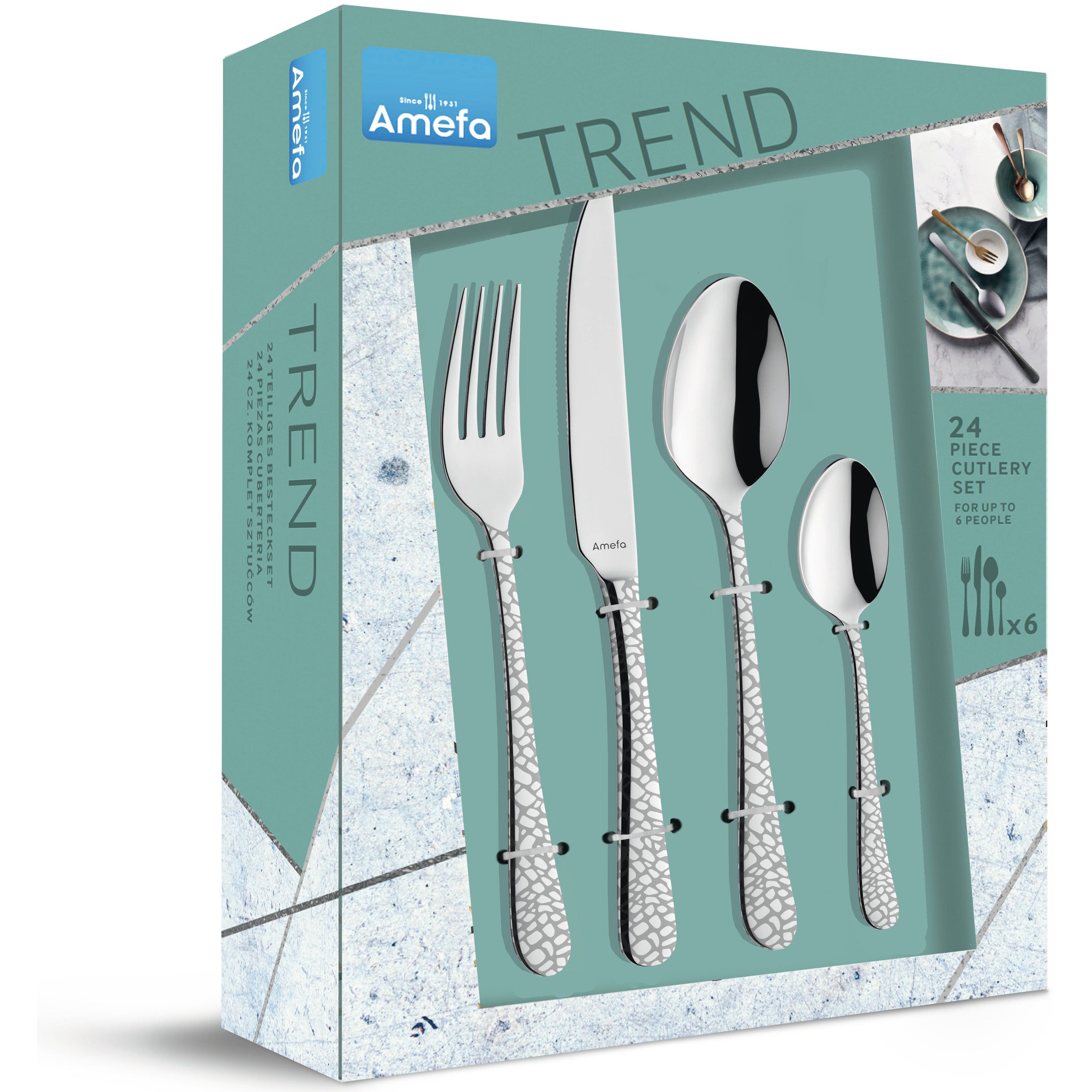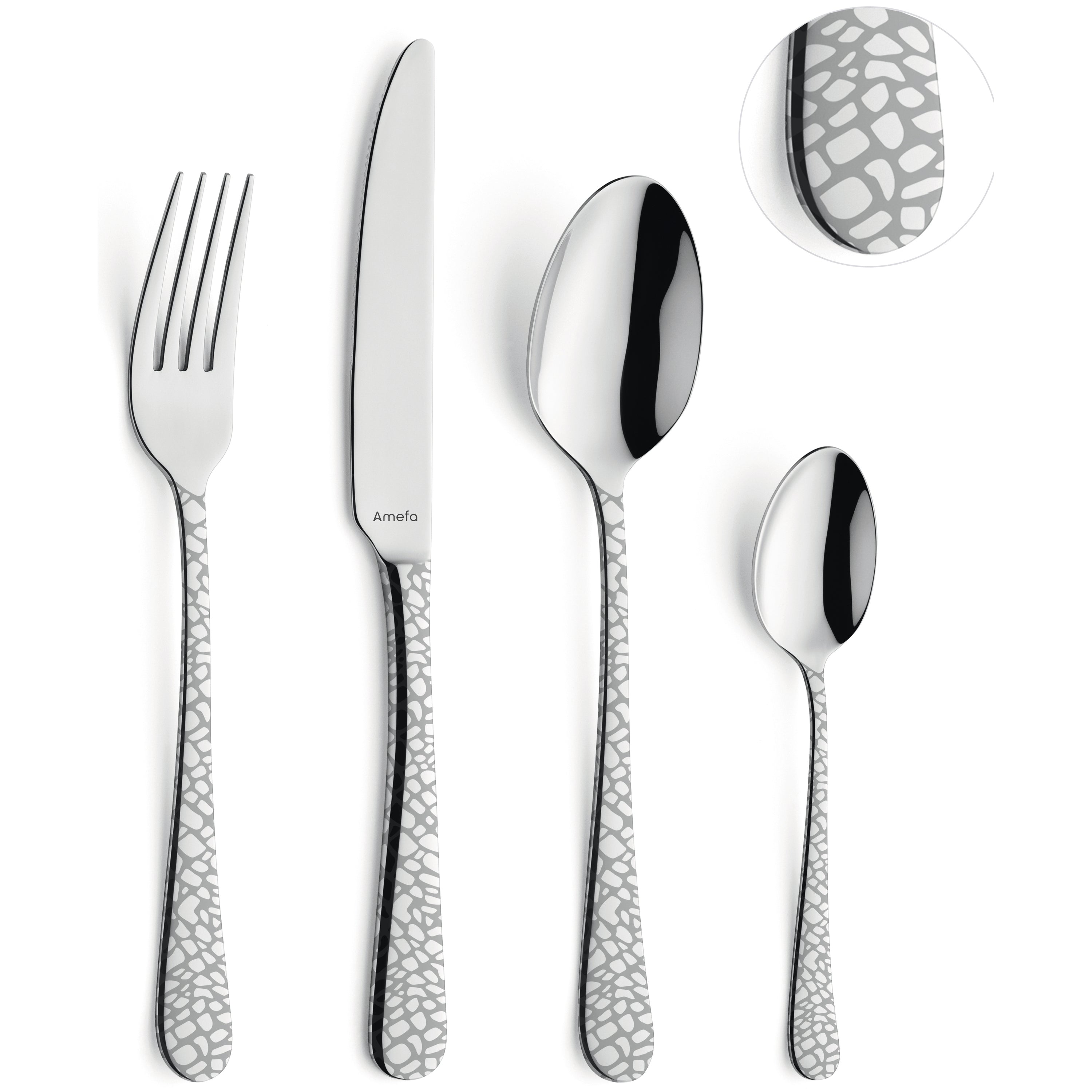 Het aanbod van Amefa bestaat uit een breed scala aan bestek modellen en bijbehorende producten. Je kunt dus bij elke gelegenheid de perfecte sfeer creëren! Of het nu gaat om een ontbijt met de familie, een lunch met vrienden of een feestelijke barbeque. De steenvormige print van de Austin Cobble bestekset is geïnspireerd door de stenen aan de kustlijn van de zee, en past door de sierlijke uitstraling bij elk eetmoment.