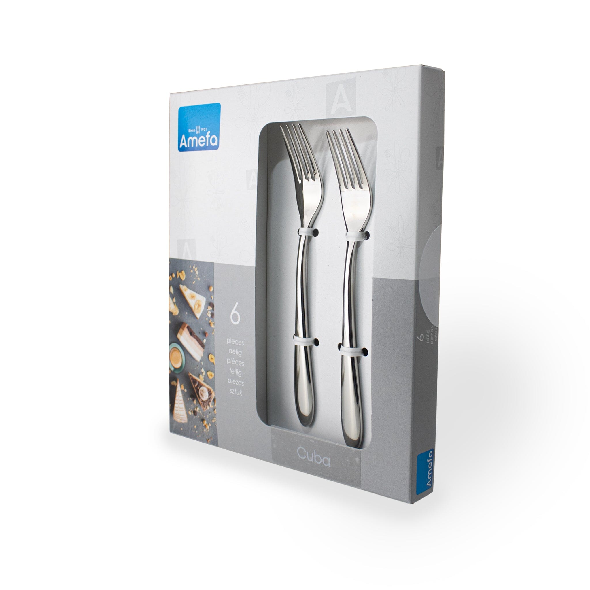 De Amefa Cuba is een gesmeed model met een sierlijke en stijlvolle vorm en uitstraling. Het model Cuba geeft je etentje net dat extra beetje allure. Het bestek heeft een hoogglans afwerking en wordt geleverd in een mooie cadeau verpakking Dit product bestaat uit de volgende onderdelen: - 6 gebaksvorkjes in cadeauverpakking De lengte van de koffielepel is 13,5 cm