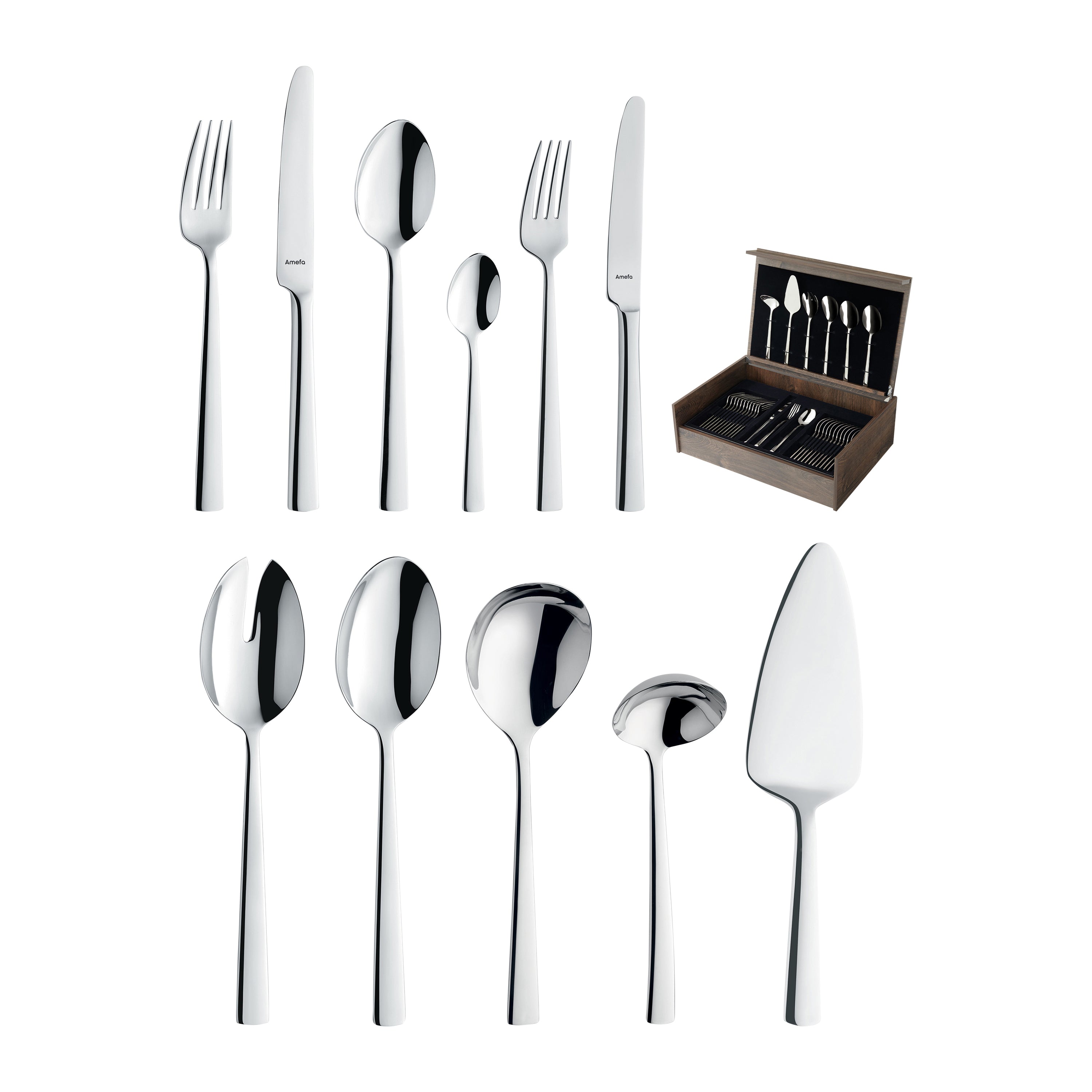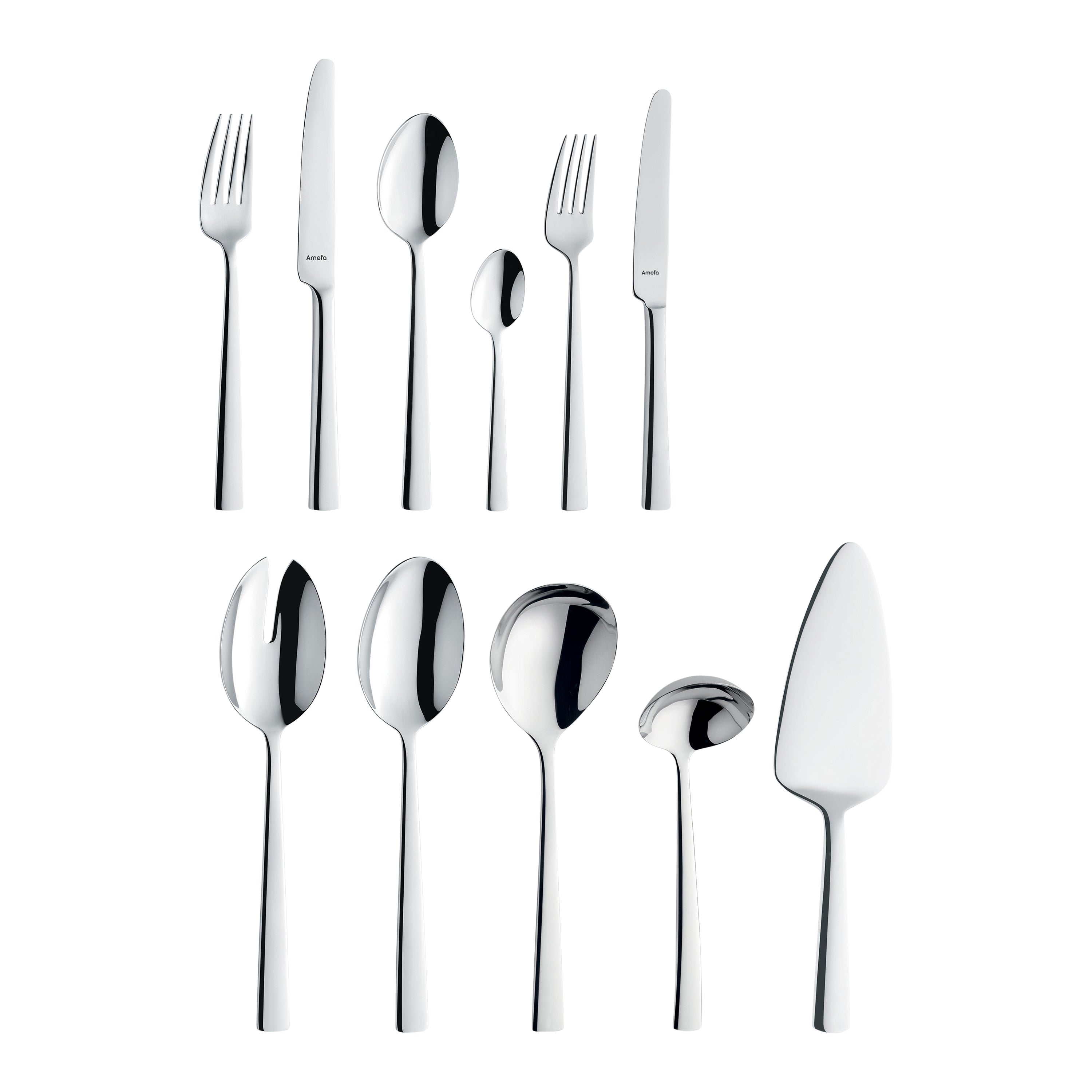 • 12 tafelmessen • 12 tafelvorken • 12 tafellepels • 12 dessertmessen • 12 dessertvorken • 12 koffielepels • 1 sauslepel • 1 taartschep • 2 opscheplepels • 1 saladecouvert bestaande uit een saladevork en een saladelepel