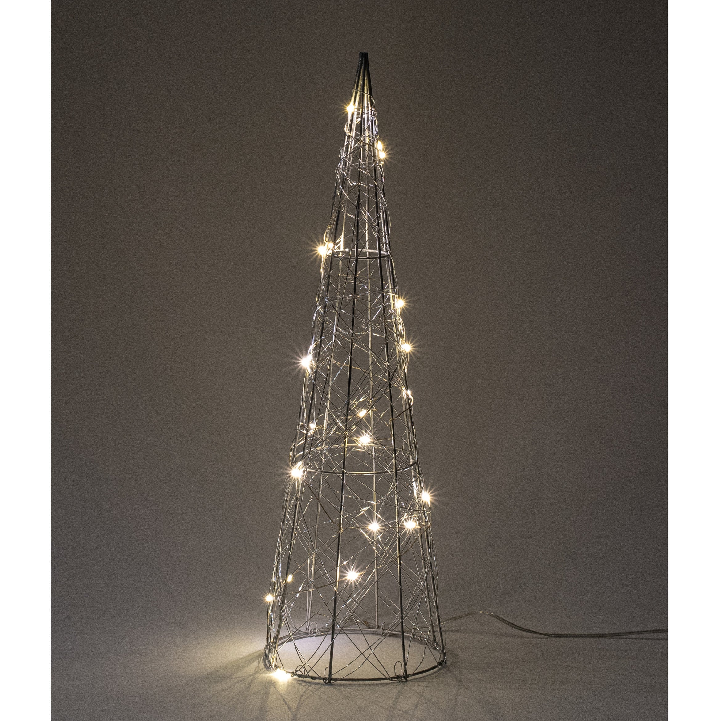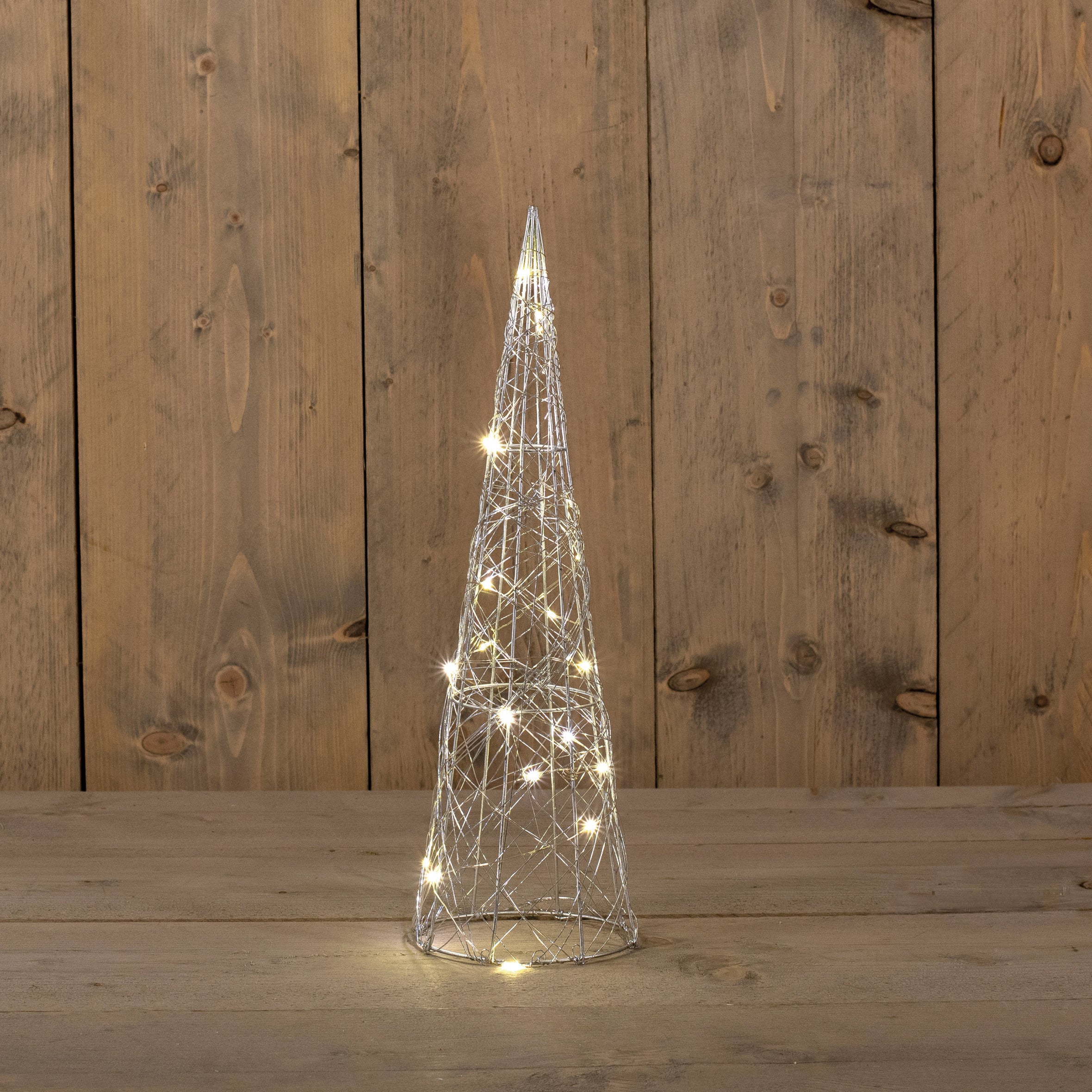 Kerstverlichting figuren Led kegel/piramide kerstboom lamp op batterijen. Met zijn zilveren afwerking en 20 warm witte LED lampjes brengt deze kegel lamp een feestelijke sfeer in huis. De kegelvormige lamp, staand met een hoogte van 40 cm, voegt een stijlvolle touch toe aan je kerstdecor. Met de handige 6/18 uur timerfunctie hoef je je geen zorgen te maken over het aan- en uitzetten. Gemaakt van metaal, is deze lamp een perfecte toevoeging aan je feestelijke inrichting. Voeding: 3 AA batterijen (niet inbegrepen). Kerstversiering verlichte kegels/kegelbomen/kegelkerstboom.