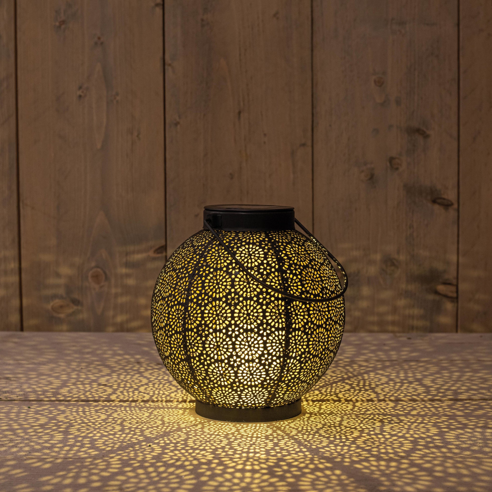 Solar lantaarn tuinverlichting met cirkel patroon. De verlichting werkt op zonne-energie waardoor het zichzelf oplaadt gedurende de dag. U kunt de lantaarn neerzetten of ophangen aan het metalen handvat voor een gezellige sfeer in de tuin, bijvoorbeeld op tafel of aan houders voor hangplanten. Formaat: 18 x 18 x 19 cm. Kleur licht: warm wit. Kleur lamp: zwart. Materiaal: metaal.