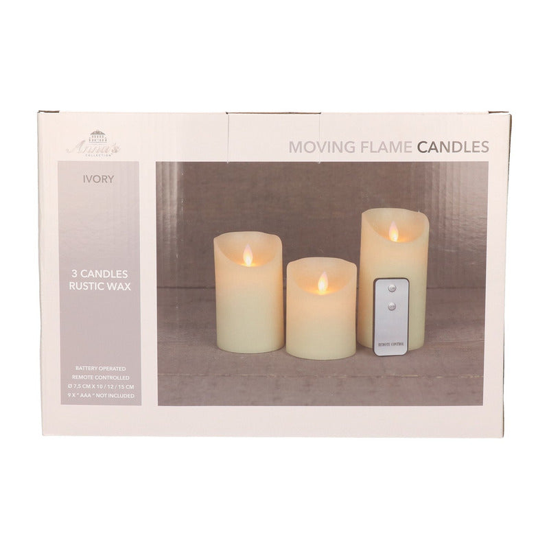 Kaarsen set van 3x stuks LED stompkaarsen in de kleur ivoor. Deze set van rustieke LED stompkaarsen zijn gemaakt van echt wax en hebben een bewegende vlam, waardoor ze nauwelijks te onderscheiden zijn van echte kaarsen. Ideaal voor een veilige en sfeervolle verlichting in elke kamer.