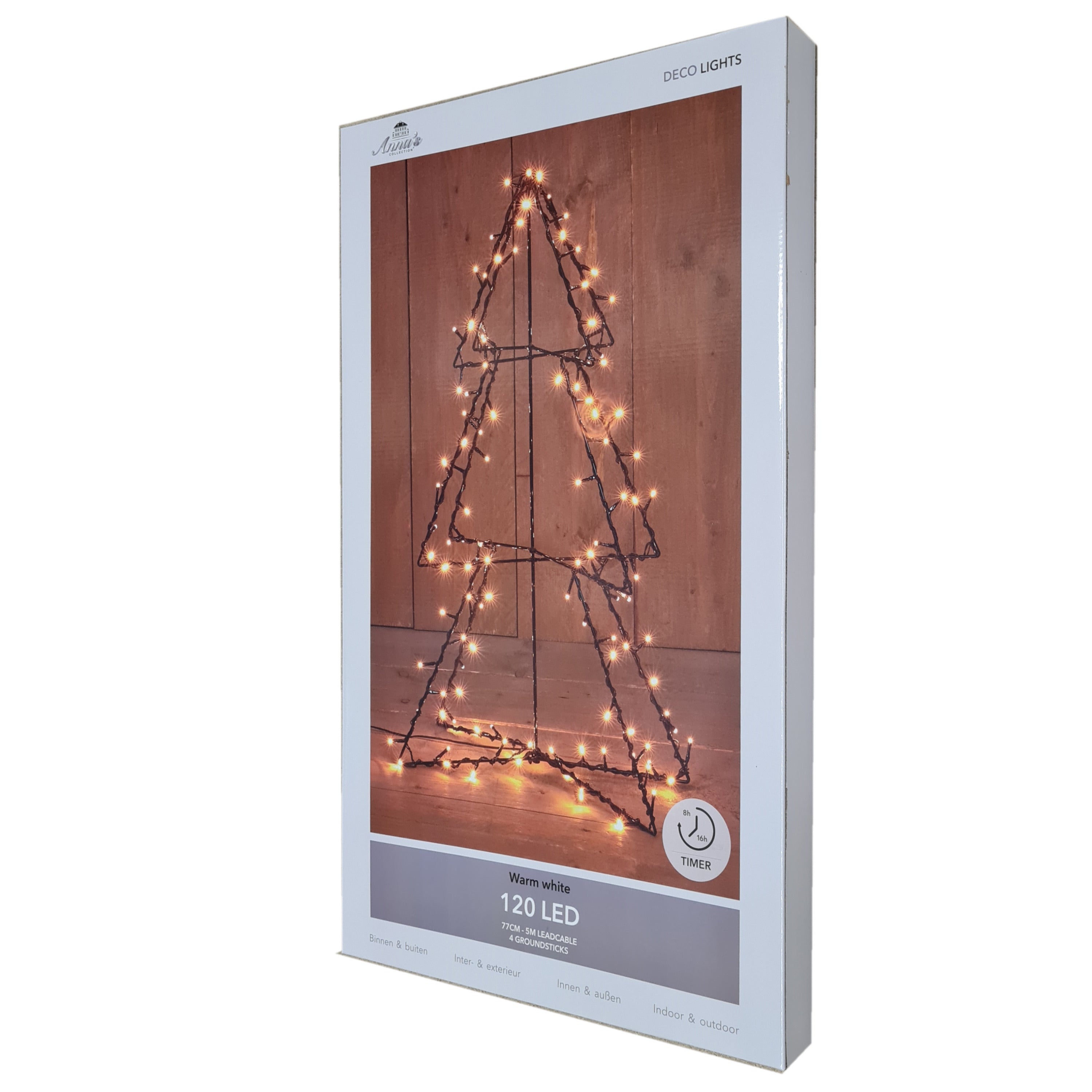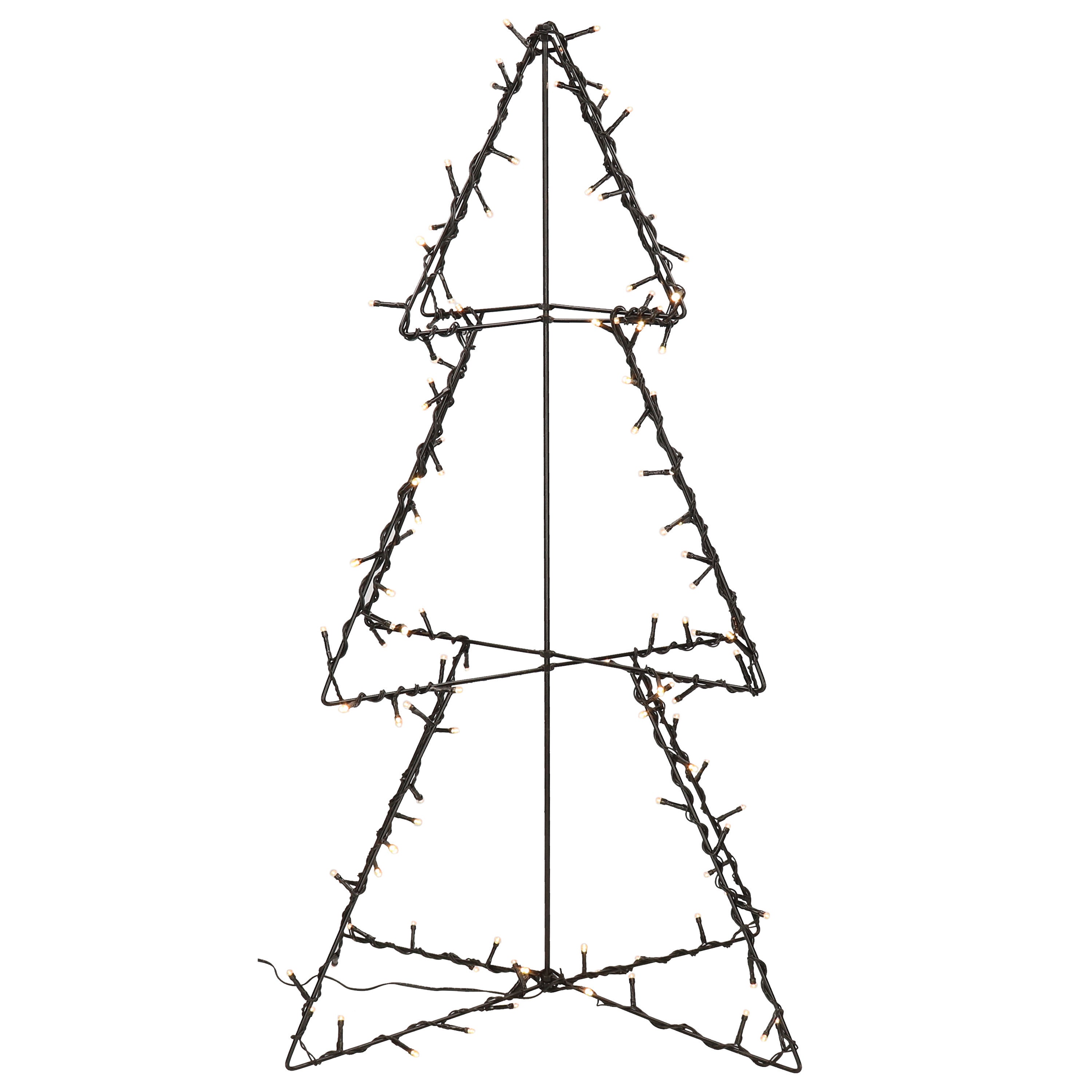 Verlichte 3D kerstboom van metaal. Breng een vleugje moderne kerstmagie in je buitenruimte met deze stijlvolle 3D metalen kerstboom. Met een hoogte van 77 cm en 120 warme witte LED-lampjes geeft deze verlichte boom een sfeervolle en feestelijke ambiance. De metalen constructie in zwarte kleur geeft een elegante en eigentijdse uitstraling, terwijl de IP44-klasse zorgt voor duurzaamheid en weerbestendigheid, waardoor het een perfecte keuze is voor buitengebruik. Het lange aanloopsnoer van 500 cm biedt flexibele plaatsingsmogelijkheden, en de handige 8/16-uurs timerfunctie zorgt voor probleemloze verlichting.