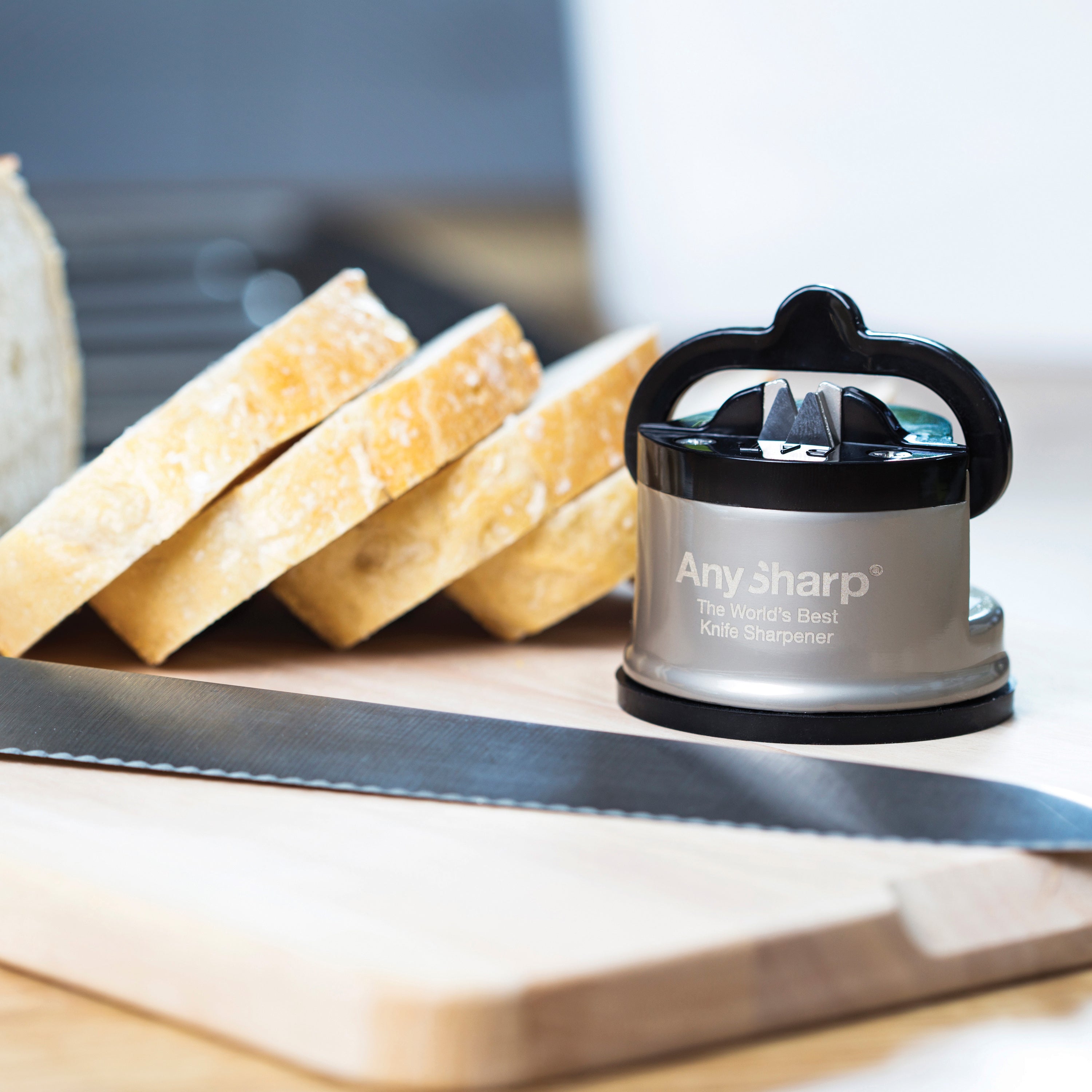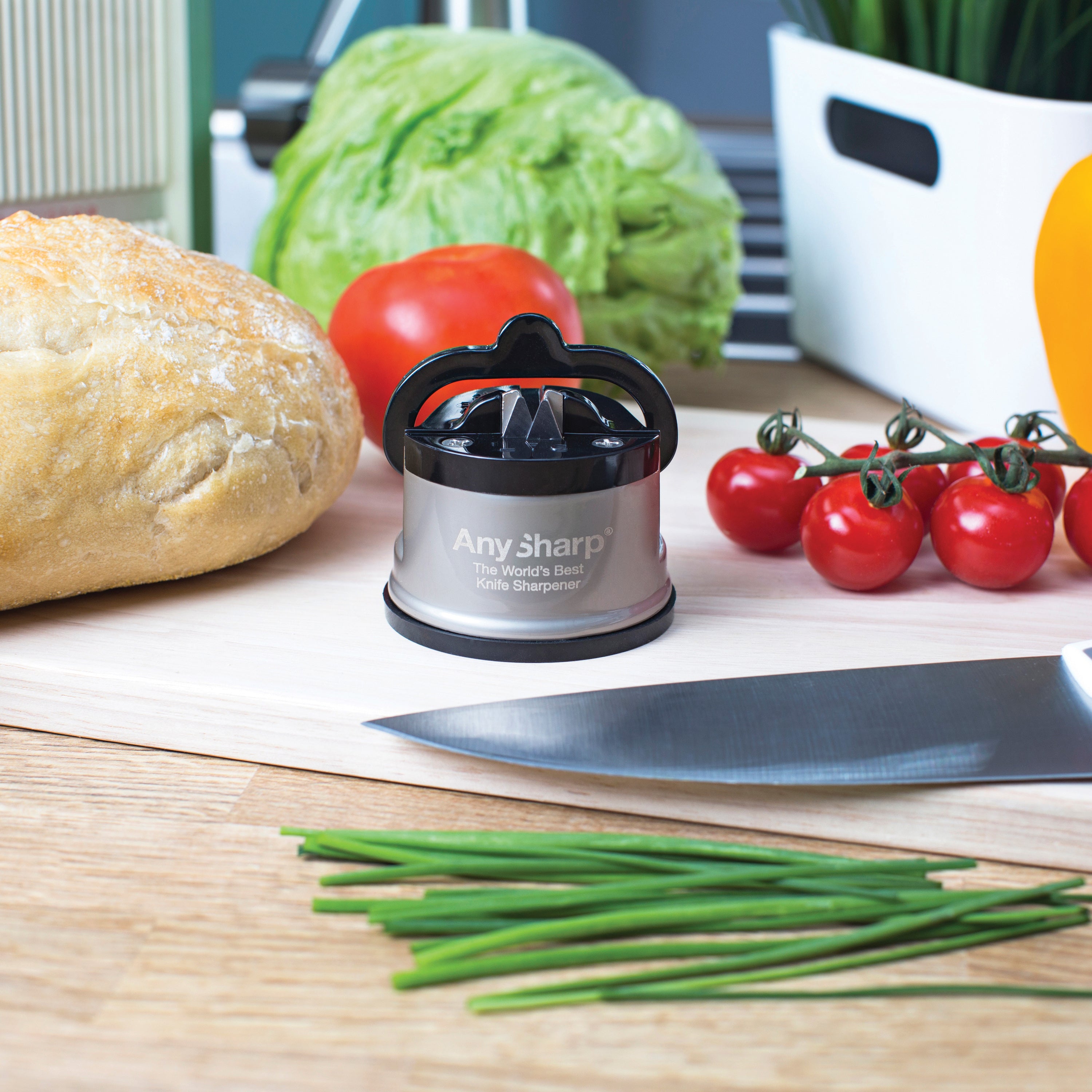 Anysharp Messenslijper Pro Is je mes bot? De Anysharp Messenslijper Pro herstelt de afgestompte snijkant van je favoriete messen. Hij slijpt met een vast ingestelde hoek van 20 graden. Hij maakt gebruik van wolfraam technologie, waardoor je messen langer meegaan. Het maakt niet uit welk mes je wilt slijpen, hij kan het allemaal! Of hij nu groot, klein, gekarteld of gemaakt is van hardstaal: door het mes er drie à vier keer doorheen te halen, wordt hij weer lekker scherp.