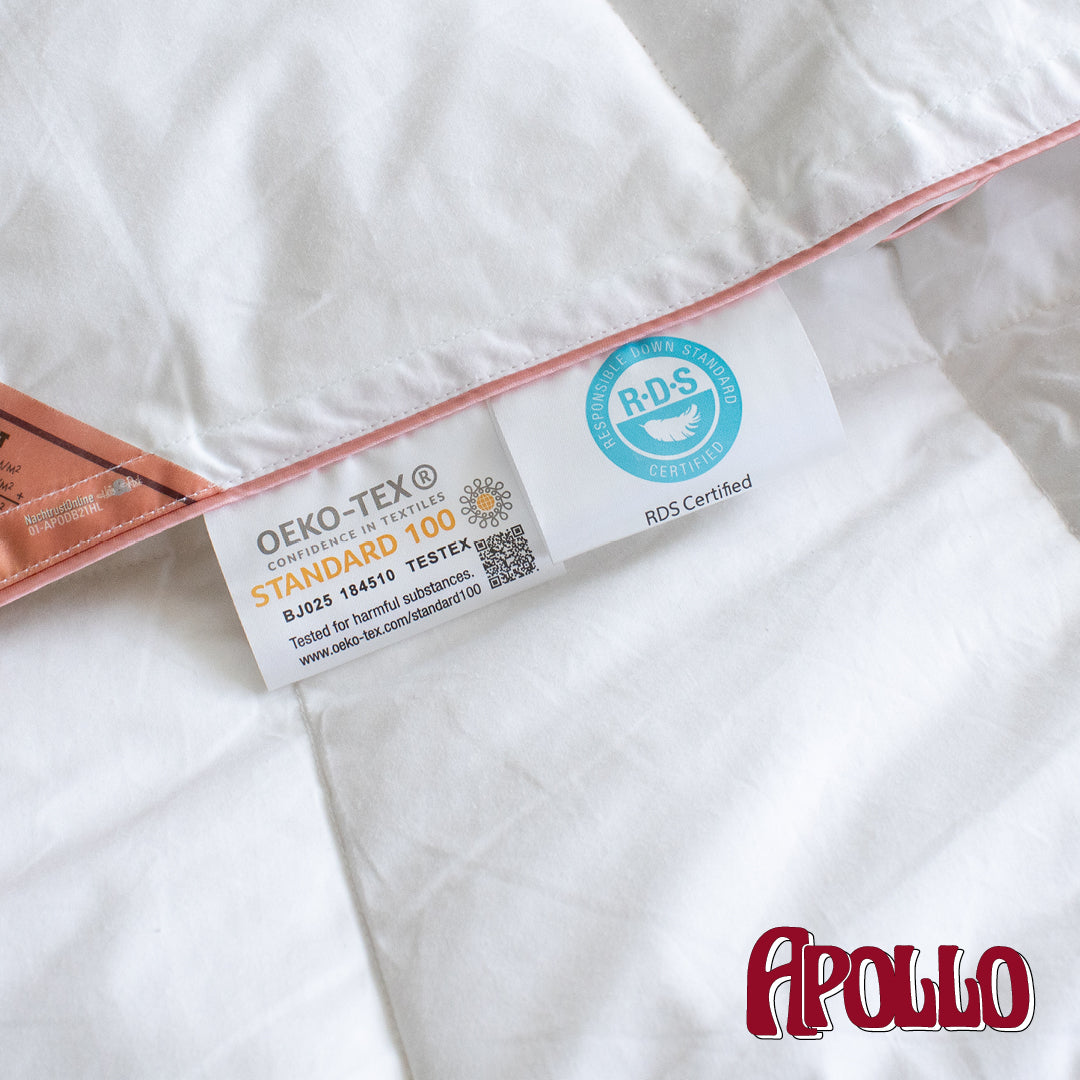 De Apollo vol donzen 4-seizoenen dekbedden zijn uitsluitend gevuld met 100% nieuwe en hygiënisch eendendons. Geproduceerd volgens Europese Norm DIN EN 12943 Klasse 1 gecertificeerde eendendons.