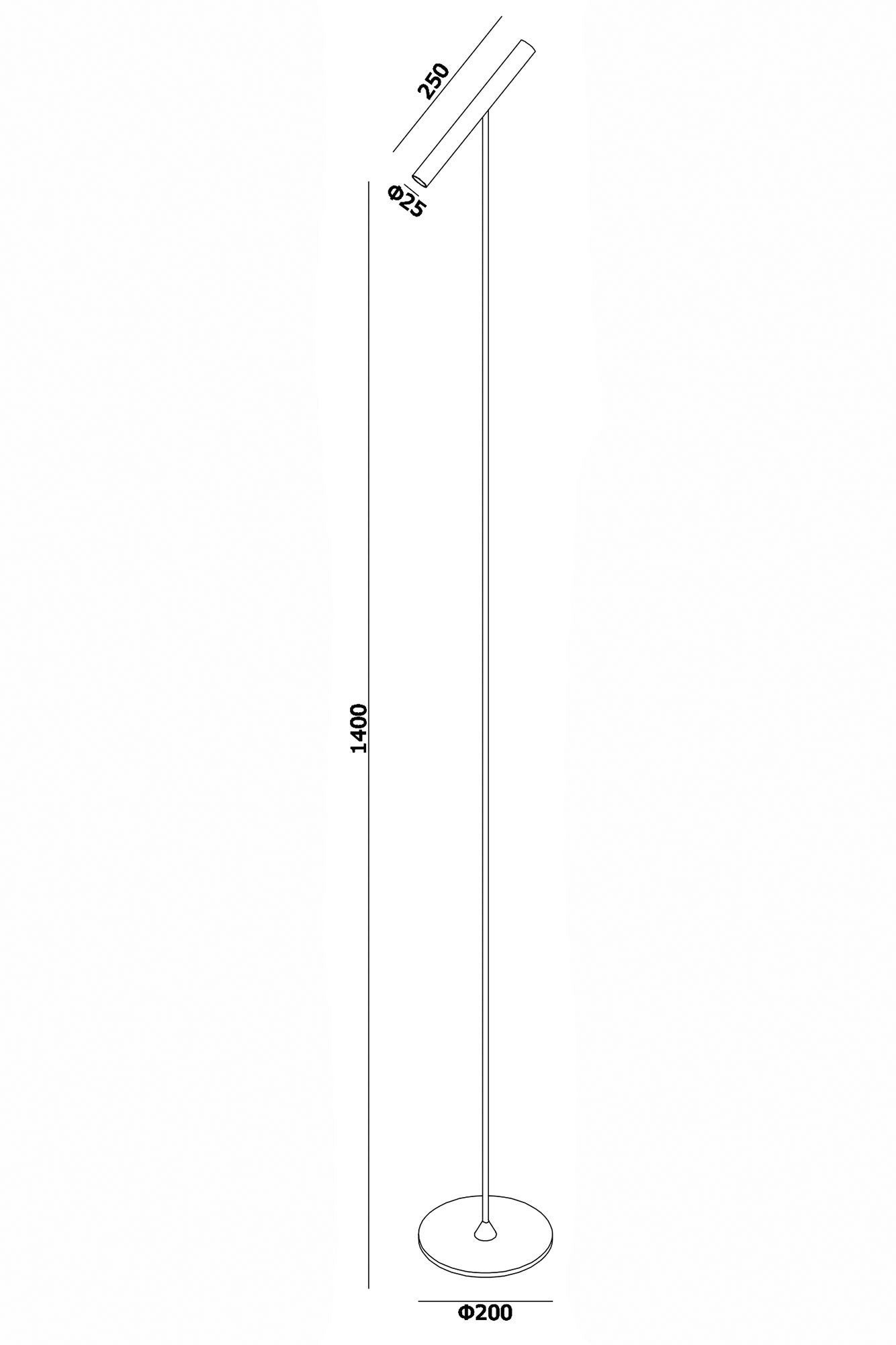 De totale hoogte van de lamp is 140 cm, met een voet van 20 cm in diameter. De stang staat recht omhoog, terwijl de koker, die zowel kan draaien als kantelen, een lengte van 25 cm heeft en een doorsnede van 2,5 cm. Het armatuur is uitgevoerd in mat zwart en de koker heeft een chique champagne kleur.