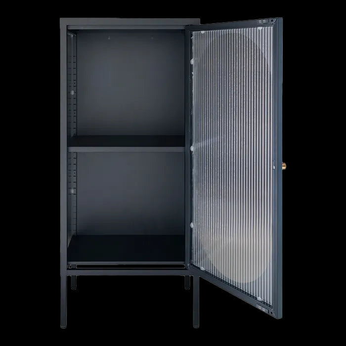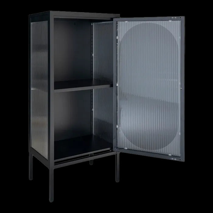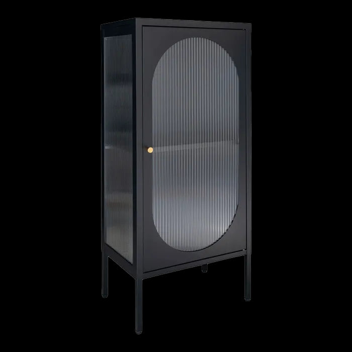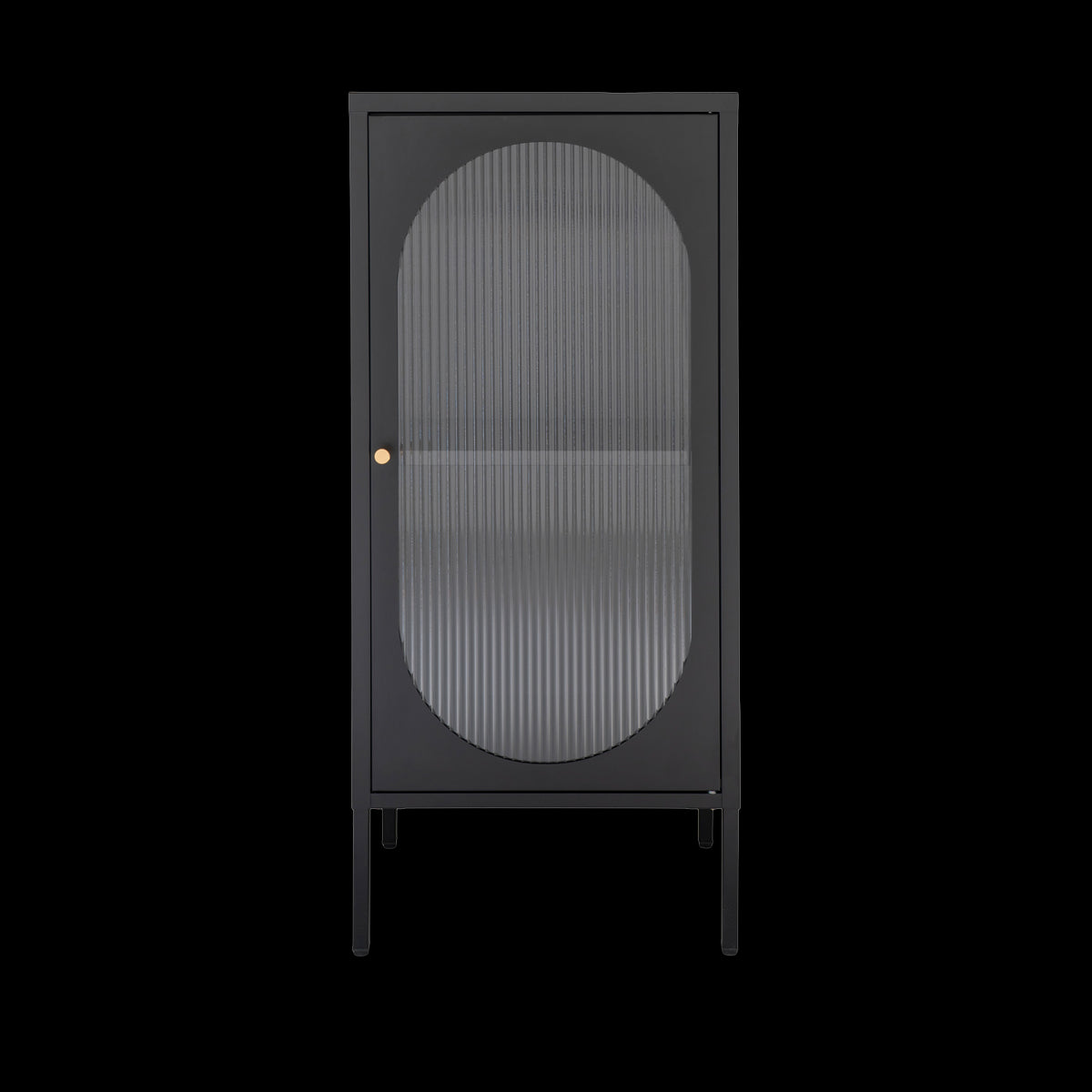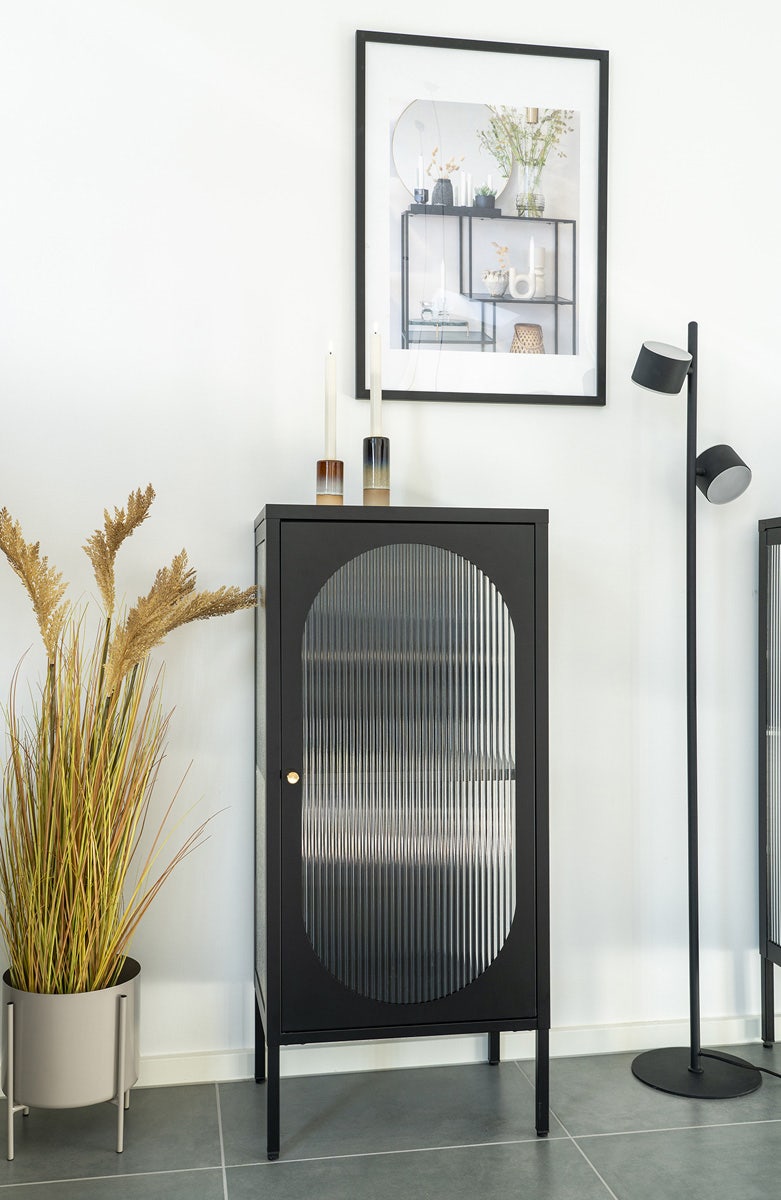 De Abbey vitrinekast is gemaakt van staal en heeft een diepe zwarte kleur. De kast staat op vier slanke metalen pootjes die een hoogte van 20 centimeter hebben. De kast is 50 centimeter breed, 35 centimeter diep en 110 centimeter hoog. De Abbey vitrinekast heeft één deur met een ronde gouden deurknop en een ovale uitsparing die is gevuld met geribbeld glas. Ook de zijkanten van deze kast zijn gemaakt van geribbeld glas, waardoor je van alle kanten in de kast kan kijken. In de vitrinekast zit één plank, zodat er 44 centimeter ruimte onder de plank en 46 centimeter ruimte boven de plank overblijft. Het leuke gestructureerde glas geeft deze kast net even een andere uitstraling. Stal je mooiste voorwerpen uit in en op deze glazen vitrinekast van Artichok.
