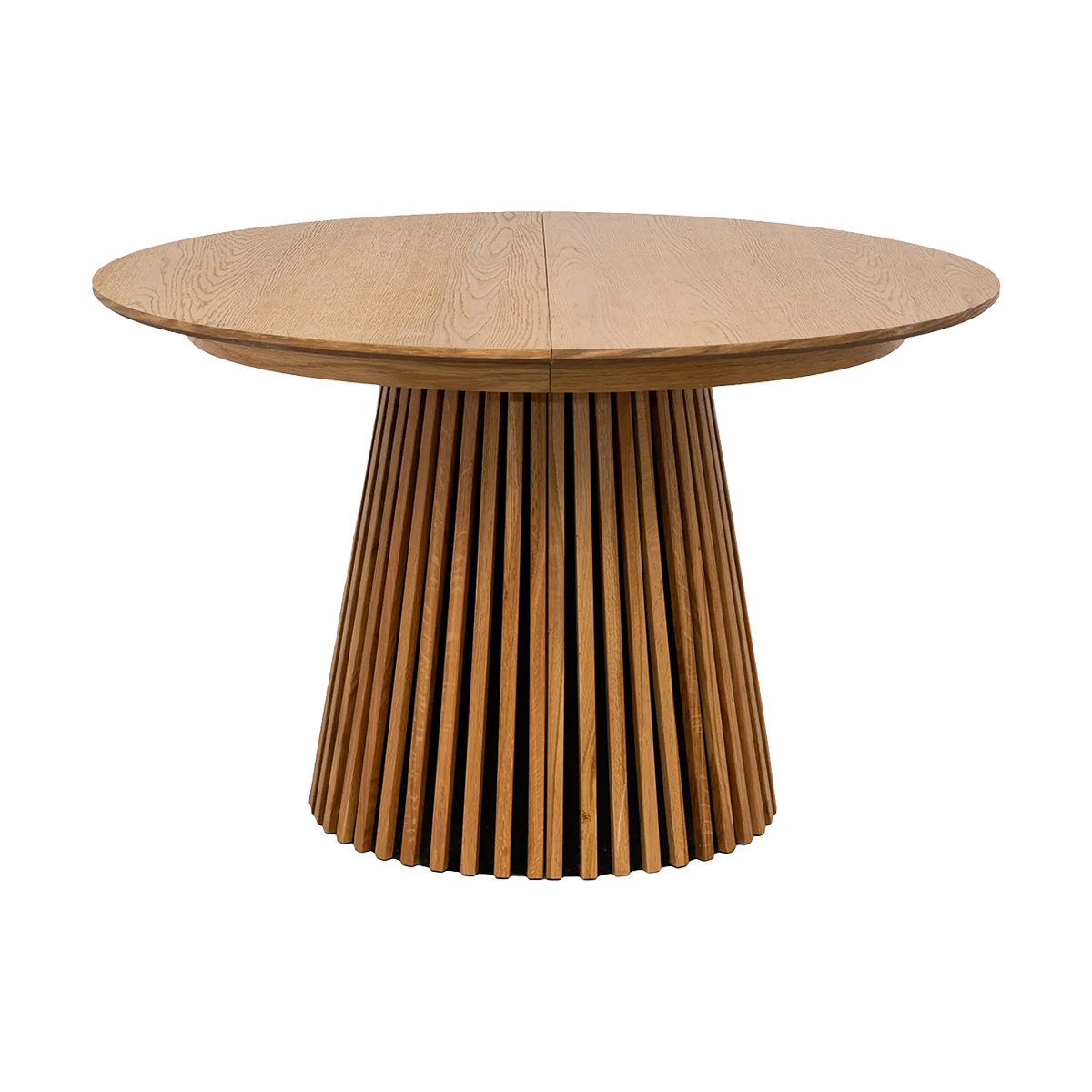 Deze tafel is lekker speels in gebruik: je begint met een ronde tafel van 120 cm en kan hem gemakkelijk uitschuiven tot wel 240 cm! Hoe? Met de drie extra platen van elk 40 cm die je simpelweg in het midden legt – zo blijven de stoere, half ronde poten aan de uiteinden. De tafel is voorzien van een eikenhout fineer laag. Of je nu voor de lichte of donkere kleur kiest, deze tafel voegt altijd een warme, natuurlijke sfeer toe aan je interieur. Plus, de poten zijn een kunstwerk op zich, met verticale houten latjes die de Alko een moderne, minimalistische look geven. Of je nu met z'n tweeën aan de maaltijd zit of je gasten uitnodigt, de Alko past zich helemaal aan jouw behoeftes aan. Perfect voor gezellige etentjes.