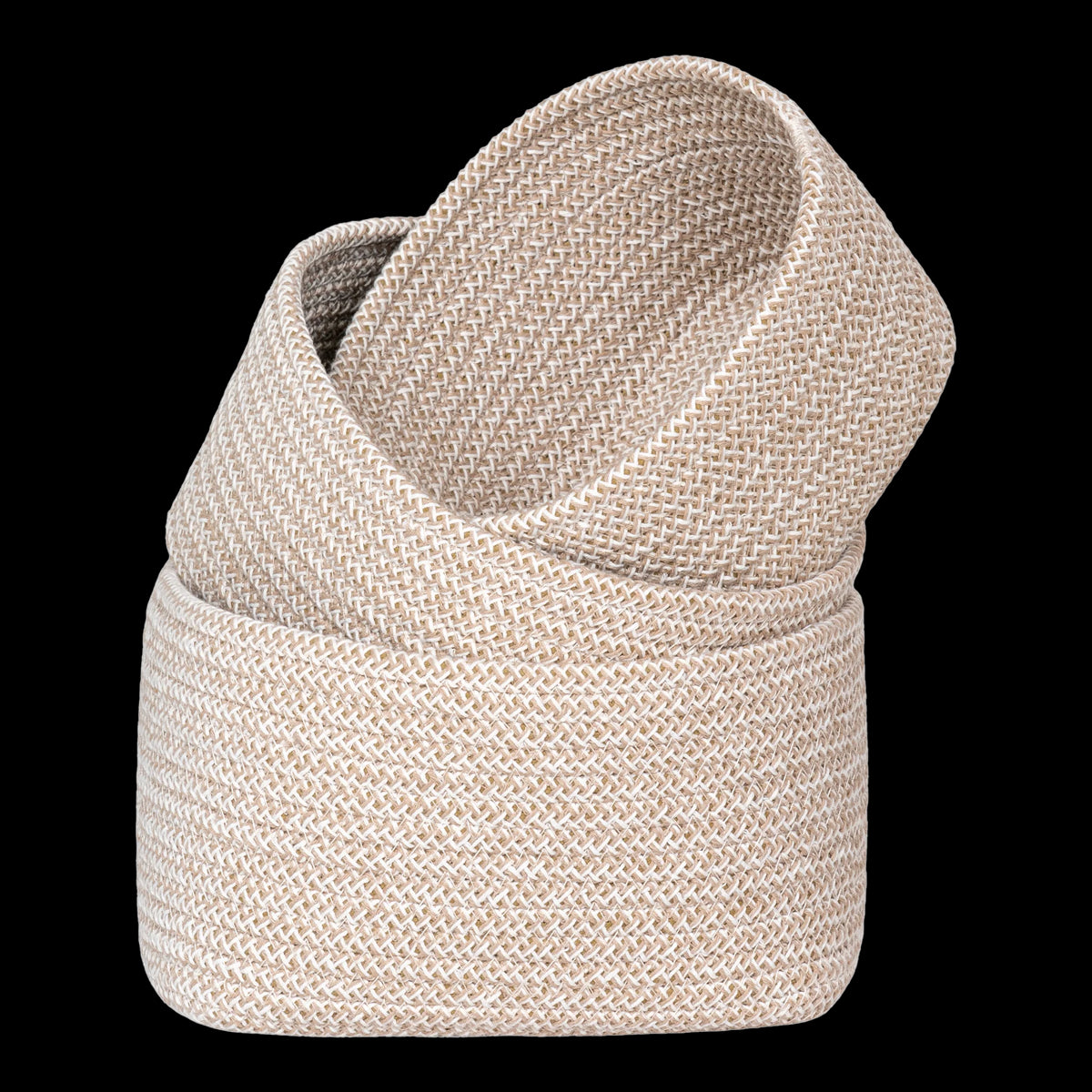 Deze stijlvolle manden zijn gemaakt van katoen en zijn verkrijgbaar in het beige. Ze zijn ideaal voor het opbergen van spullen zoals opgerolde handdoeken of shampoo flessen. Door het gevlochten ontwerp en de neutrale beige kleur creëren deze opbergmanden een sfeervolle warmte die aansluit bij verschillende interieurstijlen. Ook in de boekenkast of op je werkplek is deze set ideaal te gebruiken als opbergmanden voor kleine spullen. De afmetingen van de manden zijn als volgt: