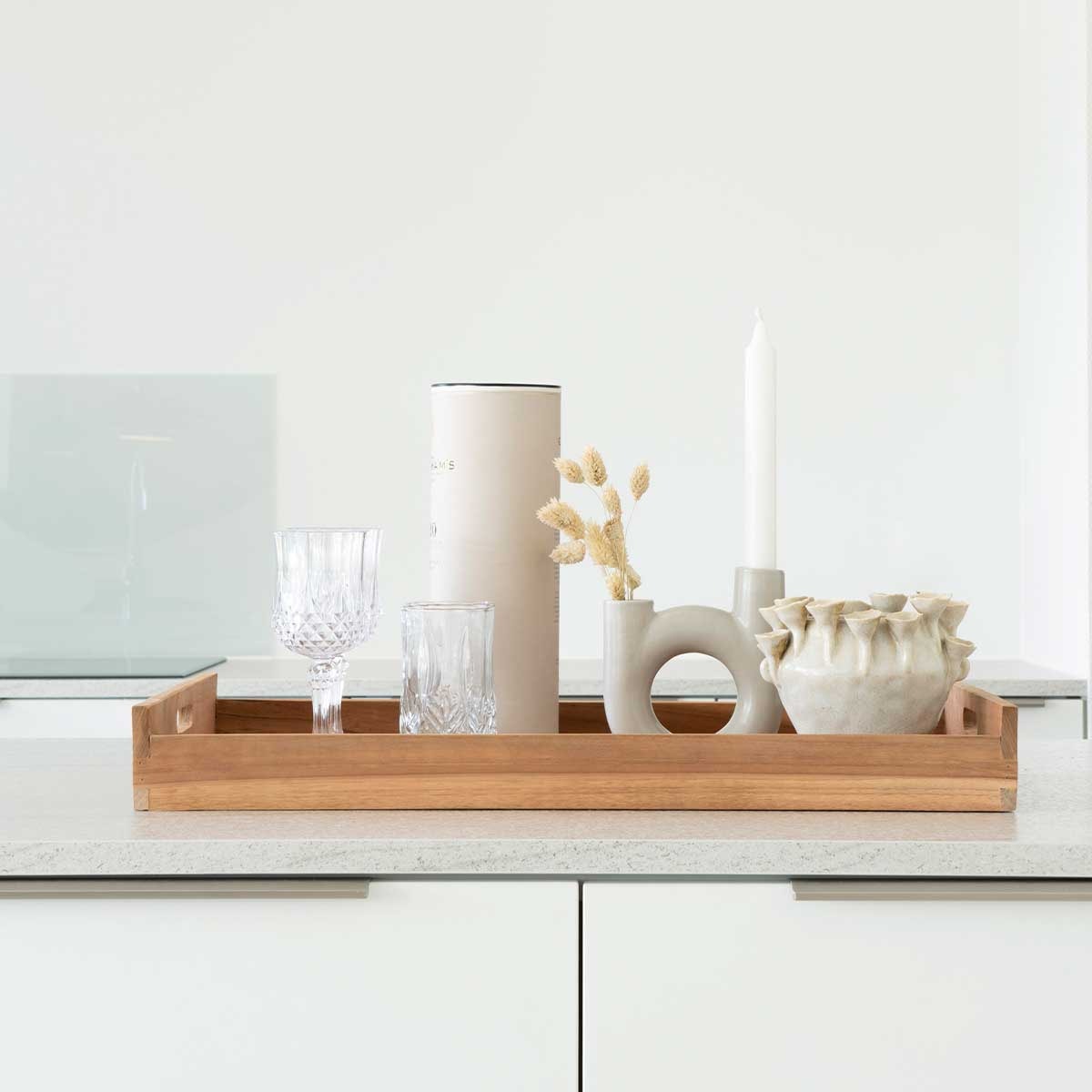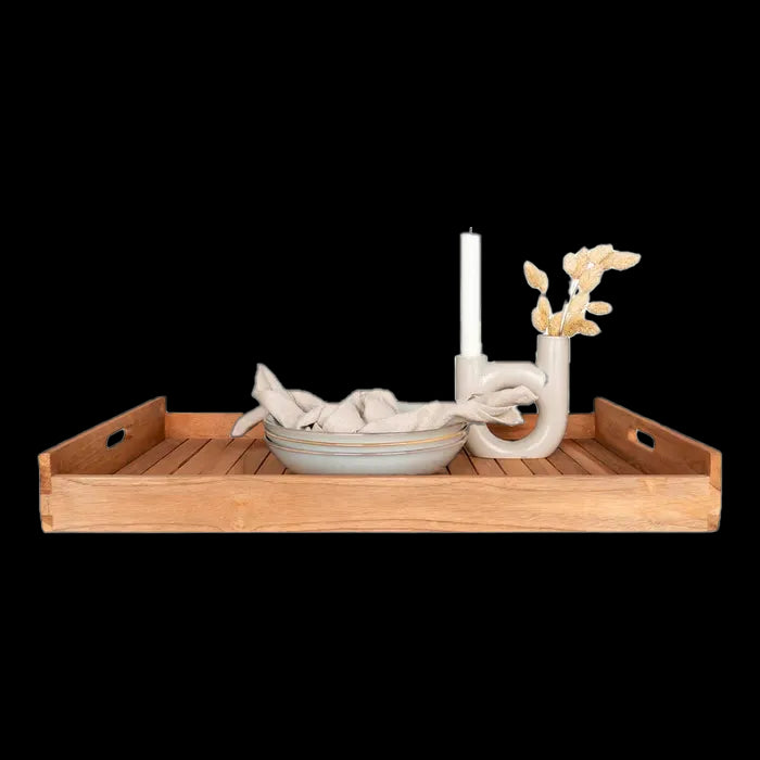 Het dienblad heeft een eenvoudig en functioneel Scandinavisch design. Combineer dit dienblad met decoratie, bijvoorbeeld vaasjes, planten of onderzetters. Hij is 7 cm hoog en daardoor eenvoudig op te bergen of ergens tussen te zetten. Het hout is waterbestendig en gemakkelijk schoon te houden met een vochtige doek. Verder is het dienblad ontworpen met handvaten aan de zijkant, wat jou gemak geeft om hem mee te nemen.