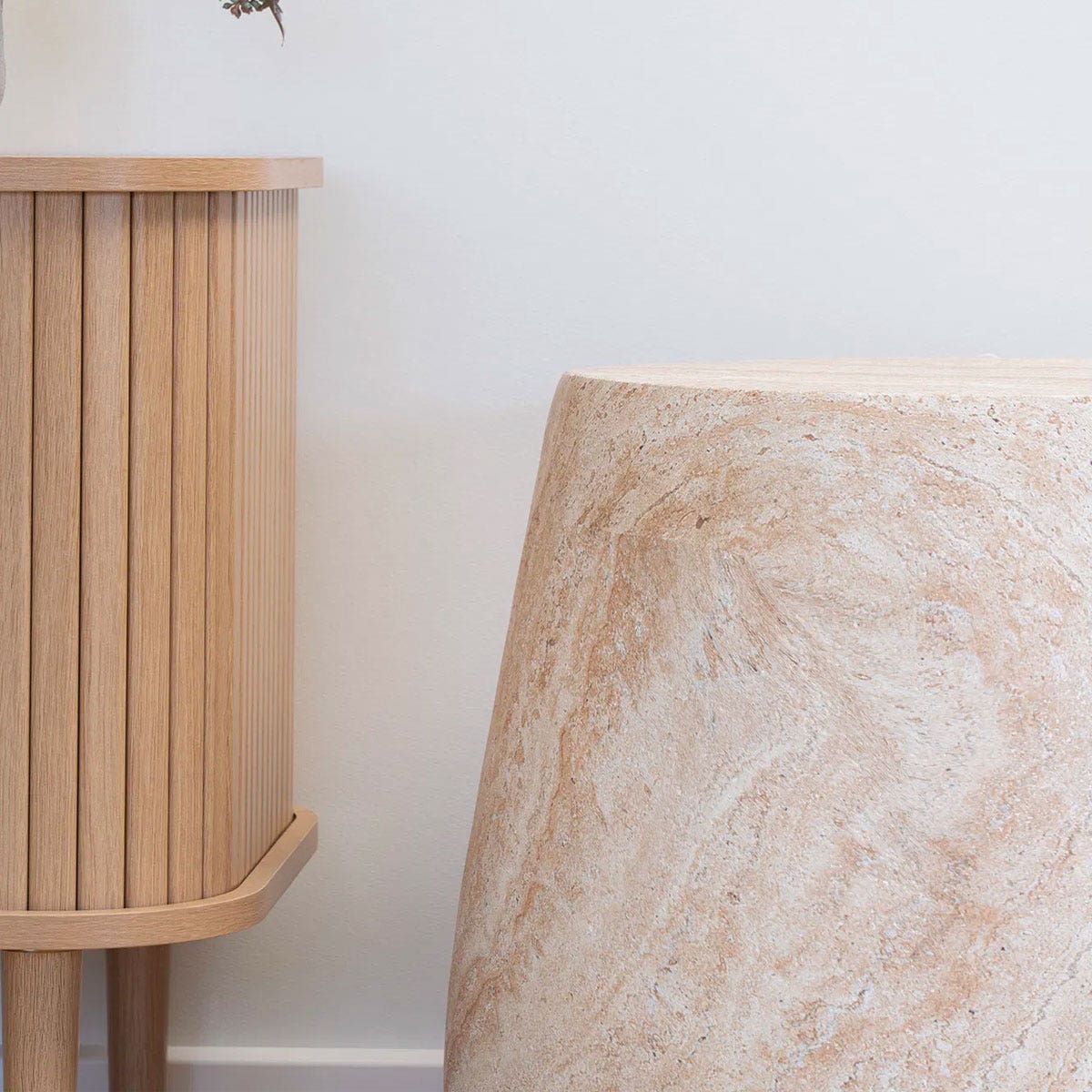 Met zijn zachte beige kleur, ronde vorm en luxe uitstraling past hij perfect in een Scandinavische of rustige woonstijl. Door het compacte formaat is Dorus ideaal voor naast de bank, in de hal of als blikvanger in de slaapkamer. Fiberclay is een mix van klei en glasvezel, waardoor het eruitziet als beton of steen, maar veel lichter is. Zo geniet je van die robuuste, natuurlijke look, zonder dat je met een loodzware tafel hoeft te sjouwen. En fijn: Dorus is niet alleen geschikt voor binnen, maar ook voor een overdekt terras. Of je ‘m nu gebruikt voor je kopje koffie, een mooi boek of een plant – Dorus zorgt voor stijl én gemak.