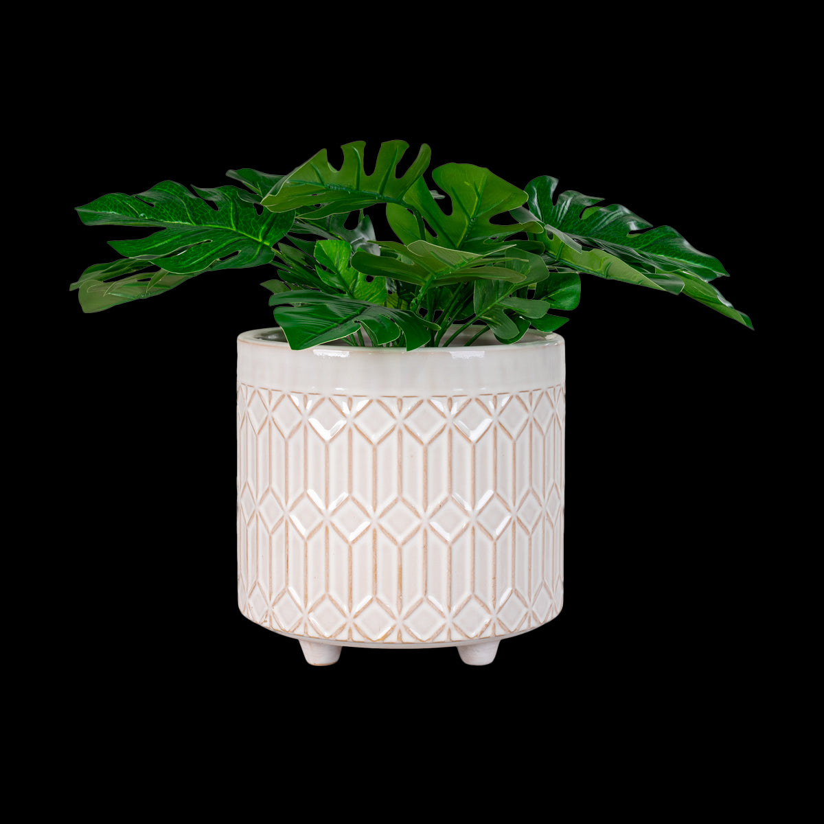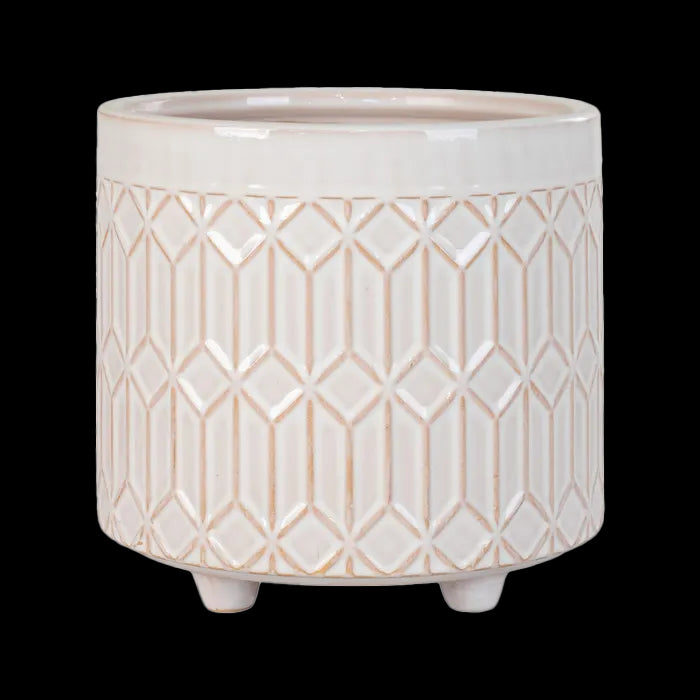 De Emmy bloempot is gemaakt van keramiek en afgewerkt met een patroon. De bloempot staat op vier kleine pootjes, wat hem een speelse uitstraling geeft. De bloempot heeft een diameter van 15,5 cm en een hoogte van 16 cm. Vul de pot met een leuk plantje en zet hem in de boekenkast, op het dressoir of in de vensterbank.