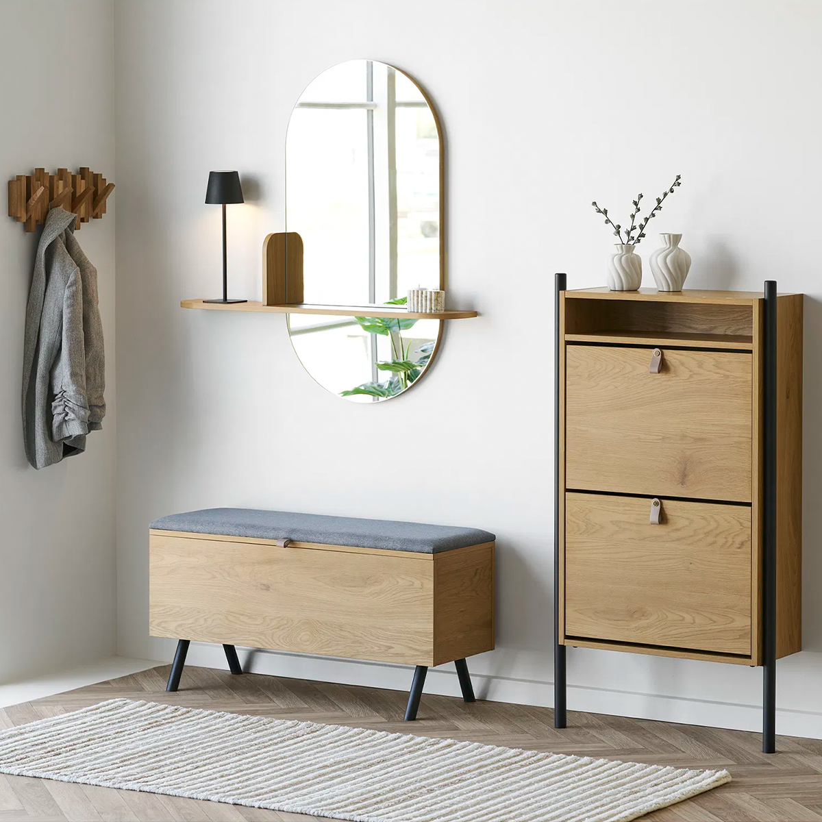 Het elegante ovale formaat geeft je interieur een zachte, organische uitstraling, terwijl het handige houten plankje onderaan extra ruimte biedt voor kleine spullen of decoratie. Denk aan een vaasje, parfumflesjes of je sleutels bij de voordeur. Deze spiegel is een echte blikvanger in de hal, slaapkamer of woonkamer.
