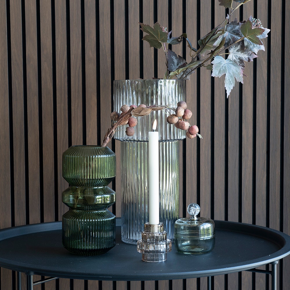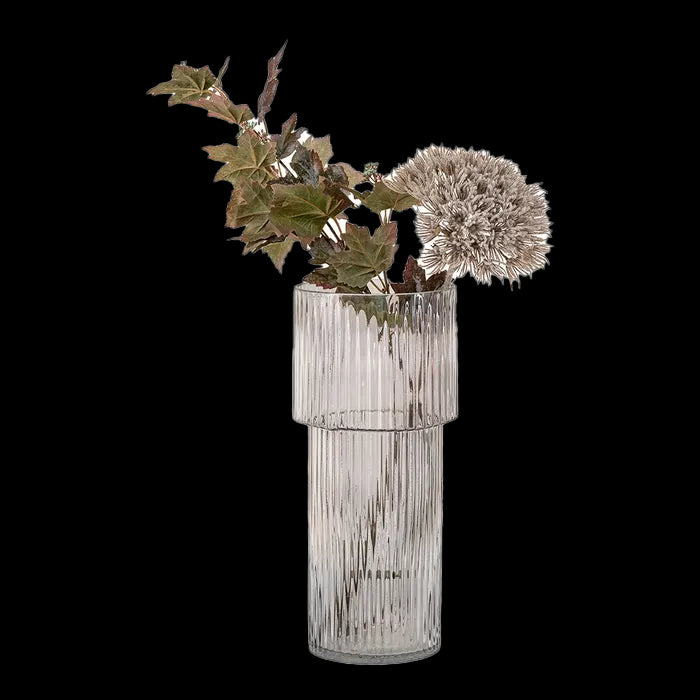 De vaas is gemaakt van transparant glas en heeft een geribbelde buitenzijde. De vaas heeft een diameter van 17,5 cm en een hoogte van 40 cm. Hierdoor leent de vaas zich perfect om een groot boeket bloemen in te zetten. Ook met mooie takken pluimen maak je het met de Floor vaas gezellig in huis.