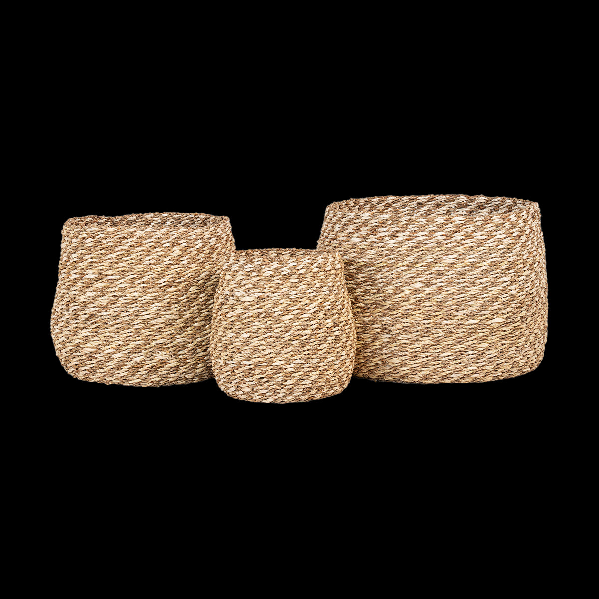 De set bestaat uit 3 ronde manden met verschillende afmetingen. De manden zijn gemaakt van zeegras en hebben daardoor een natuurlijke uitstraling. De afmetingen van de manden zijn als volgt (van groot naar klein): Ø44 x H30 cm, Ø34 x H27 cm en Ø24 x H23 cm. De manden zijn ideaal te gebruiken als opbergmand voor speelgoed, kleine spulletjes, plaids of tijdschriften.