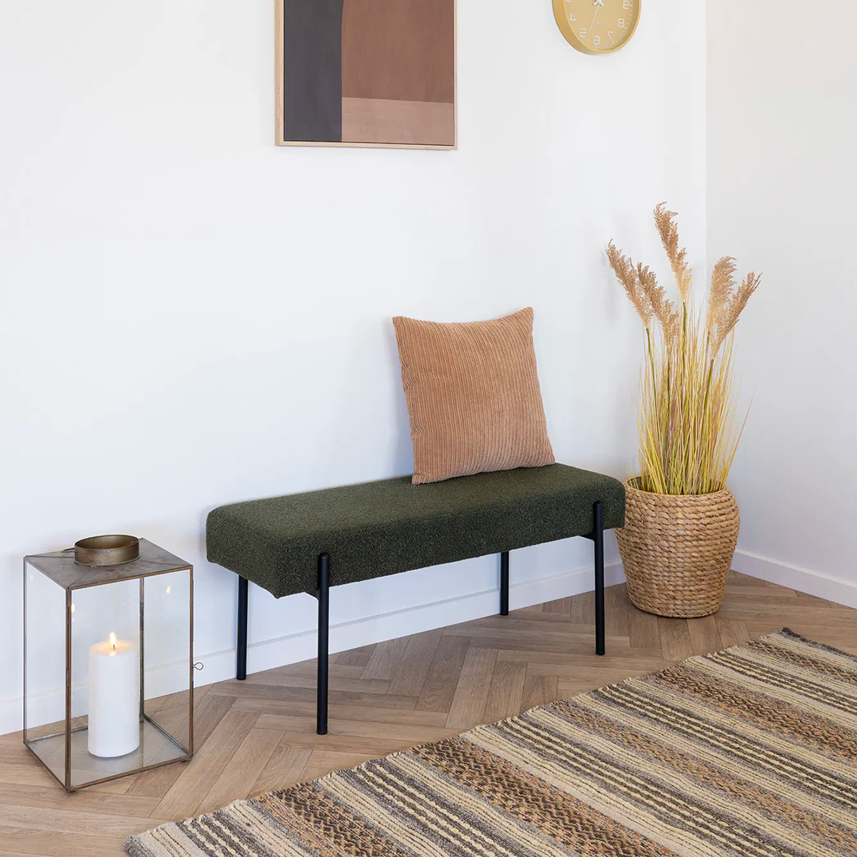 Het bankje heeft een gestoffeerde zitting gemaakt van polyester. De slanke, ronde pootjes zijn gemaakt van metaal en hebben een zwarte kleur. Dit trendy bankje past helemaal bij de trend van neutrale, aardse tonen in het interieur en is overal mee te combineren. Bovendien is het op verschillende manieren te gebruiken: als decoratief bankje in de woonkamer, als extra zitplaats voor onverwachte visite of zelfs als eetkamerbank in de eethoek. Het Marianna bankje is in beige en taupe verkrijgbaar, en heeft daarnaast ook nog een variant in bouclé stof.
