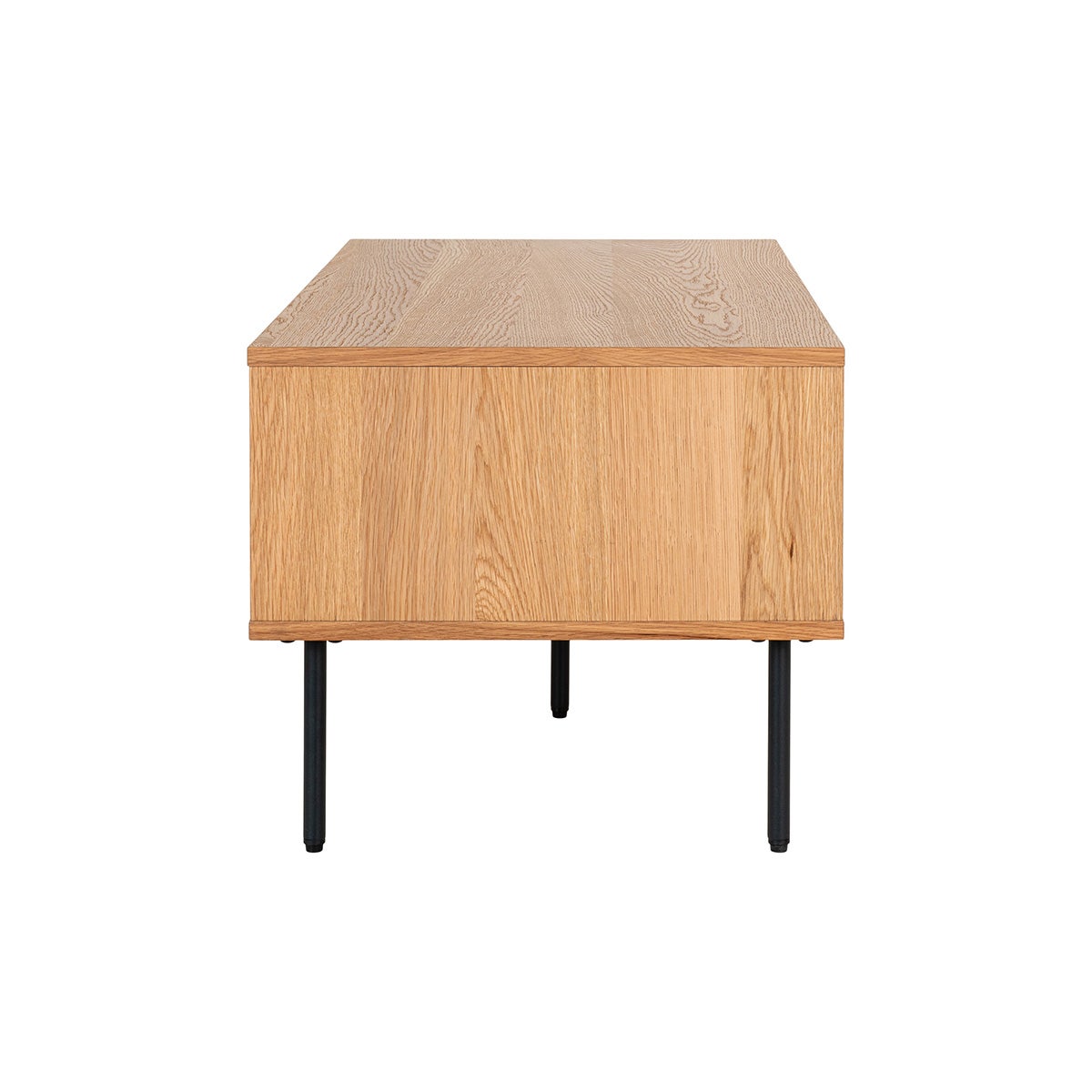 Deze koffietafel heeft aan beide zijden namelijk zowel een lade als een opbergvak waar je spullen in kan bewaren. Zo houd je je woonkamer netjes opgeruimd en heb je handige spullen altijd bij de hand. De salontafel is gemaakt van hout met een laag eikenfineer en heeft daardoor een warme en natuurlijke uitstraling. De ronde metalen pootjes in zwarte kleur geven het design een stoere twist, terwijl de horizontale latjes op de lades het geheel een moderne uitstraling geven. De Ruben salontafel met lades is dus een praktische en stijlvolle toevoeging aan jouw zithoek.