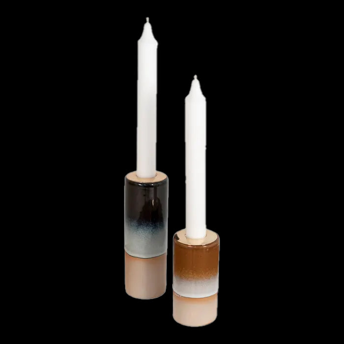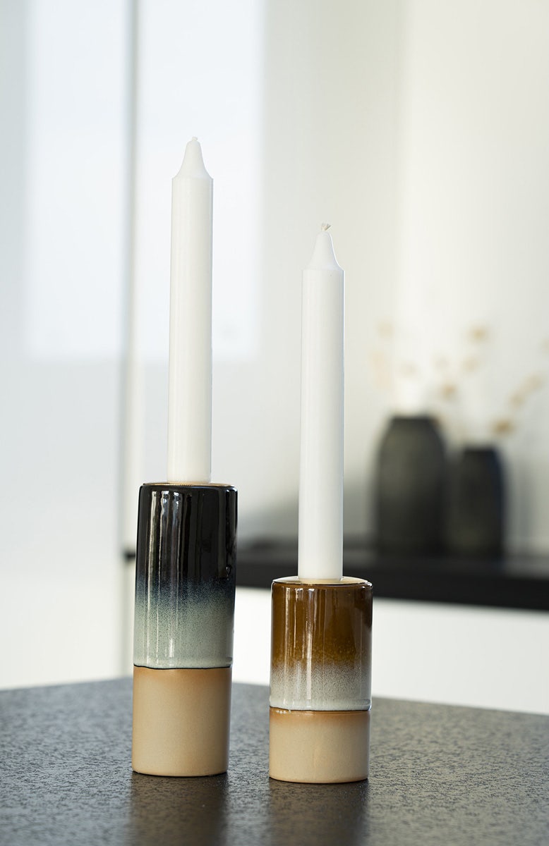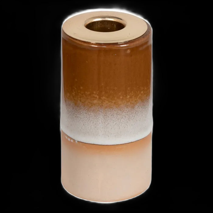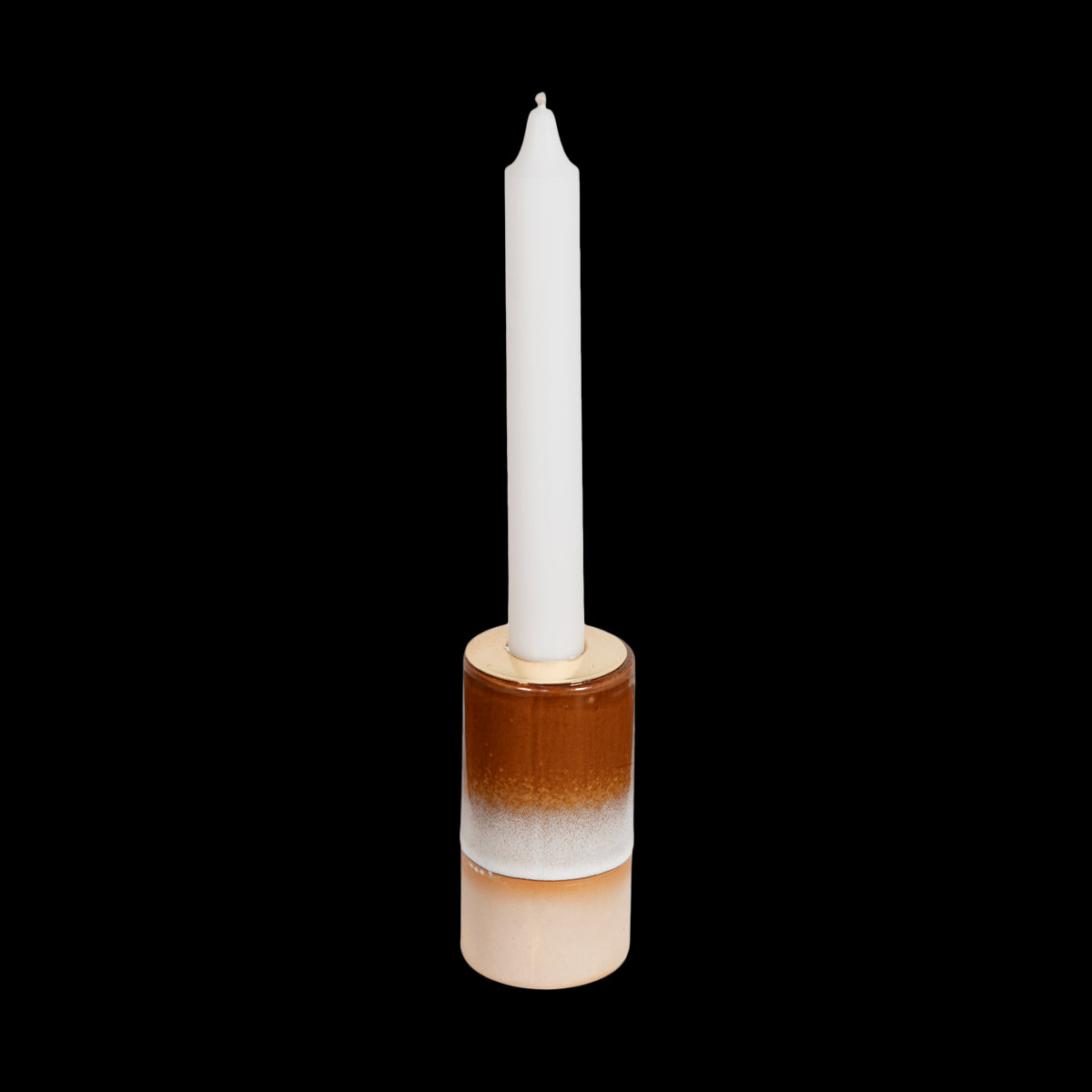 De Sofia kandelaar van Artichok is gemaakt van keramiek met een reactieve glazuurlaag. Hierdoor heeft de kandelaar een mooi verloop van kleuren: van roestbruin naar oranje, wit en zalmroze. Aan de bovenzijde van de kandelaar zit een messing plaatje dat het kaarsvet opvangt. De Sofia kaarsenhouder heeft een diameter van 5 cm en een hoogte van 10 cm. De lage kandelaar heeft een eenvoudig ontwerp maar is toch een heel sfeervol decoratief item door de mooie kleuren. Hierdoor is de kandelaar perfect om een klein vleugje kleur toe te voegen in het interieur. Kaarsen zijn een must-have voor een romantische avond of een sfeervol diner: combineer meerdere kaarsenhouders en kandelaars met elkaar voor een gezellige setting.