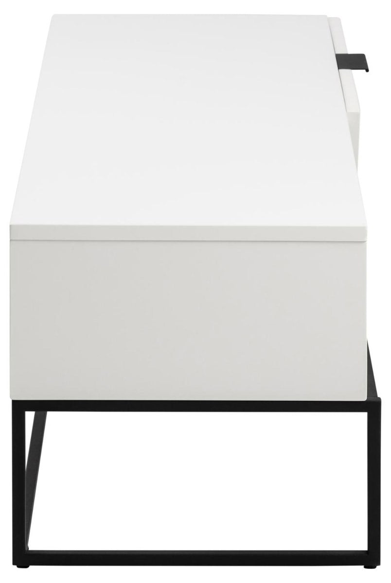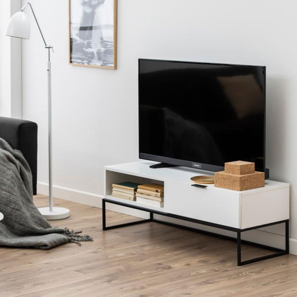 Het meubel is ontworpen met een stevig zwart metalen onderstel, helemaal volgens de laatste woontrends. Het TV-meubel is voorzien van een uitsparing in de achterkant zodat je de kabels gemakkelijk kunt wegwerken. Achter het kastje kun je overige spullen opbergen die niet altijd in het zicht hoeven te staan.
