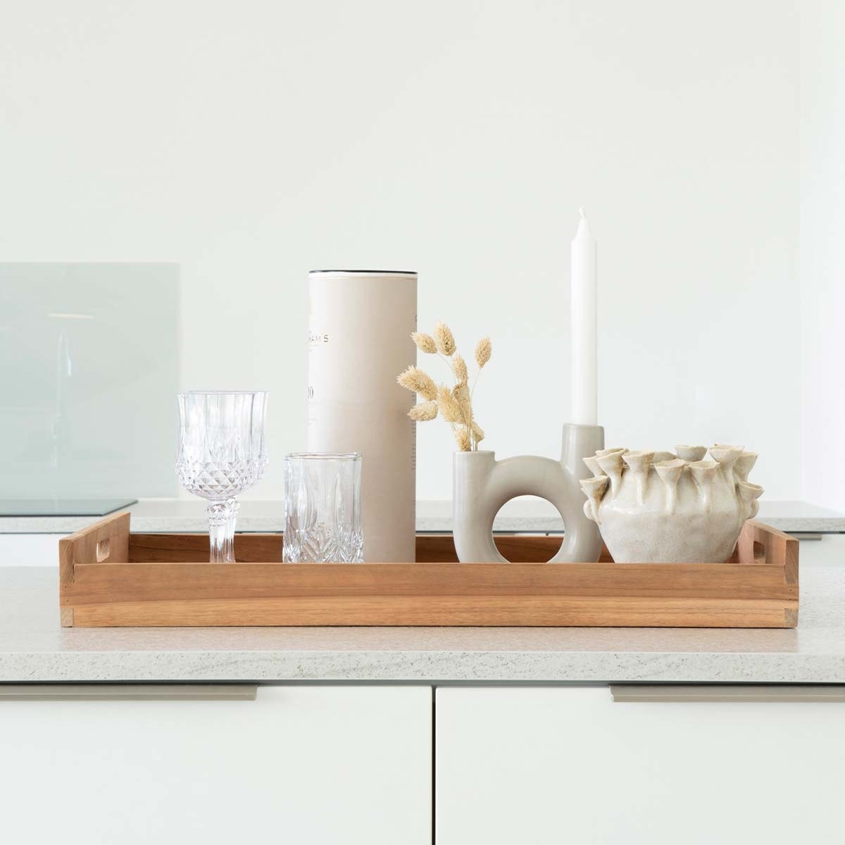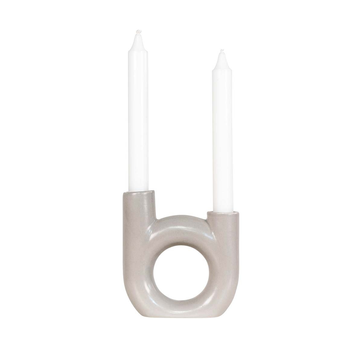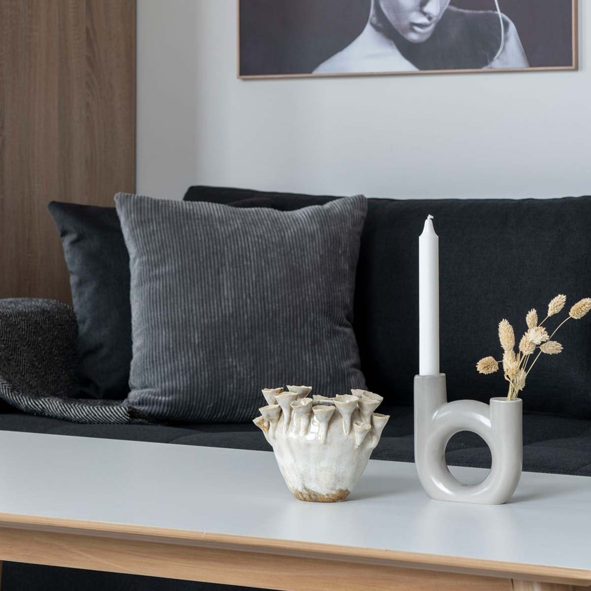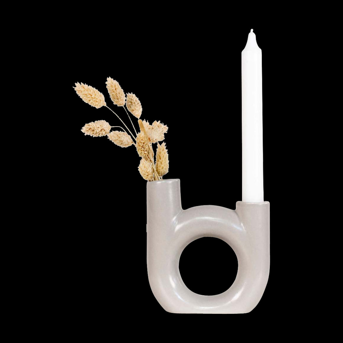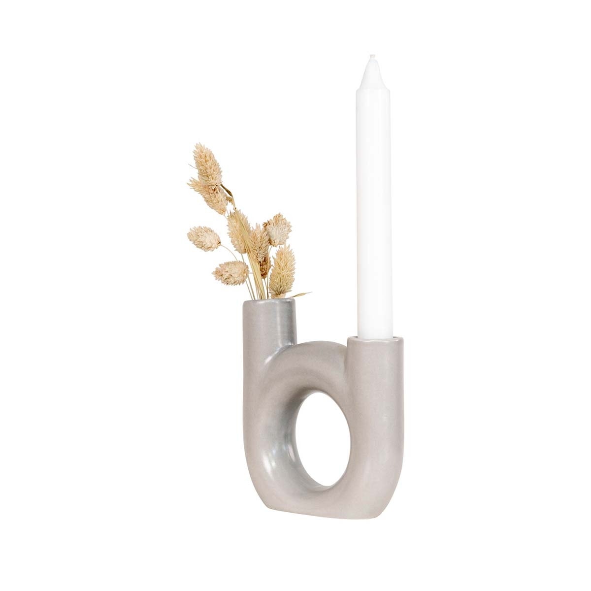 De ronde vorm van de kandelaar in combinatie met de strakke lijnen van een kaars zorgen voor een uniek effect. Je kunt ervoor kiezen twee kaarsen in te plaatsen of te combineren met een (droog)bloem. Combineer verschillende kandelaren, vazen en droogbloemen met elkaar voor een uniek hoekje in je interieur.