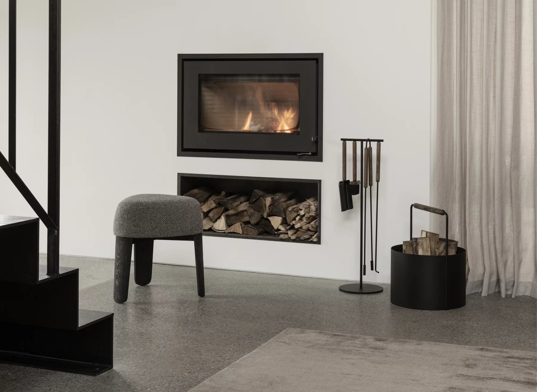 - De 5-delige ASHI openhaardset van Blomus bestaat uit een houder met schep, pook, bezem en tang.
