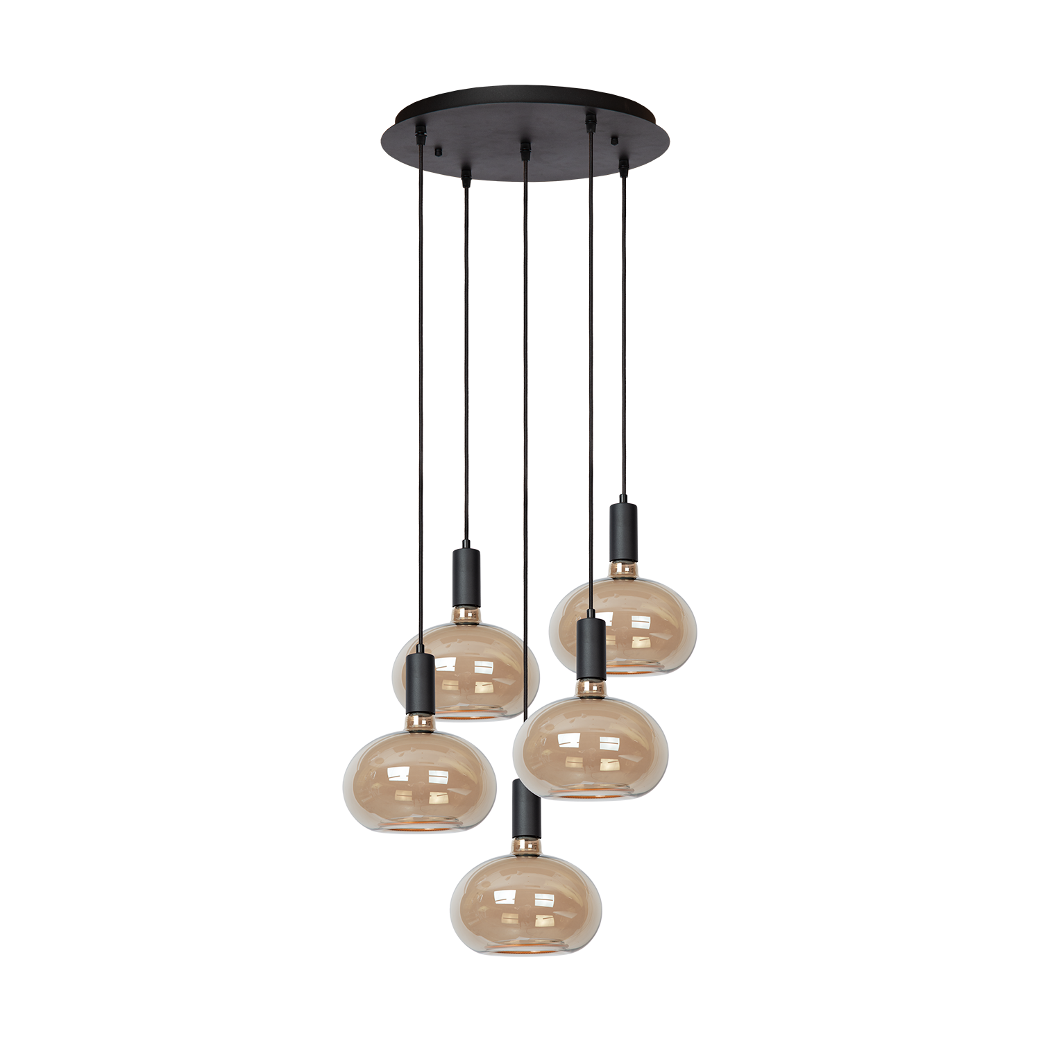 De Atmooz Sapa 5 is een stijlvolle hanglamp met een minimalistisch design. De combinatie van een zwarte metalen plafondplaat en vijf rookgrijze Segula Floating Oval LED-lichtbronnen zorgt voor een moderne en sfeervolle uitstraling.