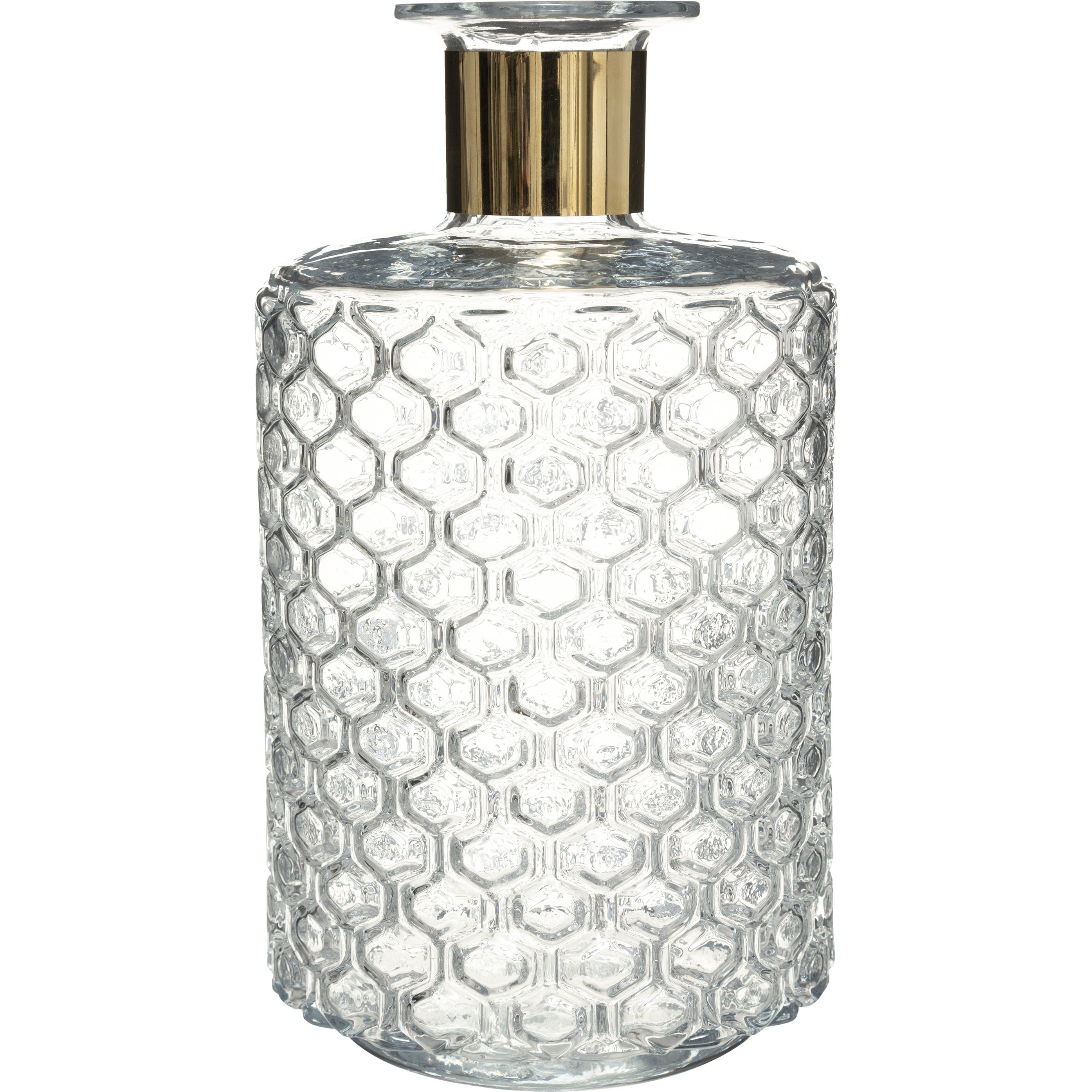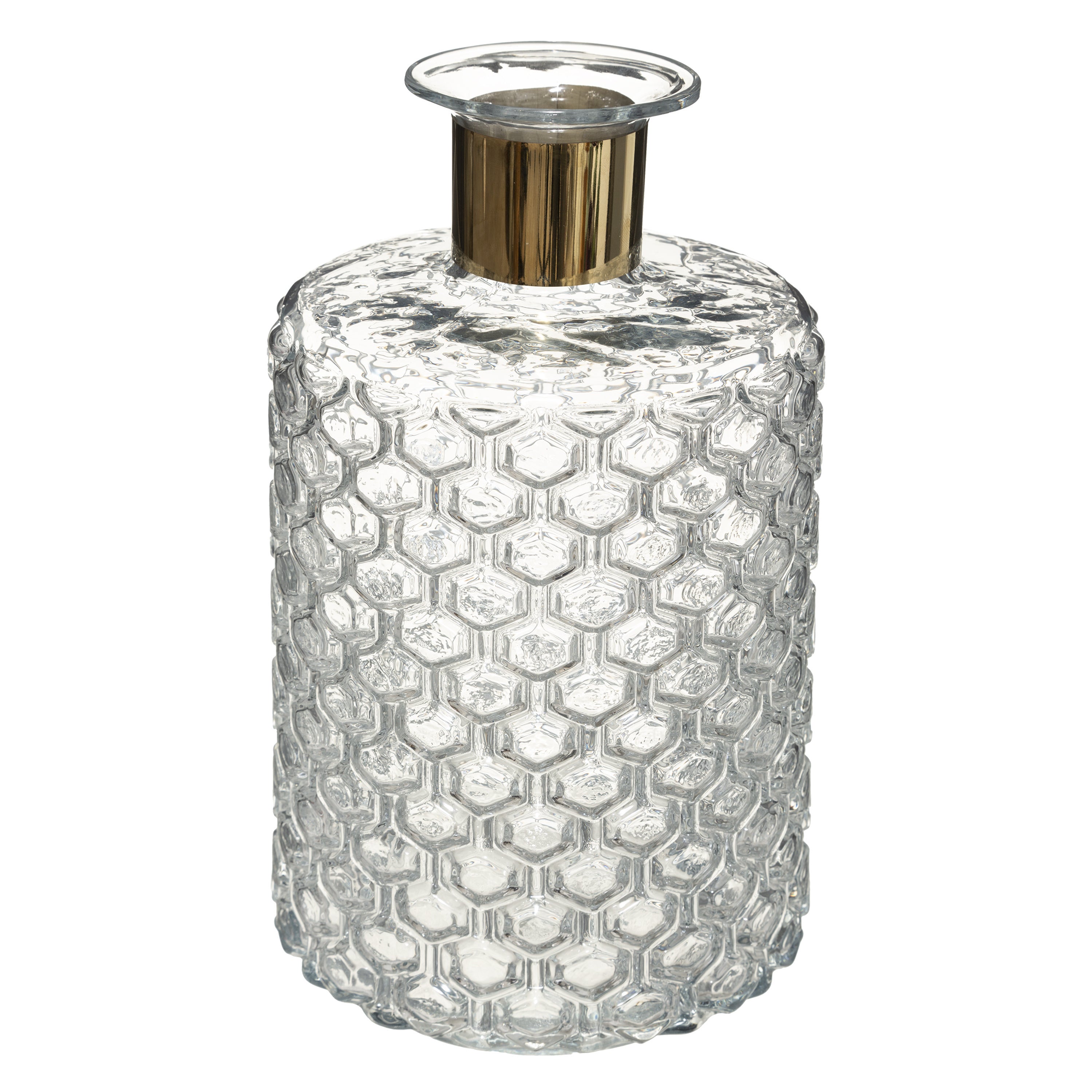 Bloemenvaas in een Apotheker Fles model/vorm met goudkleurig metalen rand gemaakt van bewerkt transparant luxe glas. Afmetingen: 26 cm en 15 cm. Geschikt voor wilde-, sier of kunstbloemen en stelen, decoratie takken en boeketten. Vazen voor binnen gebruik. Model: Elegance. Transparante vazen zijn een must in elk huis.