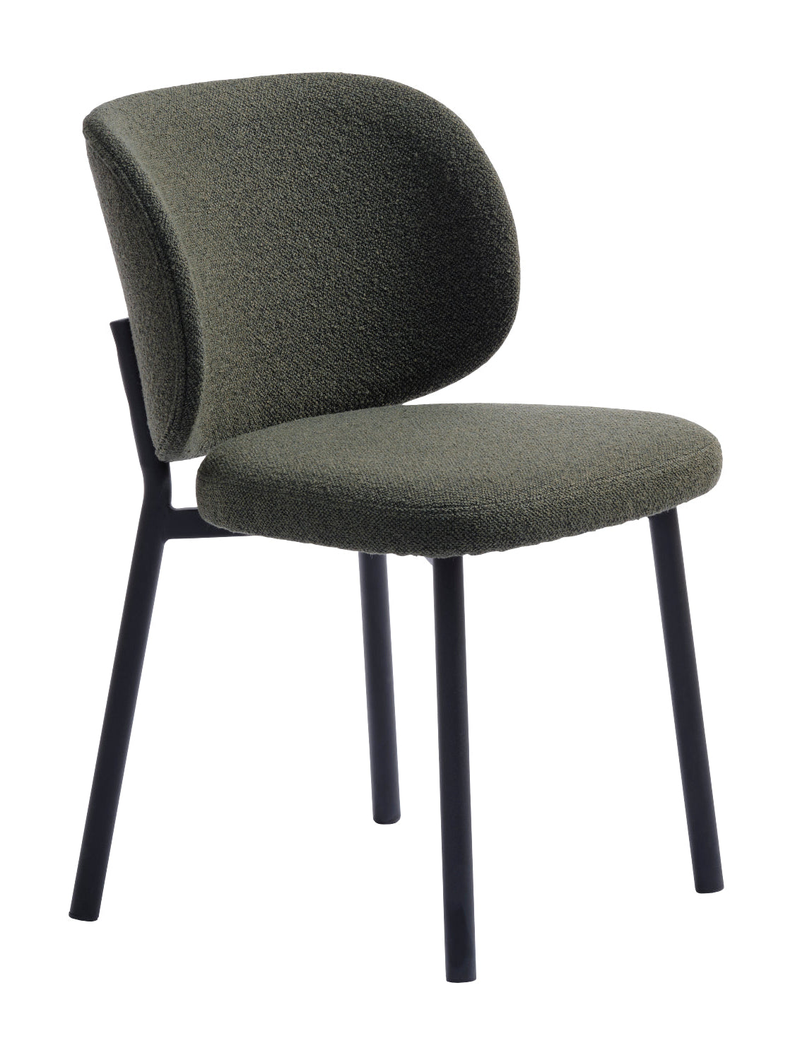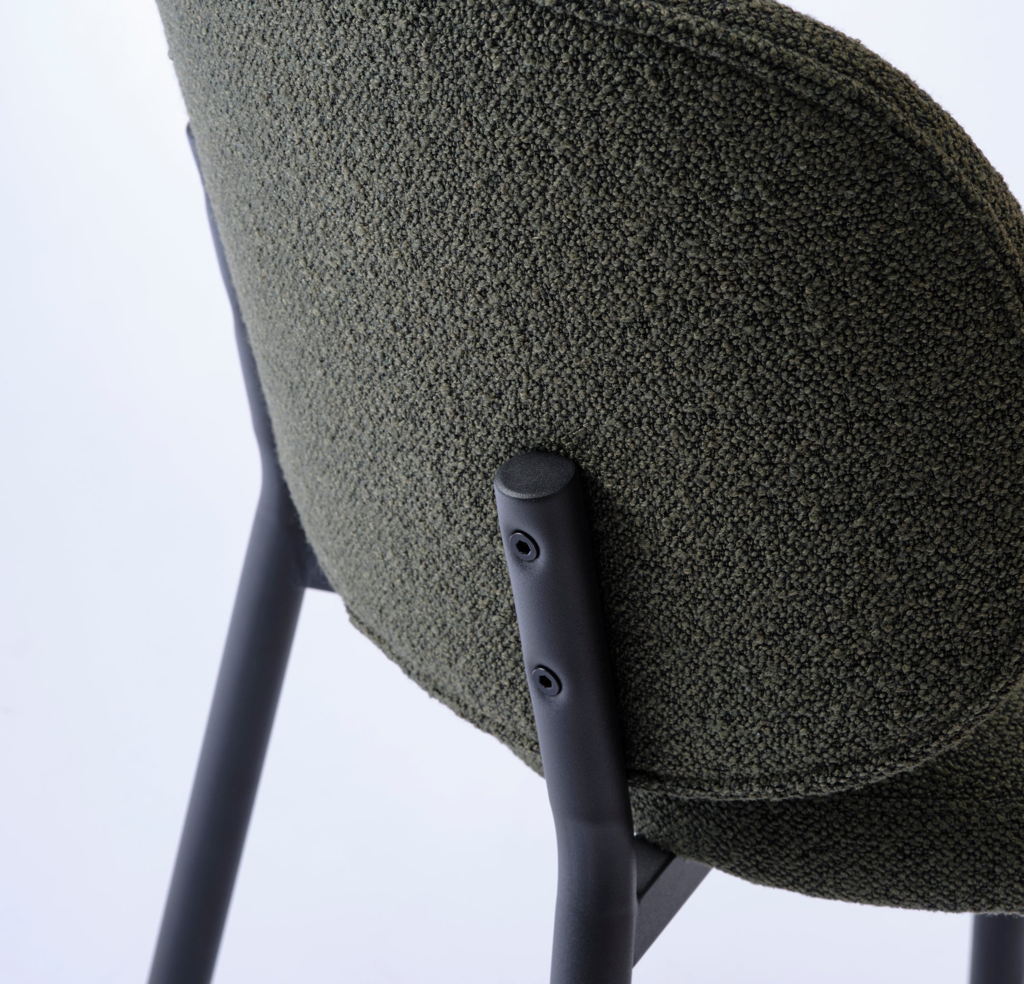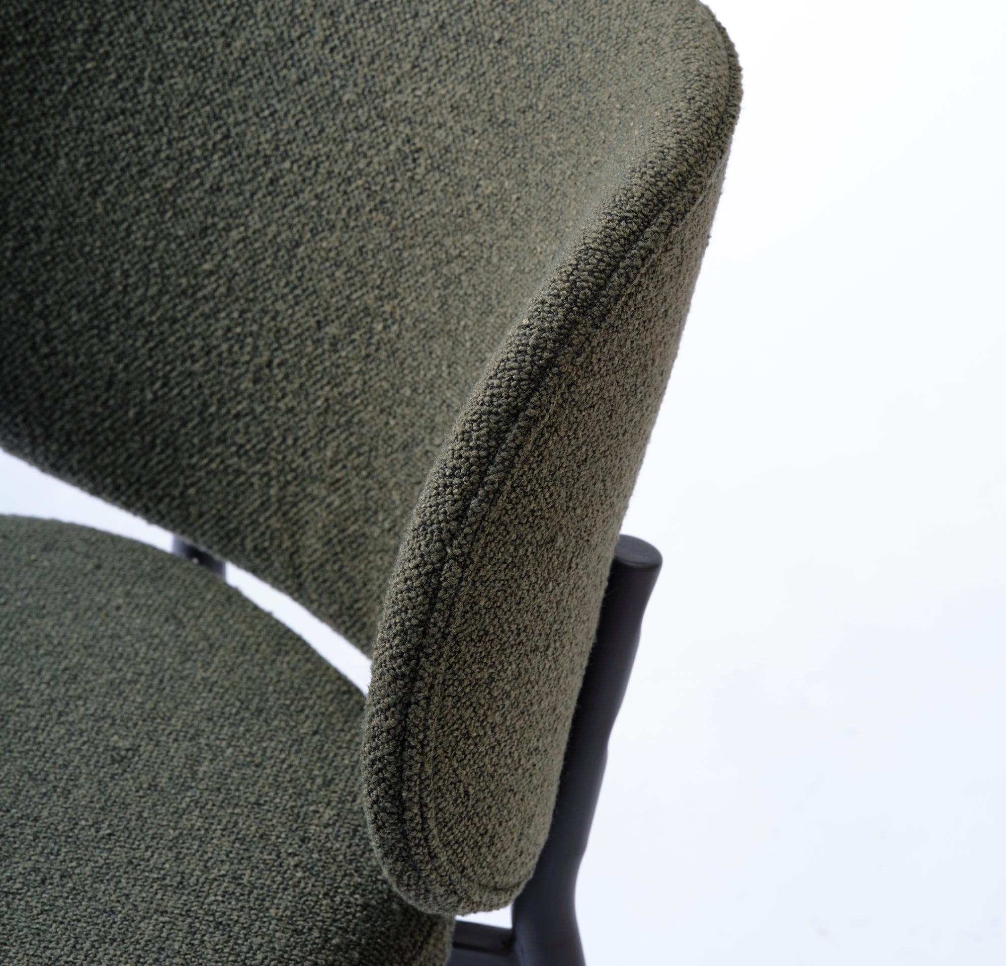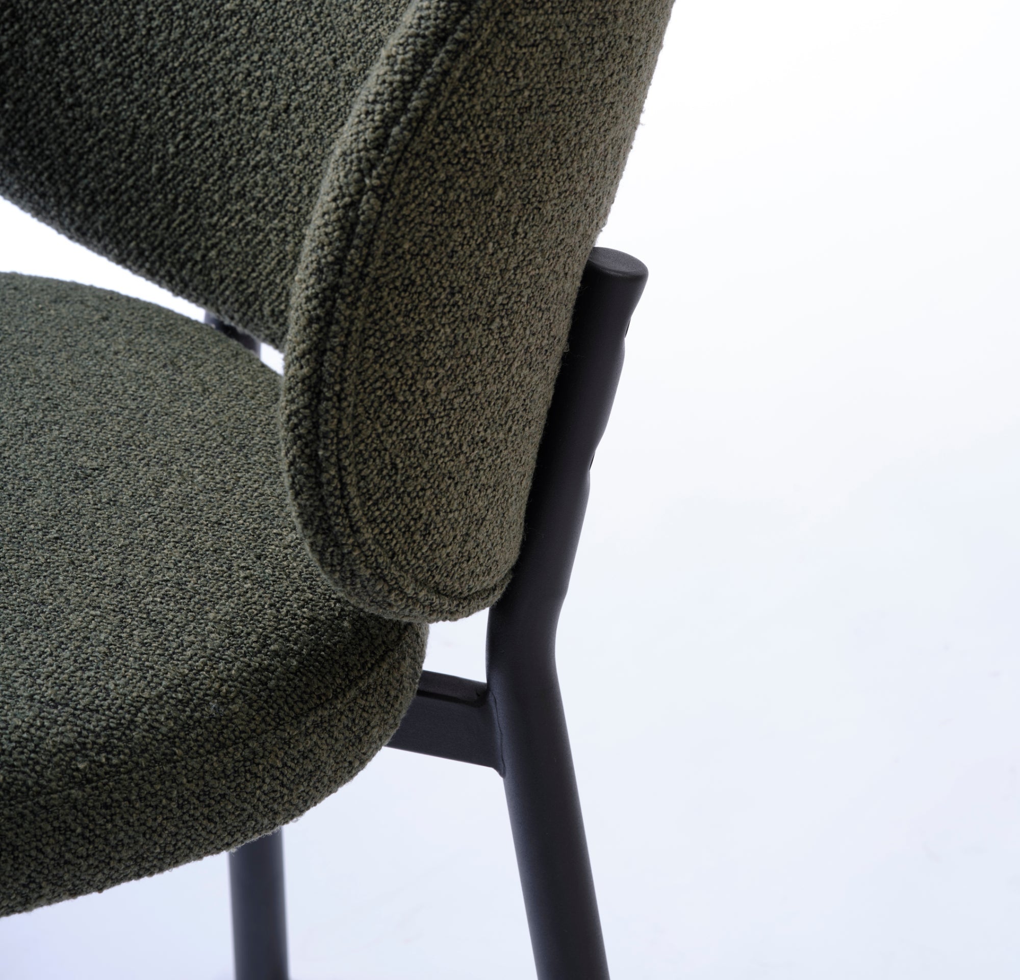 Azion, maar dan met een groene twist. De diepe groentint in bouclé voelt warm en uitnodigend, terwijl het zwarte metalen frame voor een grafisch accent zorgt. Rond, compact en verrassend comfortabel, Azion is de stoel die opvalt door z’n eenvoud én z’n lef.