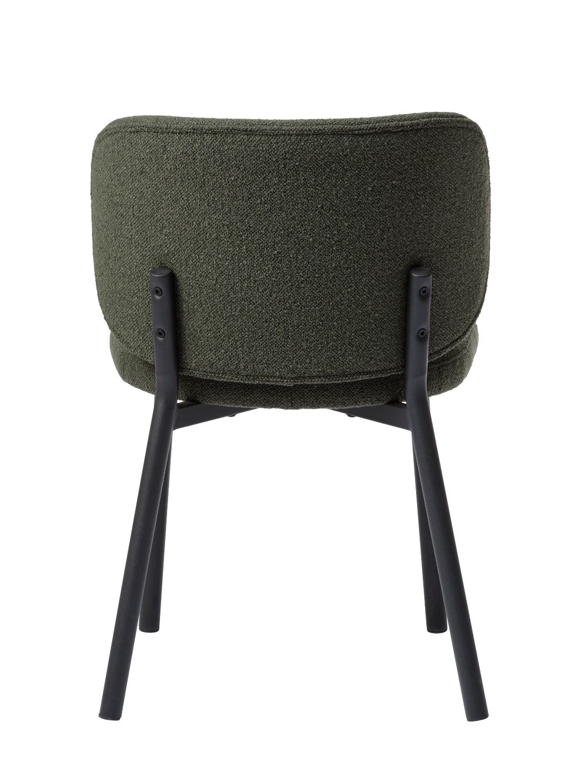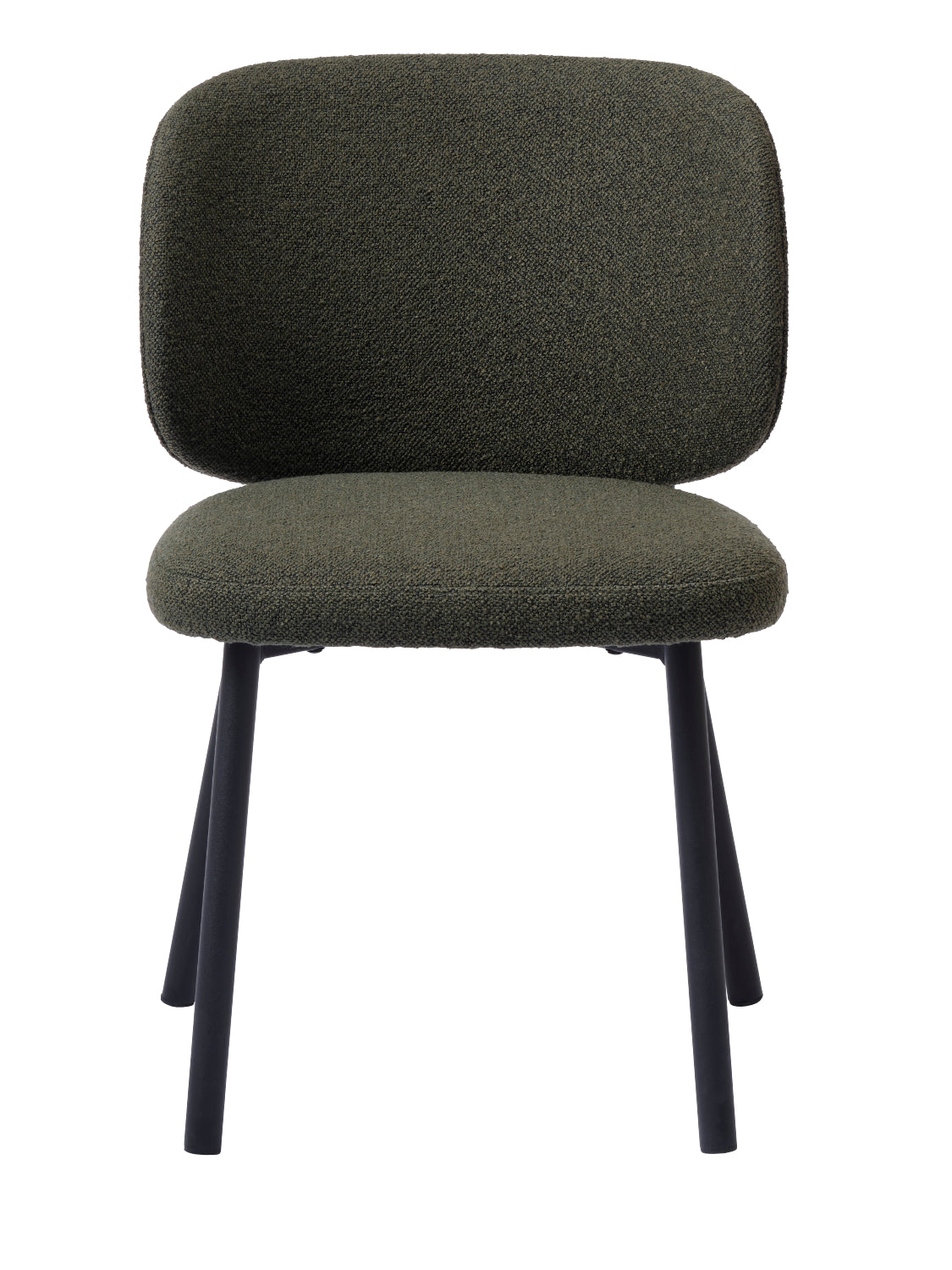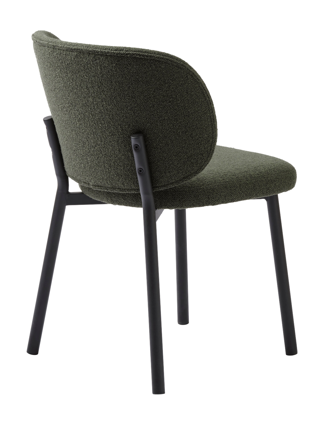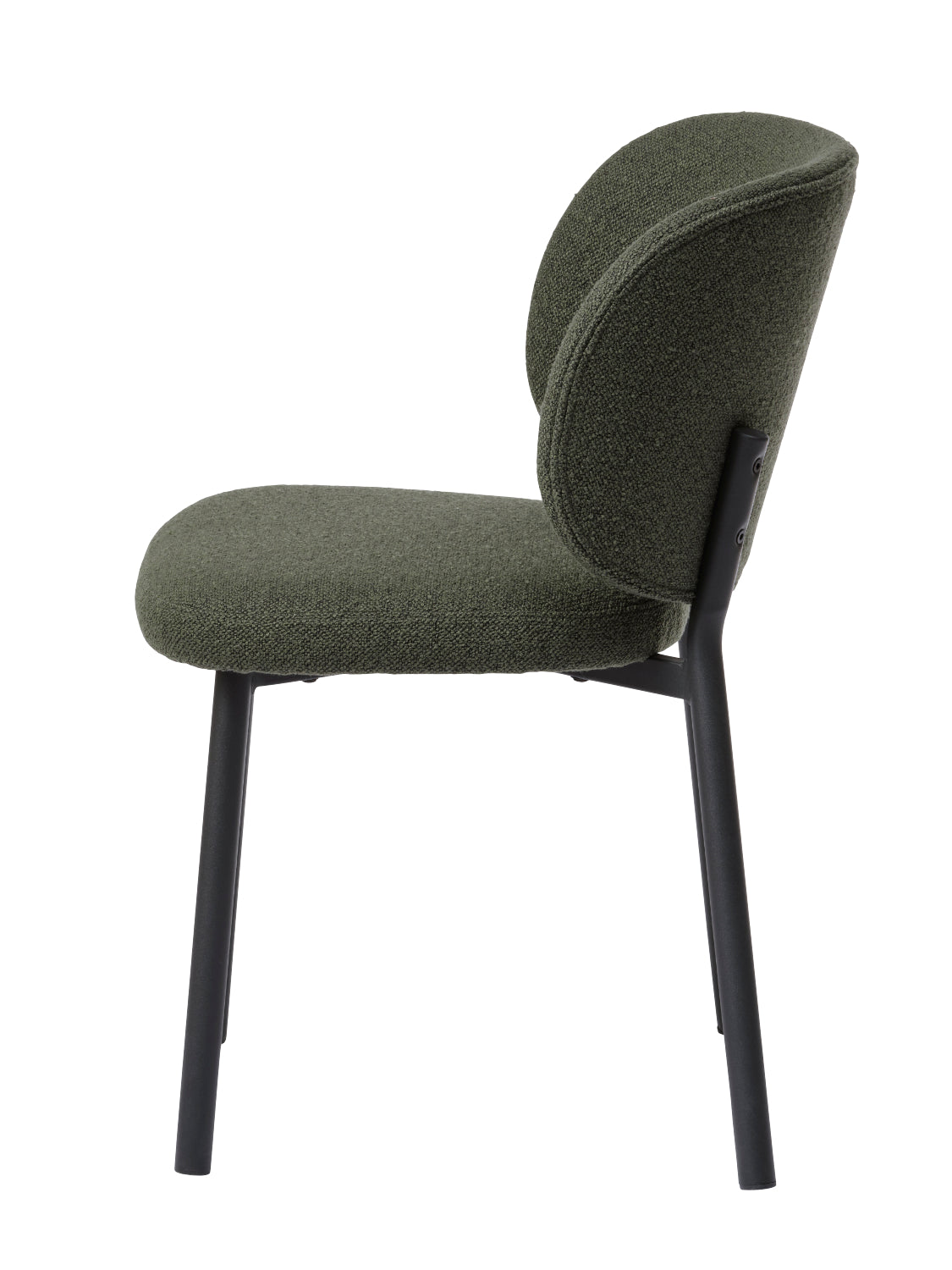 Azion, maar dan met een groene twist. De diepe groentint in bouclé voelt warm en uitnodigend, terwijl het zwarte metalen frame voor een grafisch accent zorgt. Rond, compact en verrassend comfortabel, Azion is de stoel die opvalt door z’n eenvoud én z’n lef.
