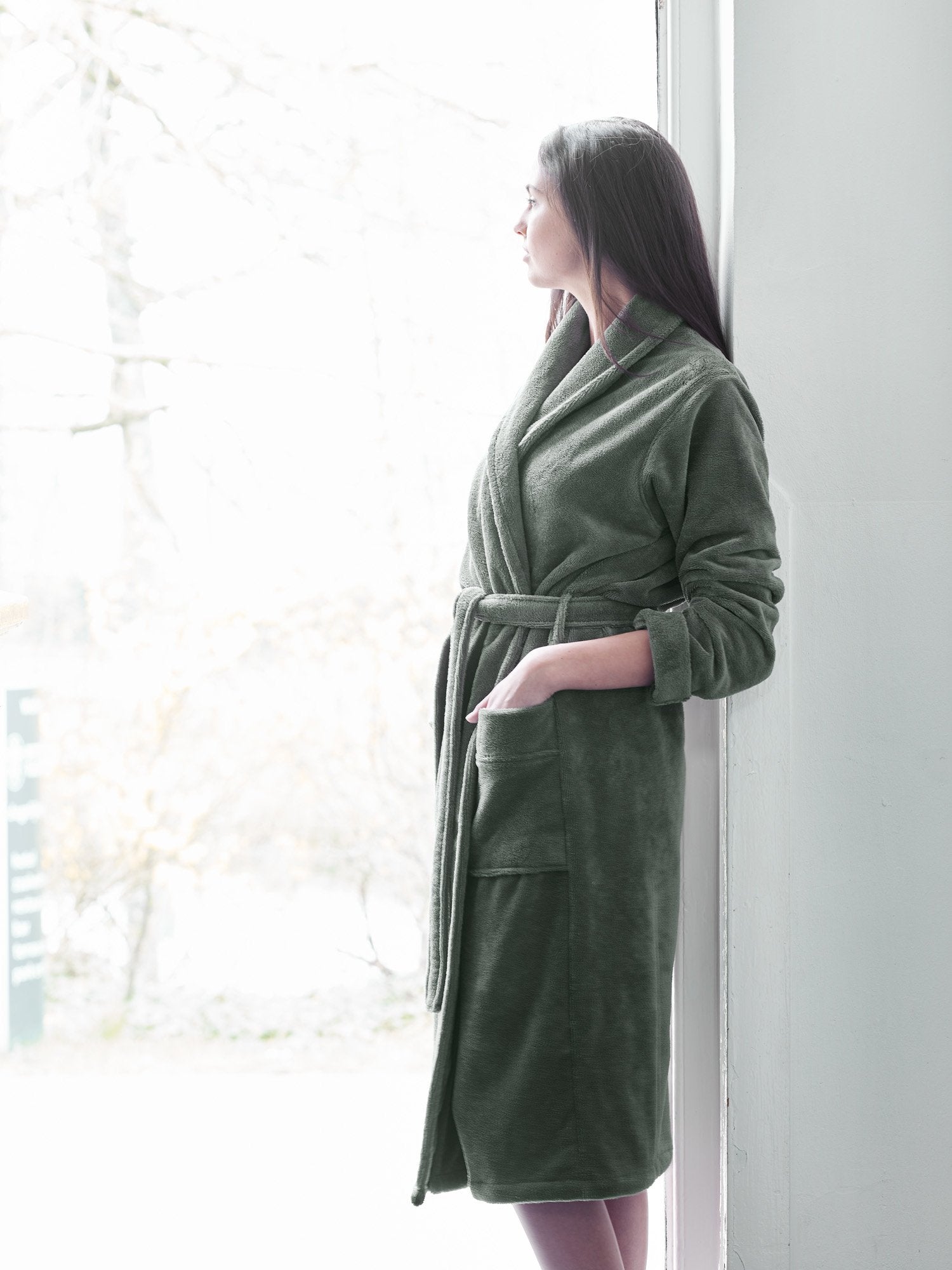 De EINAR badjas van Aquanova is een comfortabele badjas met een goede vochtopname door de bamboe binnenzijde. Bamboe neemt uitstekend vocht op door microgaatjes in de vezels en reguleert de lichaamstemperatuur beter dan andere stoffen. De badjas voelt heerlijk zacht aan de buitenzijde en heeft een mooie 'Regular Fit' pasvorm. Met diepe steekzakken, een ceintuur en mooie sjaalkraag kunt u uren doorbrengen in deze badjas. Einar badjas Artikelnummer: EINBG-269 Kleur Forest-269 (groen / donkergroen) Materiaalinformatie Binnenzijde: 60% bamboo en 40% katoen Buitenzijde: 100% polyester 330 gr/m² Wasvoorschriften De badjas is machine wasbaar op 40 graden Drogen op een lage stand Pasvorm Deze badjas heeft een 'Regular Fit', een ruime overslag, is niet getailleerd en heeft smalle mouwen.