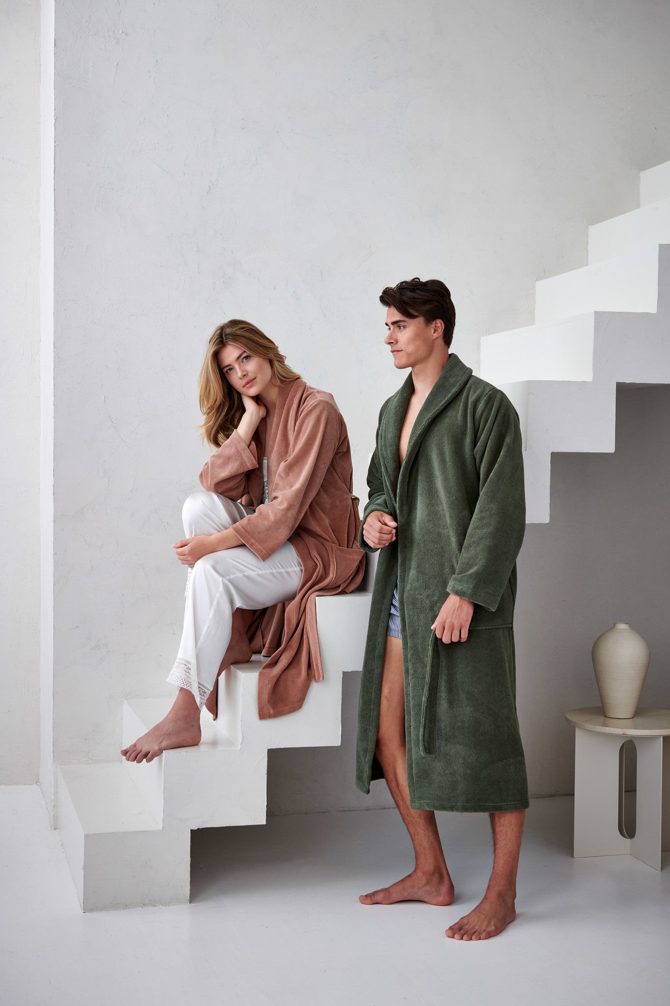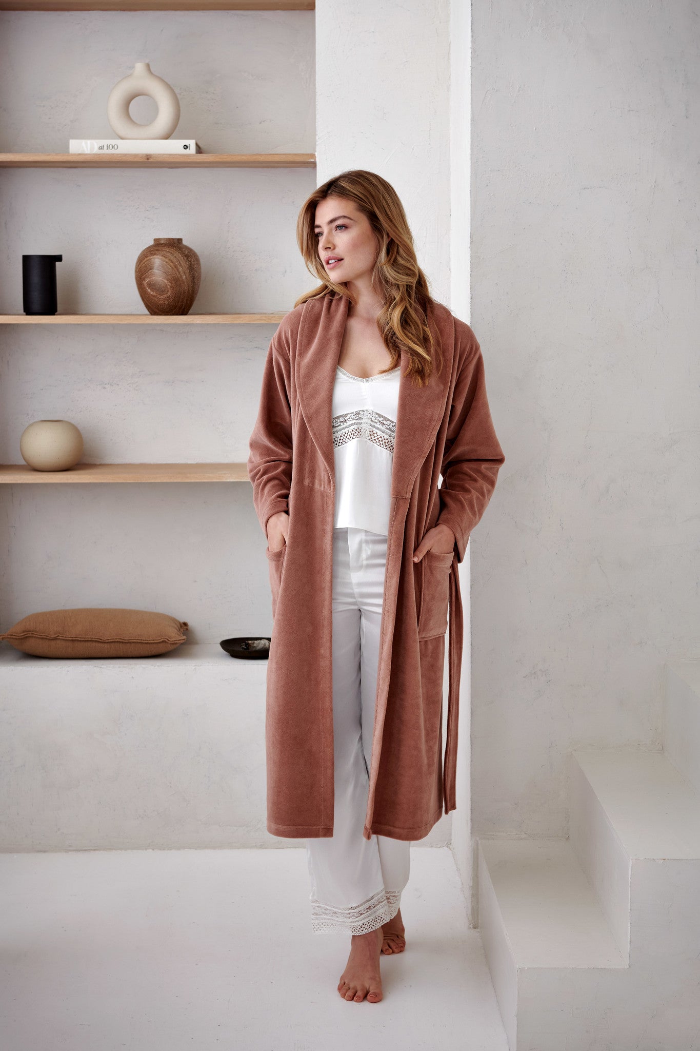 - Het is een lange badjas met een lengte tot ruim onder de knie.