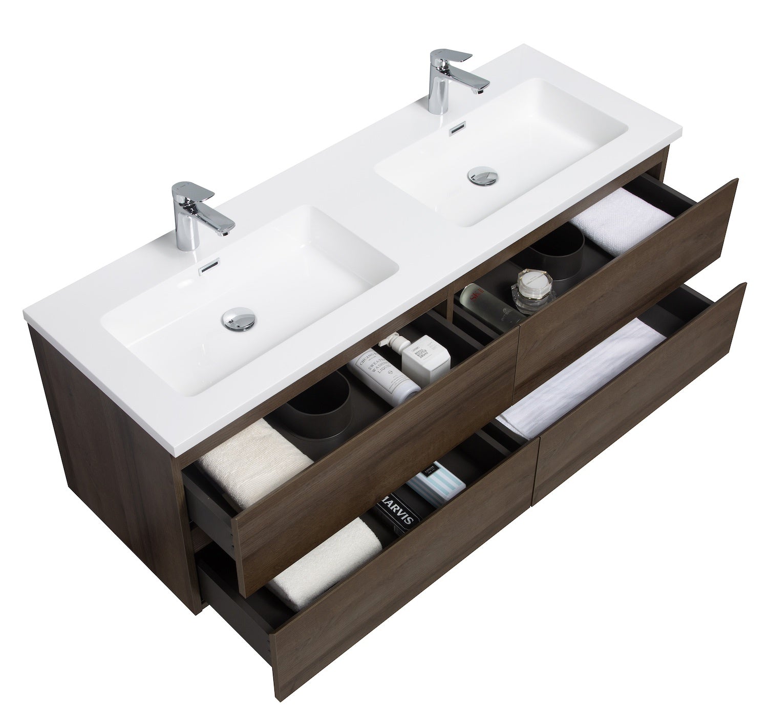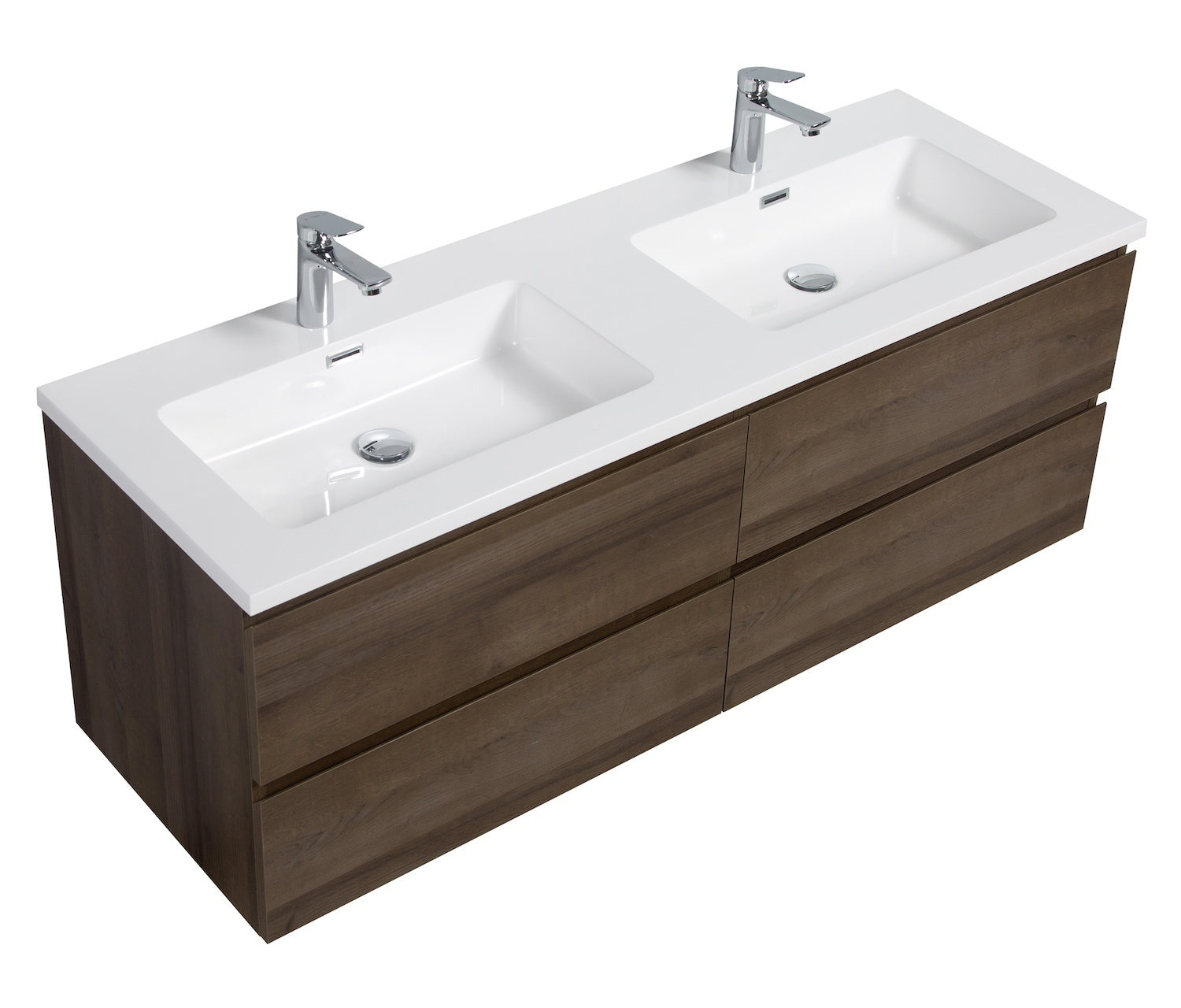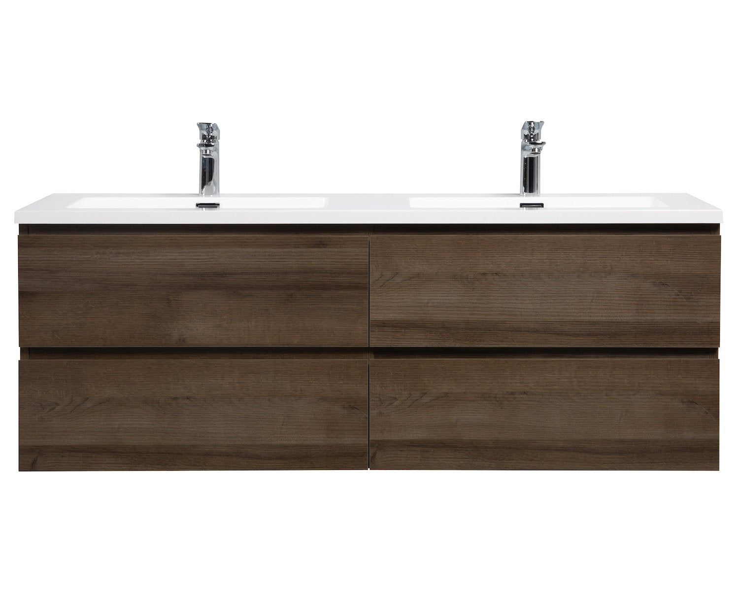 Badkamermeubel set Angela inclusief onderkast en dubbele wastafel. De onderkast is uitgevoerd met vier lades met soft close sluiting. De wastafel is gemaakt van kunstmarmer, de wastafelkast is uitgevoerd in een bruin eiken kleur. De onderkast is al gemonteerd en met soft close afgesteld. Inclusief afvoerplug voor de wastafel. Afmetingen Onderkast met wastafel: 140 x 48 x 52 cm Kenmerken - Wastafelkast gemaakt van MDF - Vier lades met een uitsparing in de bovenste lades voor de afvoer - De muurzijde is deels open voor het aansluiten van een afvoer - Uitsparing van 6 cm onderaan de achterzijde van de wastafelkast - Volledig gemonteerd verpakt - Inclusief montagemateriaal - Geïntegreerde overloop in de wastafel Verpakking en montage Badkamermeubel Angela zit kant en klaar verpakt in twee dozen. Bevestigingsmateriaal voor het ophangen van de kast is inbegrepen, evenals een handleiding. De wastafel zit samen met de afvoerplug apart verpakt.