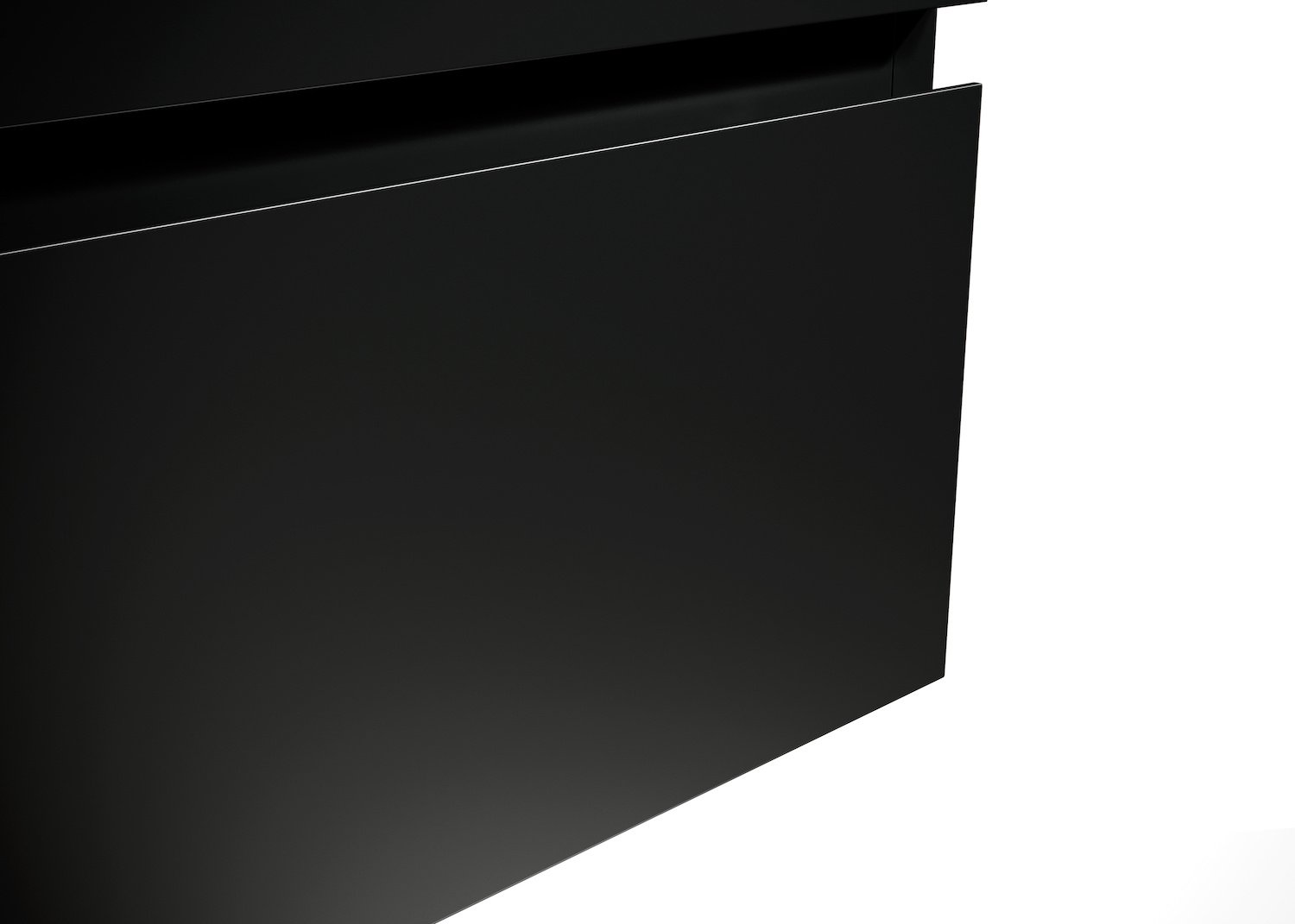 Badkamermeubel set Angela inclusief onderkast en zwarte dubbele wastafel. De onderkast is uitgevoerd met vier lades met soft close sluiting. De wastafel is gemaakt van kunstmarmer, de wastafelkast is uitgevoerd in mat zwart. De onderkast is al gemonteerd en met soft close afgesteld. Inclusief afvoerplug voor de wastafel. Afmetingen Onderkast met wastafel: 140 x 48 x 52 cm Kenmerken - Wastafelkast gemaakt van MDF - Vier lades met een uitsparing in de bovenste lades voor de afvoer - De muurzijde is deels open voor het aansluiten van een afvoer - Uitsparing van 6 cm onderaan de achterzijde van de wastafelkast - Volledig gemonteerd verpakt - Inclusief montagemateriaal - Geïntegreerde overloop in de wastafel Verpakking en montage Badkamermeubel Angela zit kant en klaar verpakt in twee dozen. Bevestigingsmateriaal voor het ophangen van de kast is inbegrepen, evenals een handleiding. De wastafel zit samen met de afvoerplug apart verpakt.