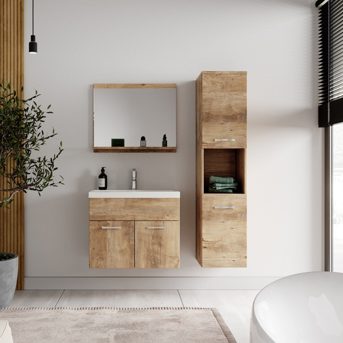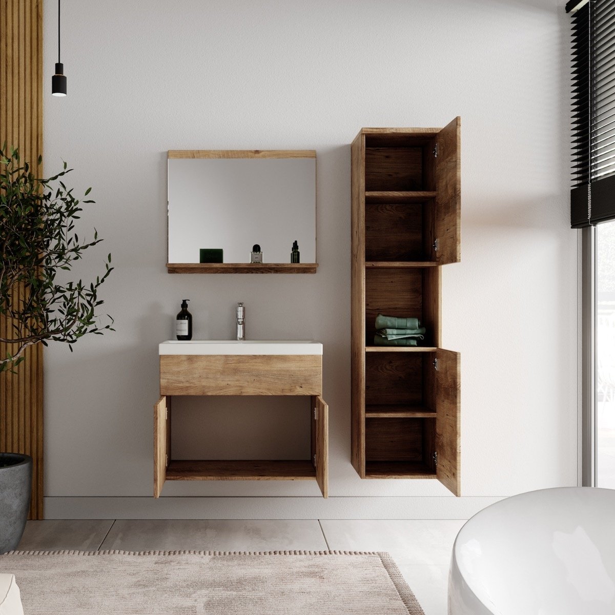 Badkamermeubel set Montreal inclusief wastafel en spiegel en kolomkast. Deze set geeft iedere badkamer, groot of klein, extra bergruimte en een moderne en luxe uitstraling. De deuren van de kolomkast kunnen tijdens montage linksdraaiend of rechtsdraaiend geplaatst worden. Vanwege zijn strakke afwerking is het meubel gemakkelijk schoon te maken. De set is uitgevoerd in kastanje eiken en is gemakkelijk te monteren. De kast is gemaakt van spaanplaat en de wastafel van kunstmarmer. Afmetingen (b x d x h) Onderkast met wastafel: 60 x 35 x 51 cm Spiegel: 60 x 12 x 50 cm Badkamerkast: 30 x 30 x 131 cm Kenmerken - De wastafelkast en kolomkast uitgevoerd met twee deuren - Het badkamermeubel is aan de muurzijde volledig open voor het aansluiten van de afvoer - De onderkant is volledig gesloten - Geen afvoerplug, sifon of kraan inbegrepen - Inclusief overloop set - Zonder soft close sluiting Verpakking en montage Badkamermeubel Montreal is verpakt in twee dozen. Bevestigingsmateriaal voor het ophangen van de verschillende delen is inbegrepen.