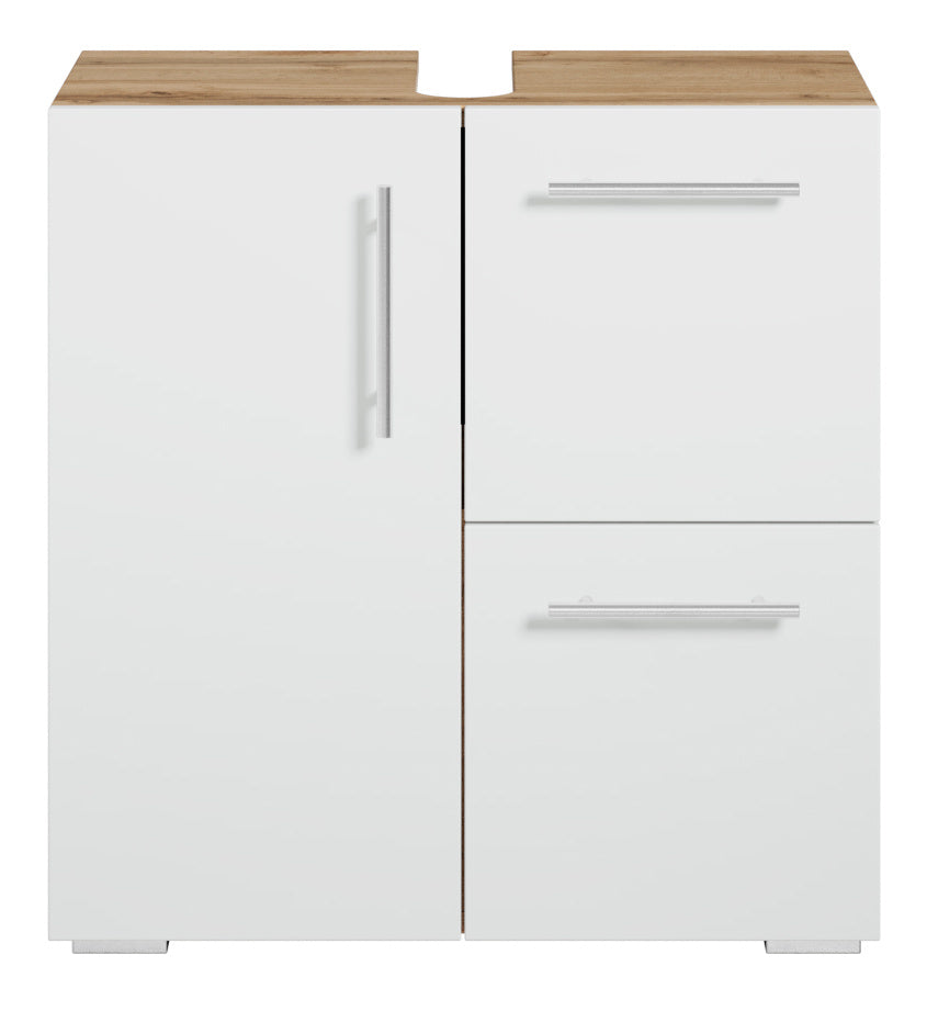 Wastafelkast Mars is een badkamerkast voor onder een hangende wastafel. Deze wastafelkast is bedoeld om iedere badkamer van extra bergruimte te voorzien en een moderne en luxe uitstraling te geven. De wastafelkast is gemaakt van hoge kwaliteit spaanplaat en vanwege zijn strakke afwerking ook makkelijk schoon te maken. Uitgevoerd in eiken met wit. Afmetingen wastafelkast: - Wastafelkast: 60 x 30 x 60cm - Breedte uitsparing bovenblad: 8 cm - Diepte uitsparing bovenblad: 25 cm - Diepte tot afronding/versmalling (bruikbare ruimte): 21,5 cm Kenmerken: - Wastafelkast om onder een wastafel te plaatsen - Twee deuren en een lade - Veel bergruimte - Brede uitsparing aan de bovenzijde voor het aansluiten van een afvoer - Gemakkelijk te monteren - Inclusief montagemateriaal - Gemaakt van hoogwaardige kwaliteit spaanplaat met fineerlaag - Soft-close sluiting is niet inbegrepen Verpakking en montage Deze wastafelkast wordt geleverd in één doos met uitgebreide montagehandleiding en alle benodige montagematerialen. De achterzijde van de kast is gedeeltelijk open.