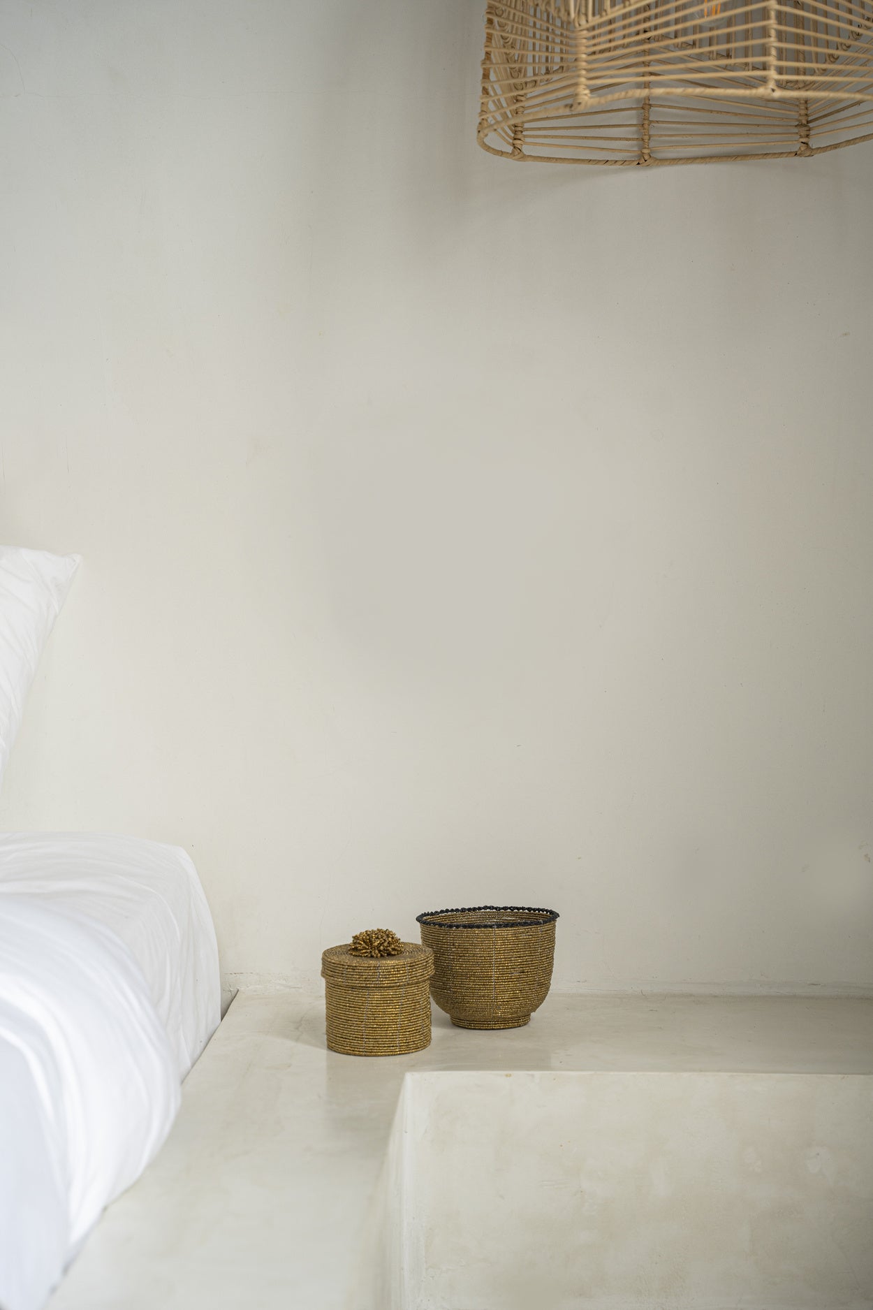 Word verliefd op onze delicate handgemaakte kralenmand die een prachtige esthetiek heeft die elke hoek van het huis zal verfraaien, hetzij in een slaapkamer, badkamer, dressing of woonkamer. Of plaats ze gewoon op een plank als een mooi boho chic decoratief item. Met deze manden kunt u gemakkelijk toiletartikelen, make-up of kleine dingen en bobs opbergen in elke kamer. Een echte eye-catcher voor uw interieur!