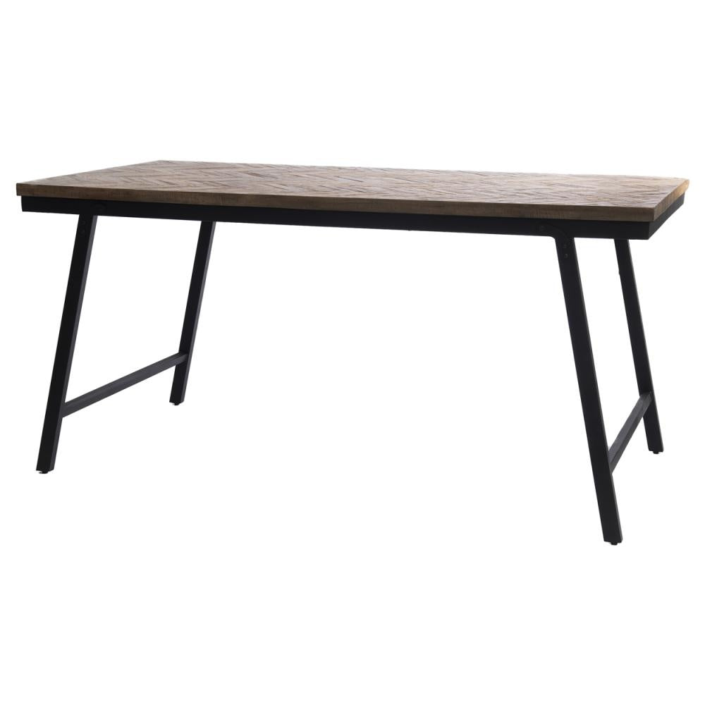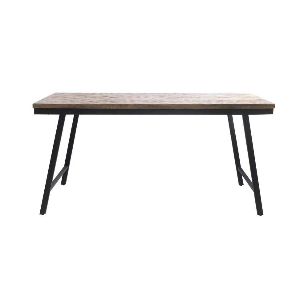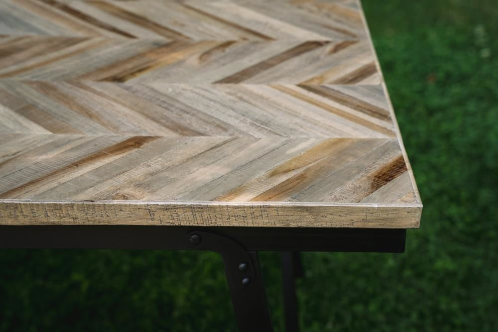 Deze hoogwaardige tafel is gemaakt van teakhout (in een zeer elegant visgraatpatroon) en zwart ijzer. De tafel is inklapbaar en heeft de ideale hoogte om te dienen als uw familie-eettafel, zowel binnen als overdekt buiten. Er zijn twee maten beschikbaar en deze tafel is ook verkrijgbaar in naturel. Combineer ze met onze visgraatbanken om de complete look te shoppen.